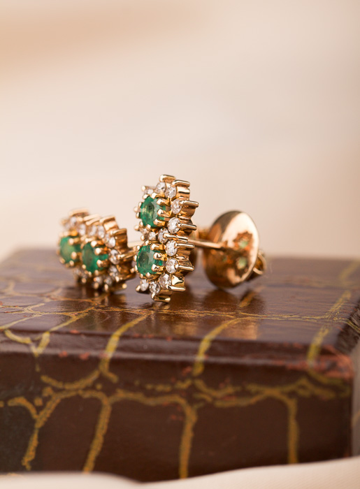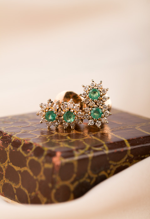 14 K guld, Smaragder 4 st ca 3,3 mm. Briljantslipade diamanter 36 x 0,02 ct