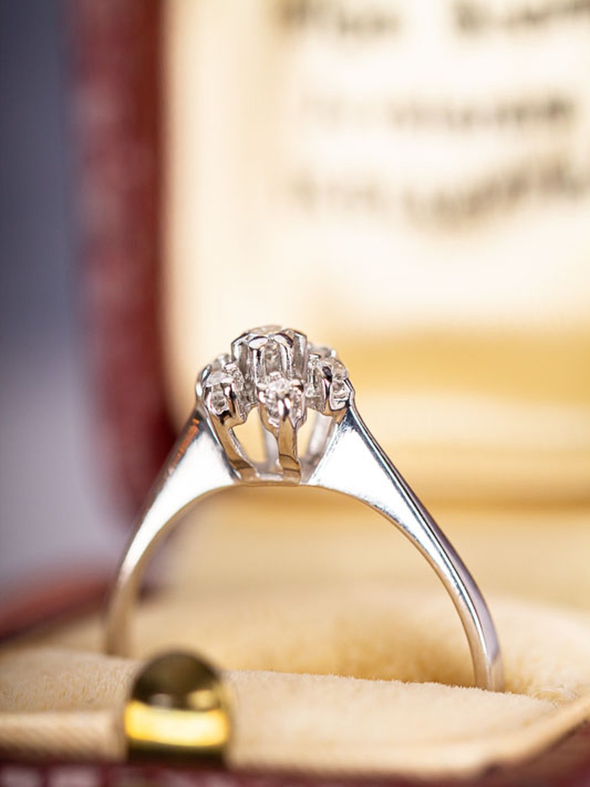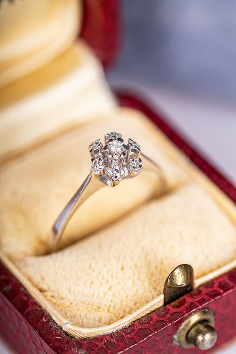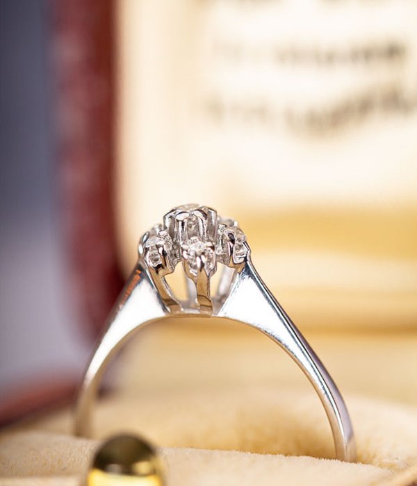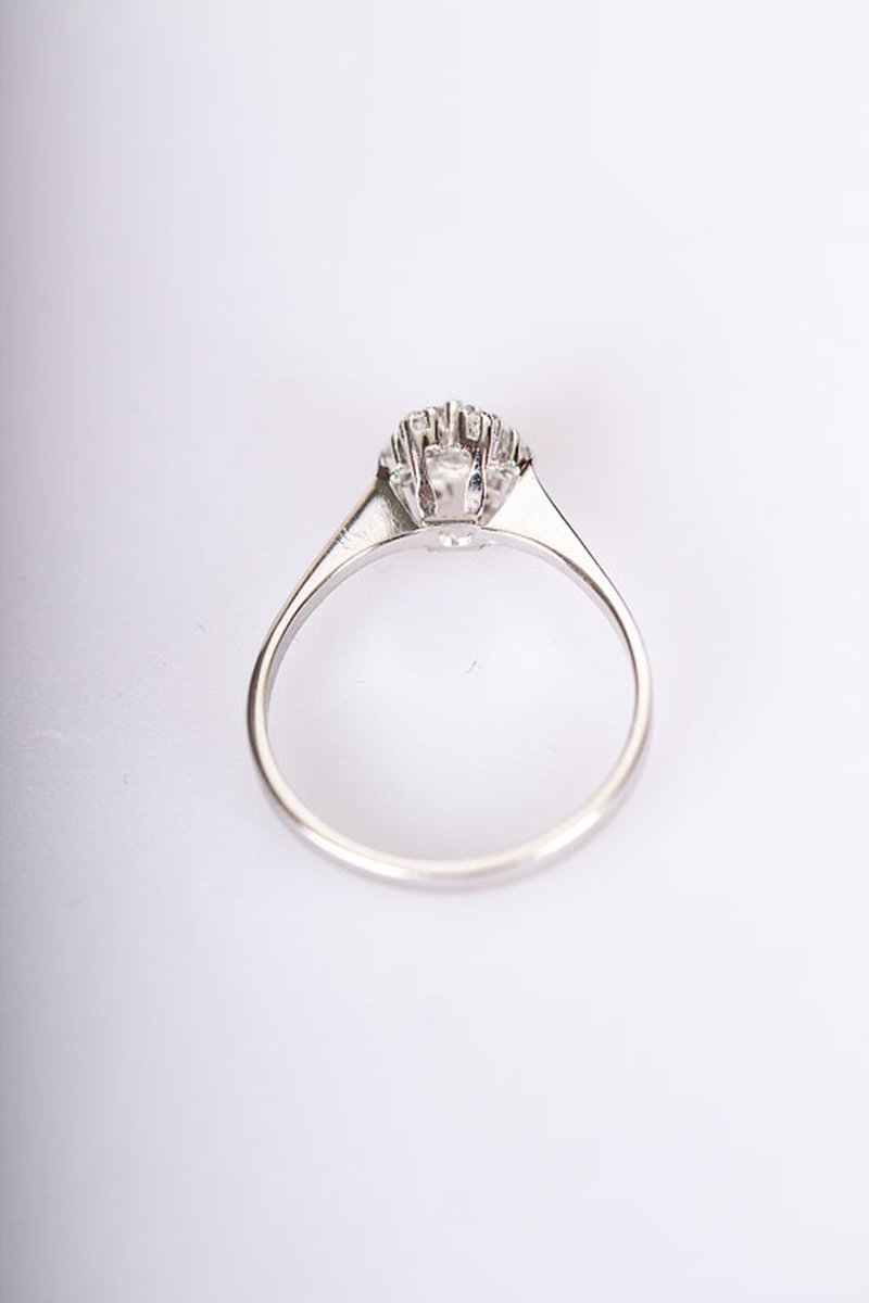 Vacker rosettring med diamanter tillverkad i 18k vitguld. Totalt 0,16ct diamanter. Går att storleks ändra.
