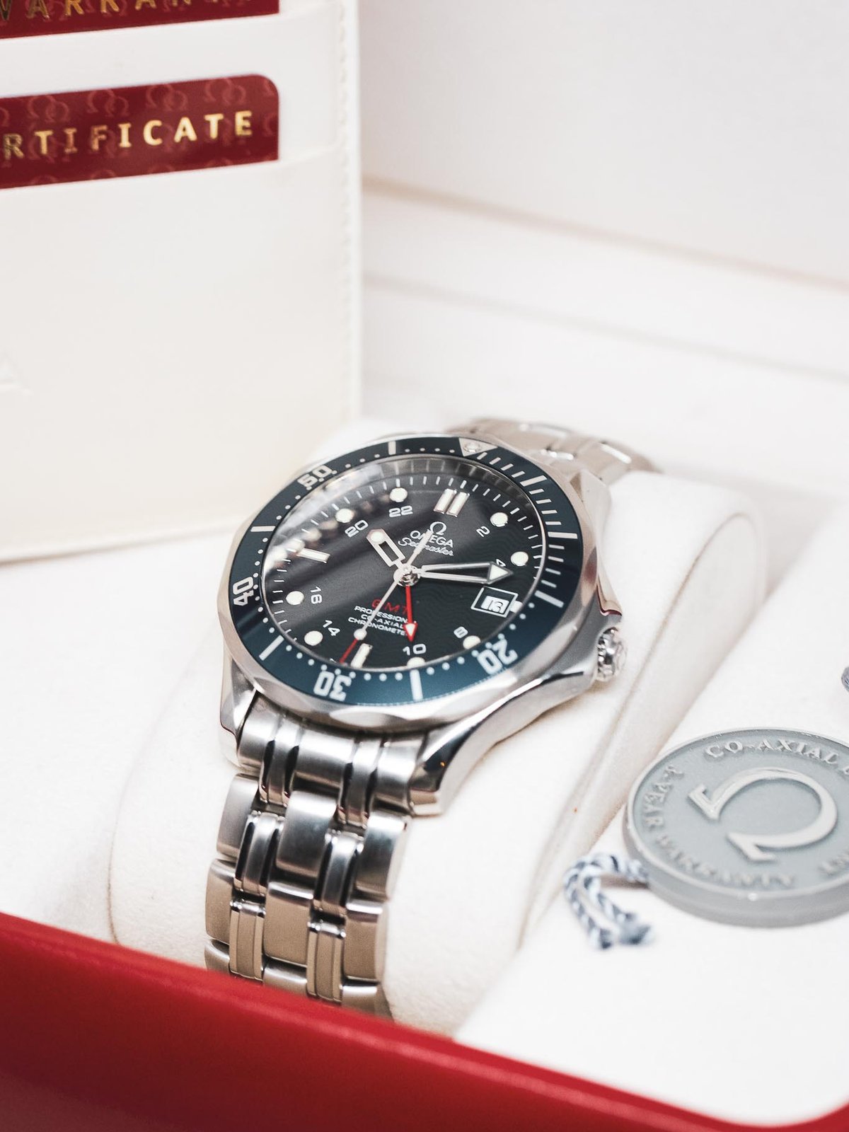 Omega Seamaster GMT i mycket bra skick. Den sista referensen med den ursprungliga vågtavlan i blått. Modellen blev ikonisk som klockan James Bond bar i många filmer. Denna referens känner vi igen från filmen Casion Royal. Kommer med låda och papper.