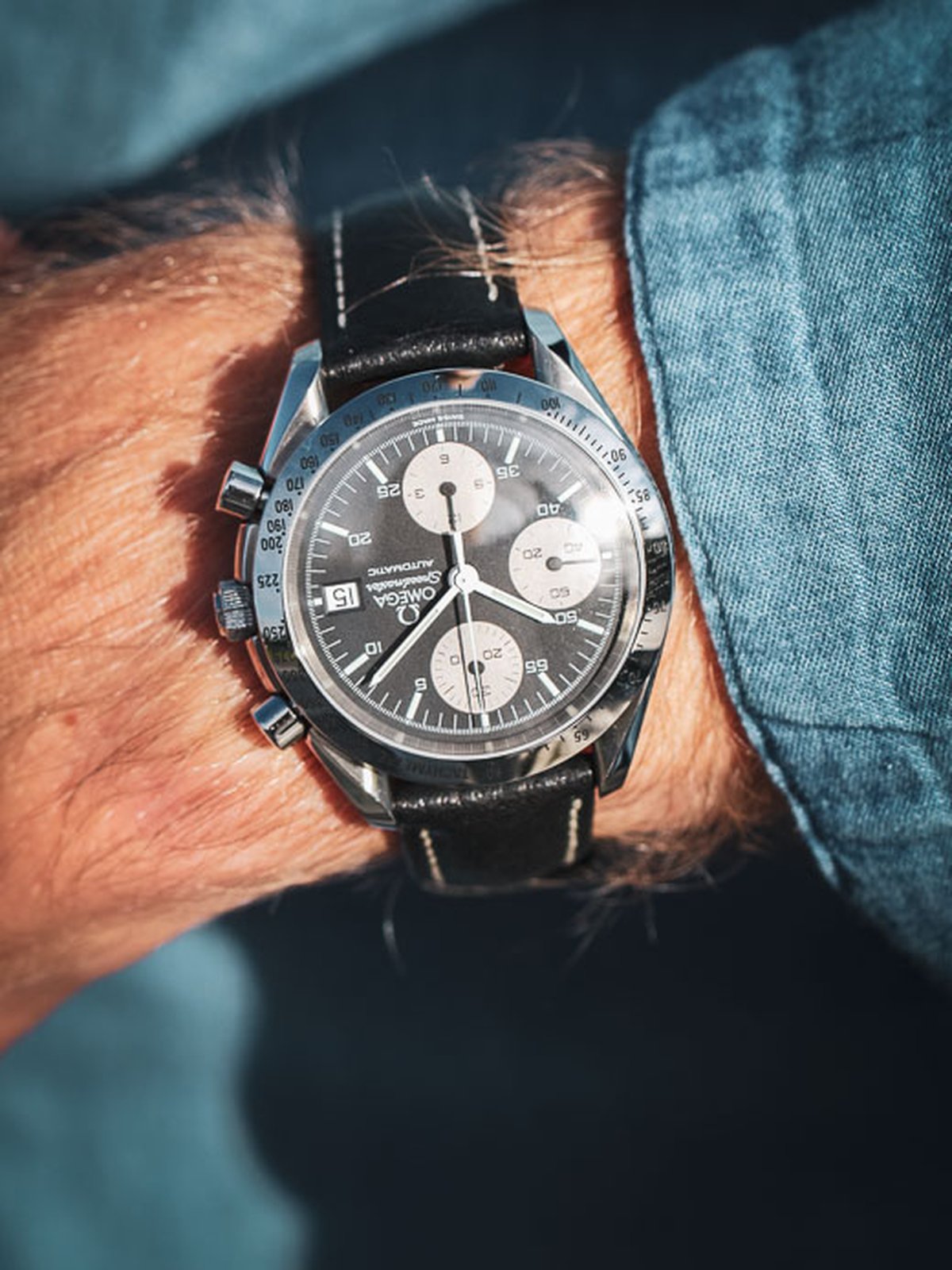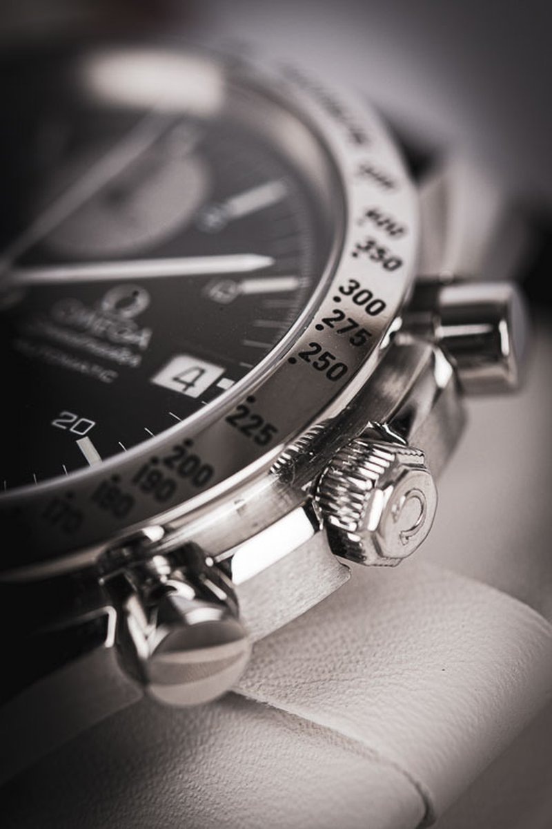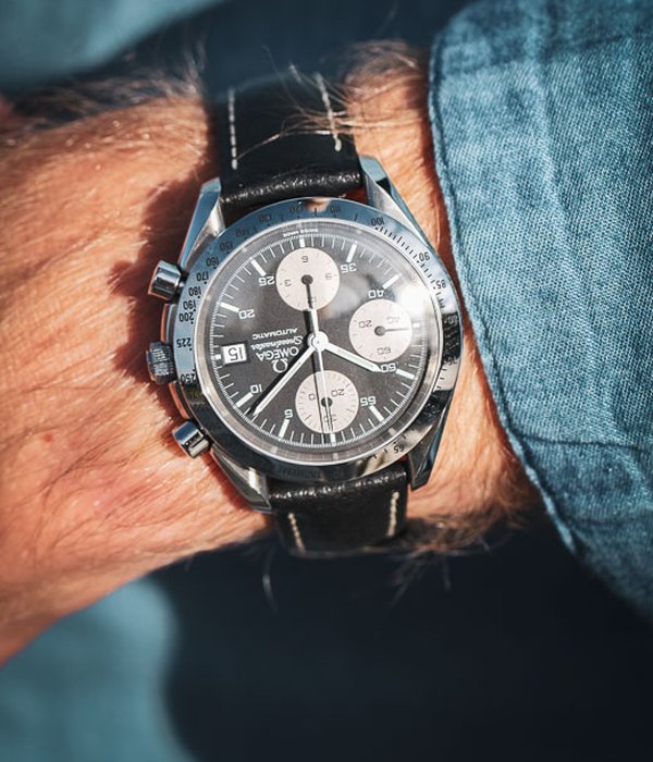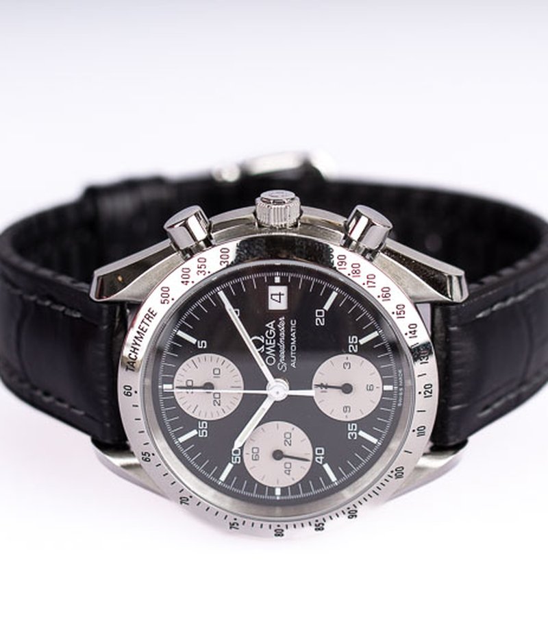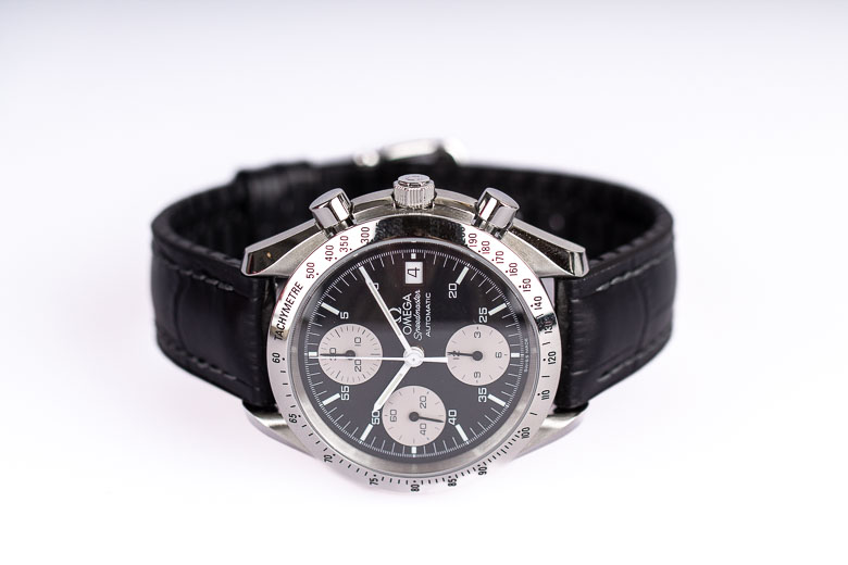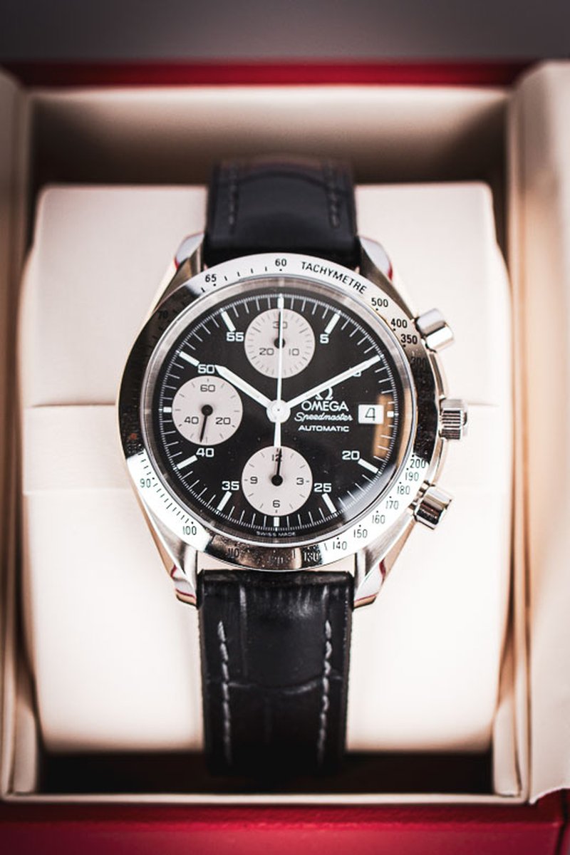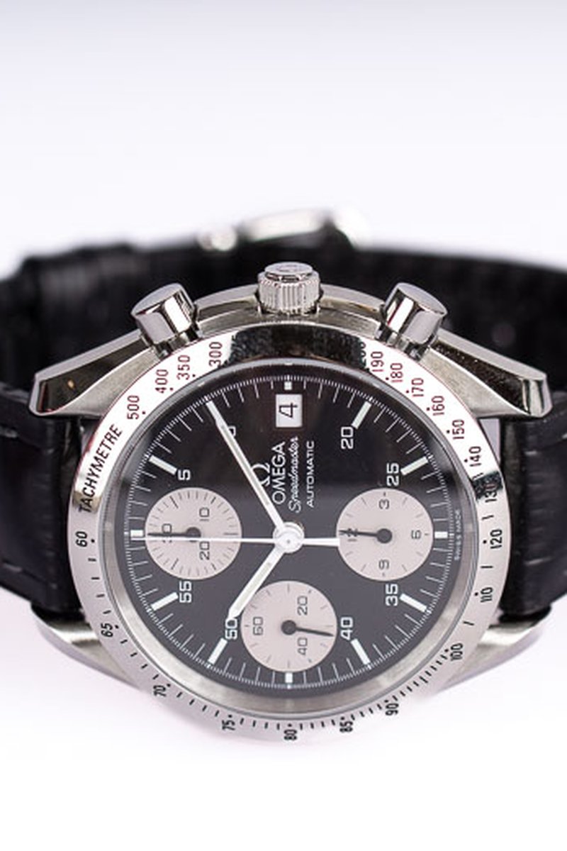 Klassisk Omega Speedmaster Date reversed panda i härliga 39mm. Bezeln med takometerskala är blankpolerad, ger en magisk lyster och får klockan att upplevas större på handleden. På urtavlan ser vi några drag som får denna modell att särskilja sig från hans välkända bror, moonwatchen. Datumrutan sitter klockan tre och trion med kronografkomplikationerna sitter vertikalt och närmare kanten av urtavlan. De smala, pennformade, vita visarna ger en klar syn över både minut- och timvisare. Det automatiska verket som driver denna pärla är Omegas Caliber 1155 som baseras på Valjoux/ETA 7750. Klockan kommer med läderband (ej original) och Omegas egna servicebox.