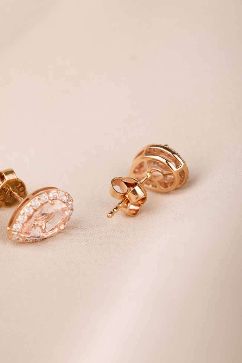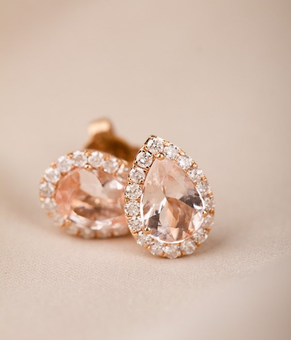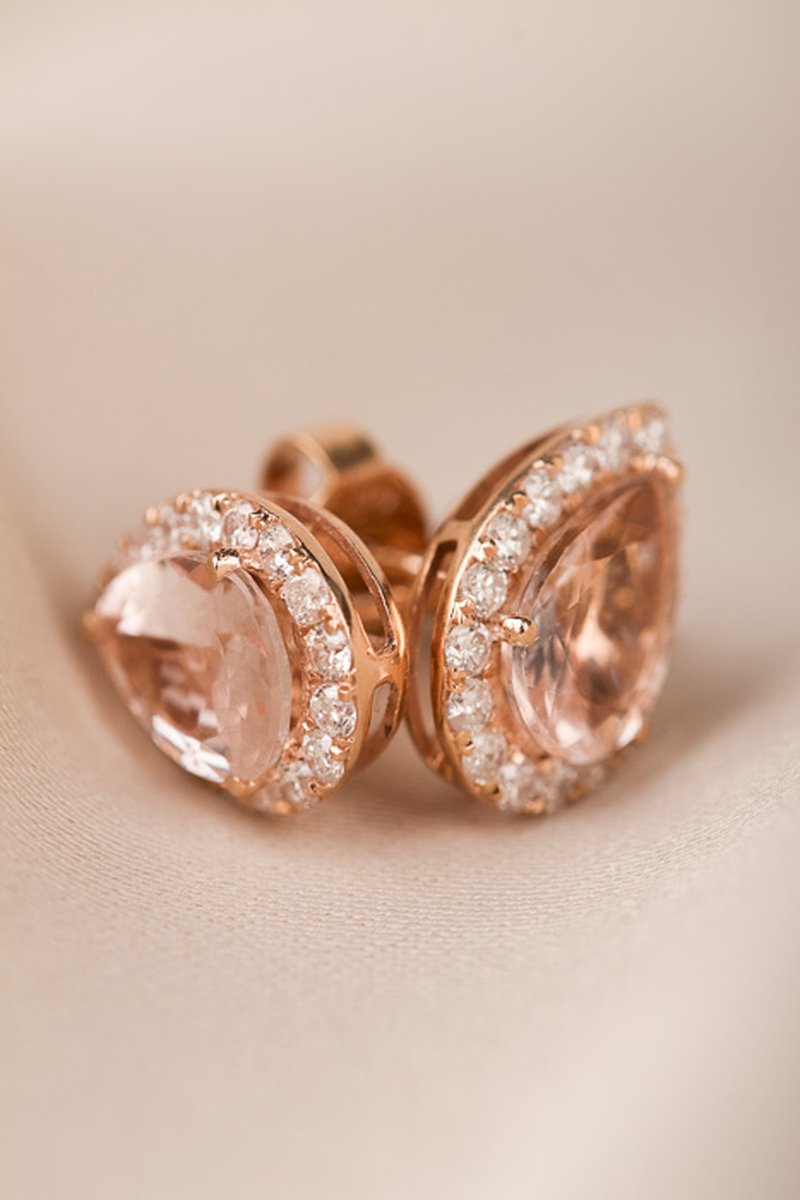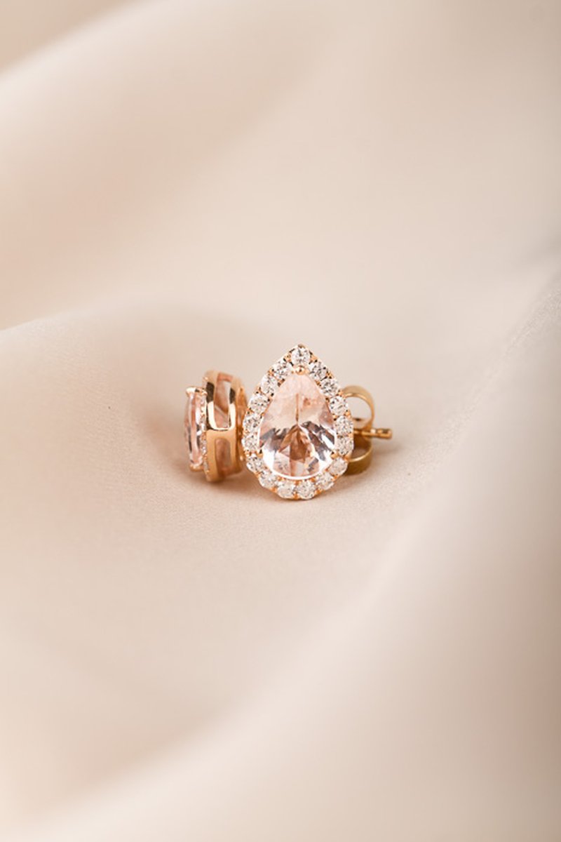 18K roséguld, droppslipade morganiter 8,5 x 6 mm. 36 x 0,01 ct briljantslipade diamanter