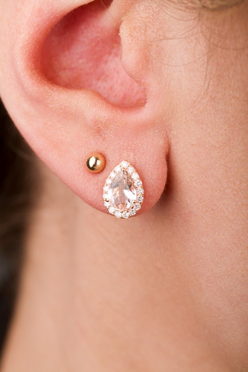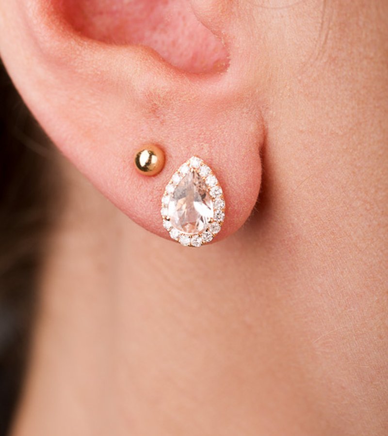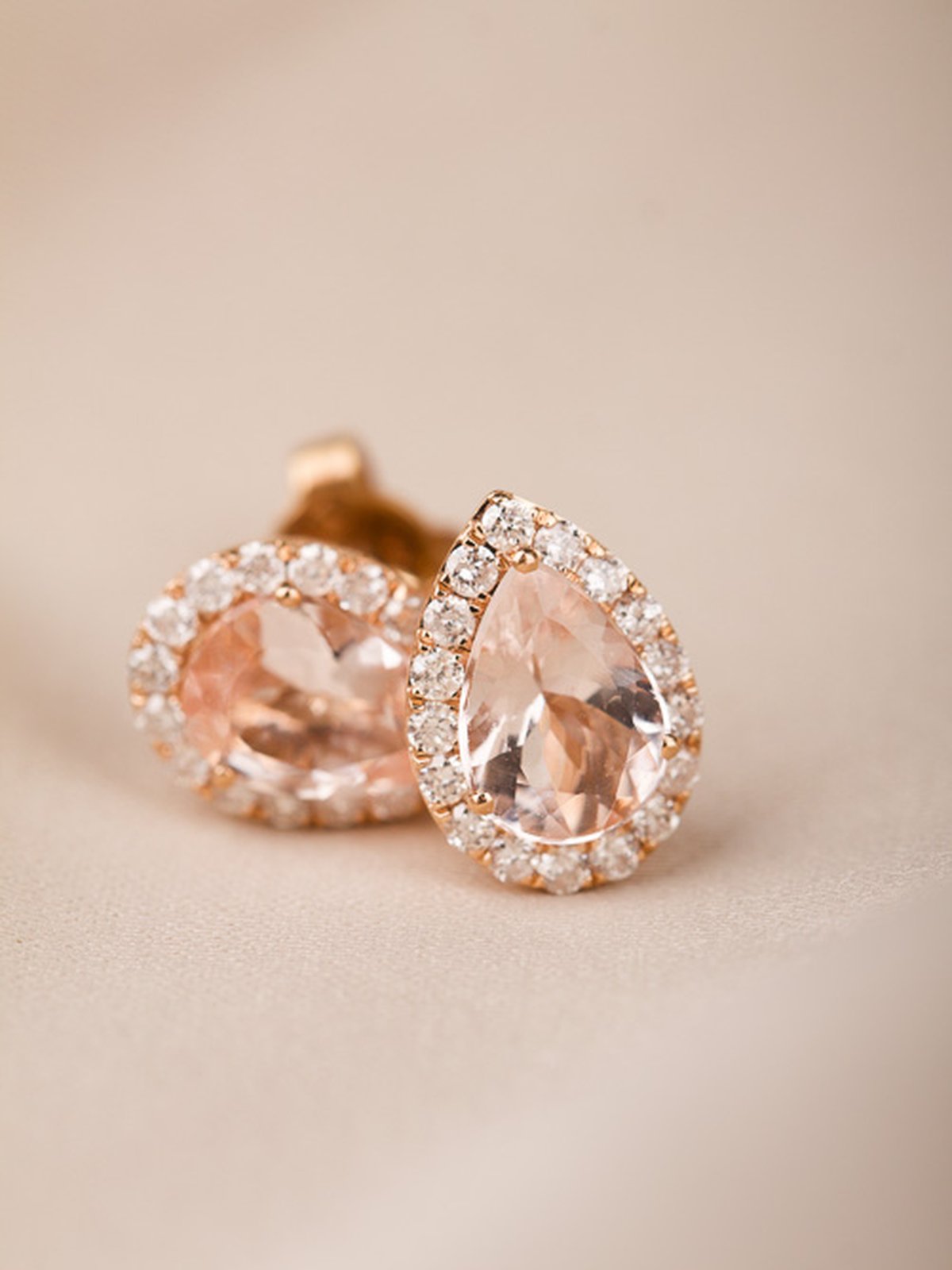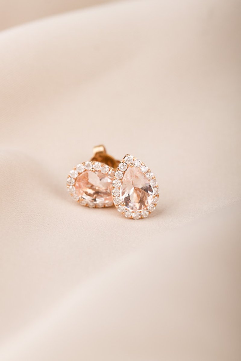 18K roséguld, droppslipade morganiter 8,5 x 6 mm. 36 x 0,01 ct briljantslipade diamanter