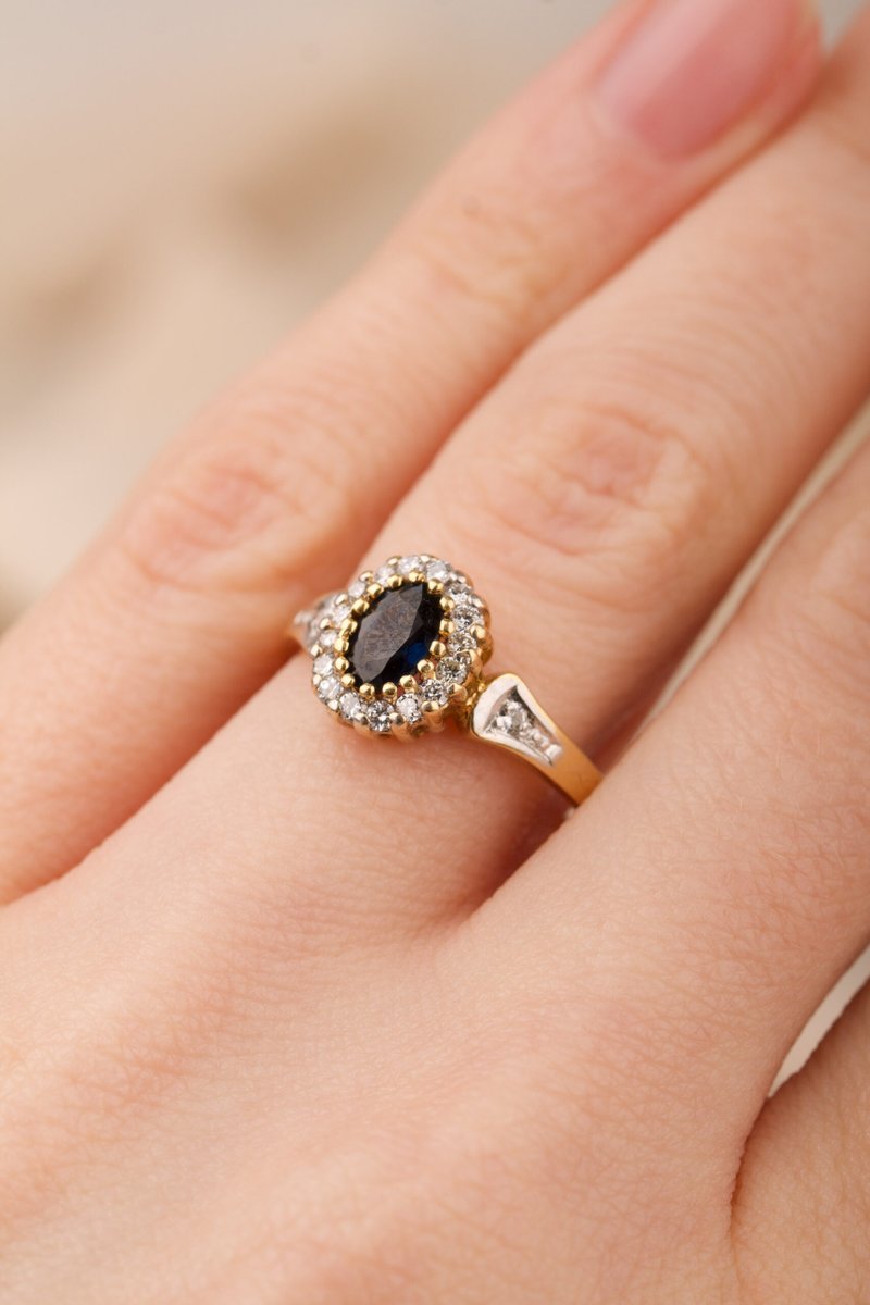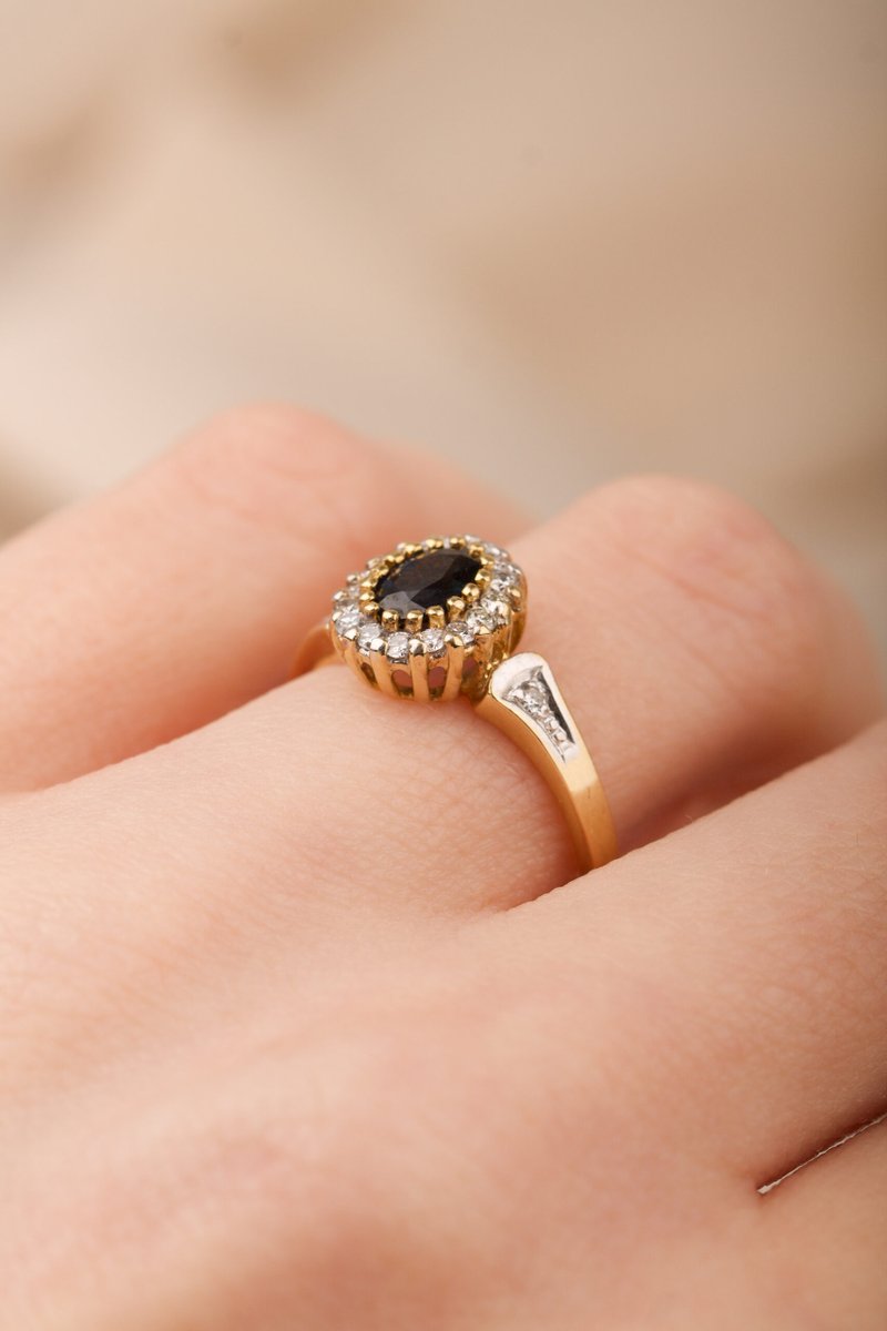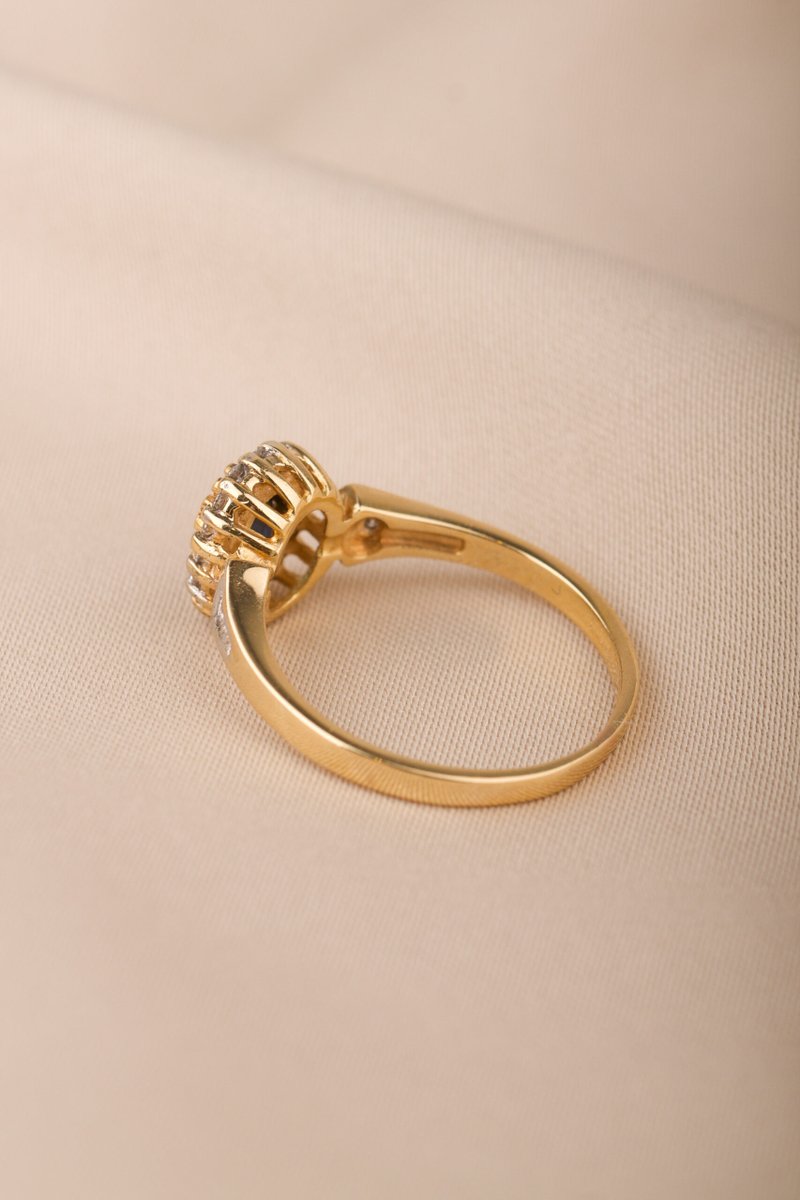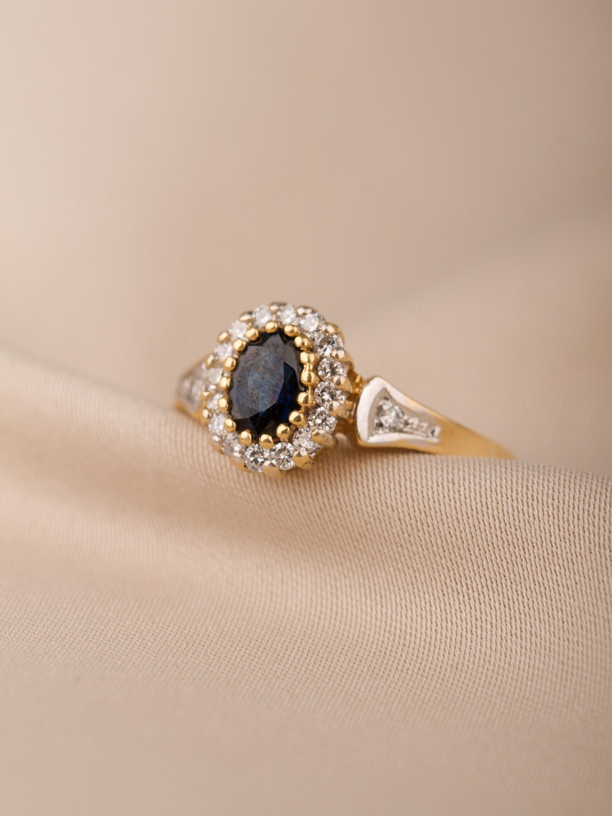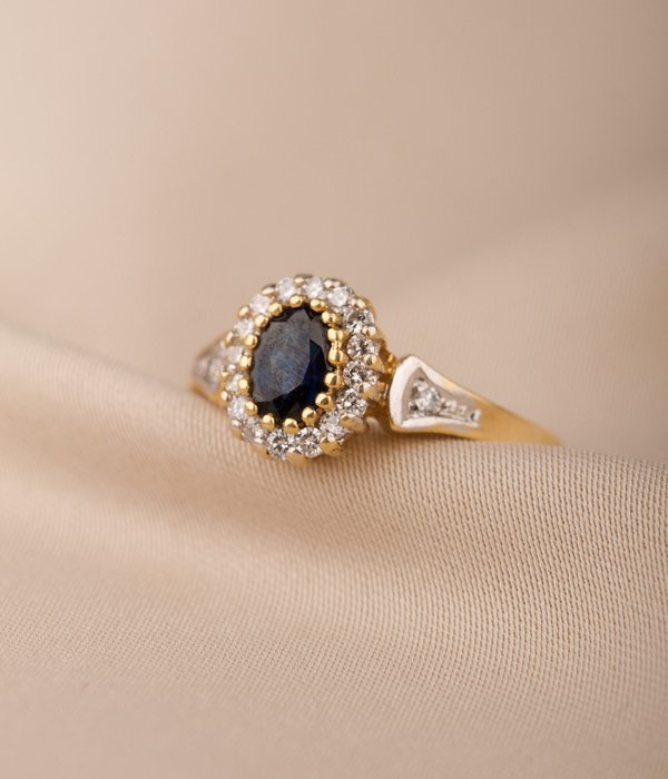 18K guld, 18 x ca. 0,01 ct diamanter, safir 4 x 5,8 mm