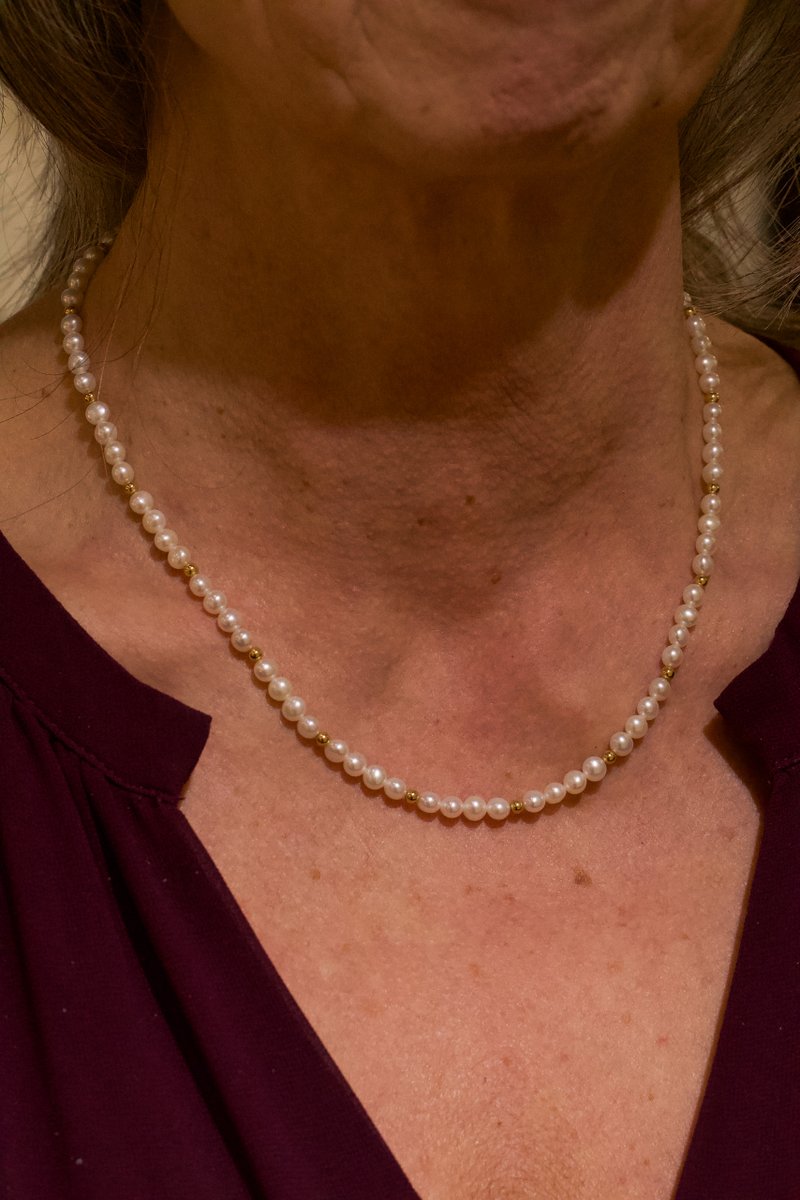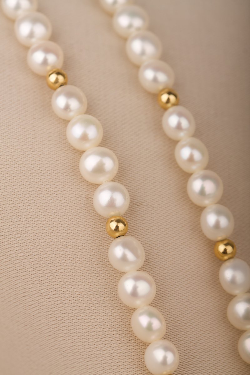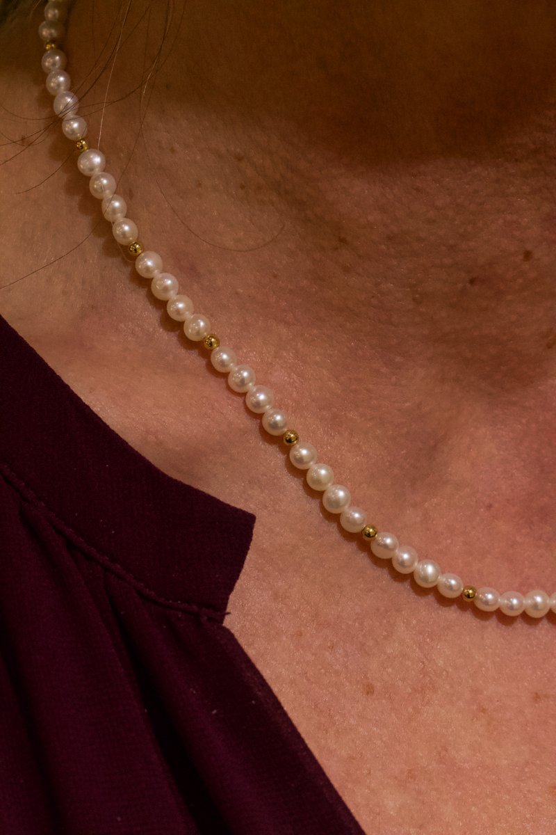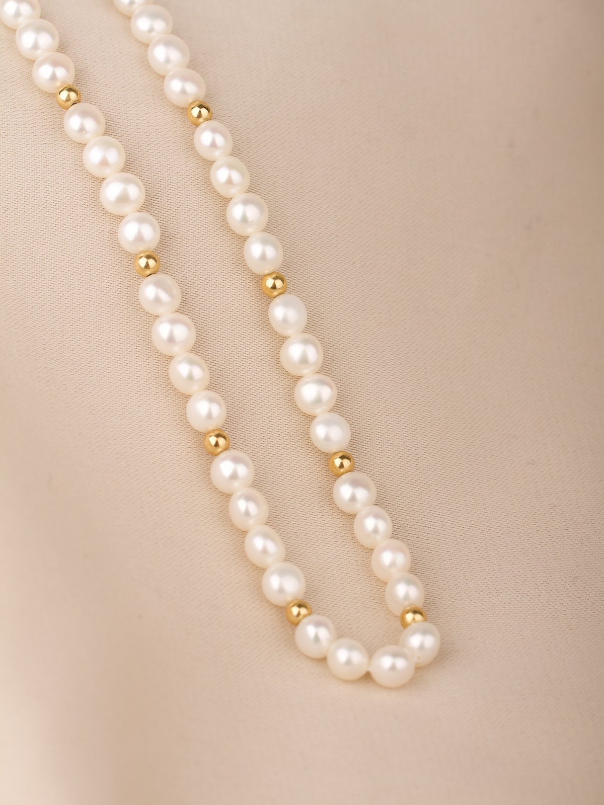 Fint pärlcollier med lätt oregelbundna pärlor blandat med guldkulor. Halsbandet har en sirligt fint guldlås.