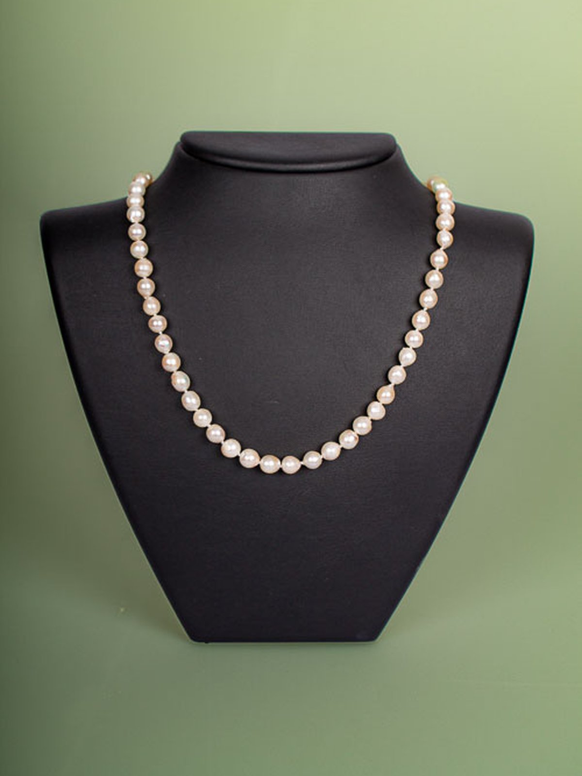 Pärlcollier förvaras bäst liggandes på en mjuk yta, dock inte av bomull. Detta torkar ur pärlorna.