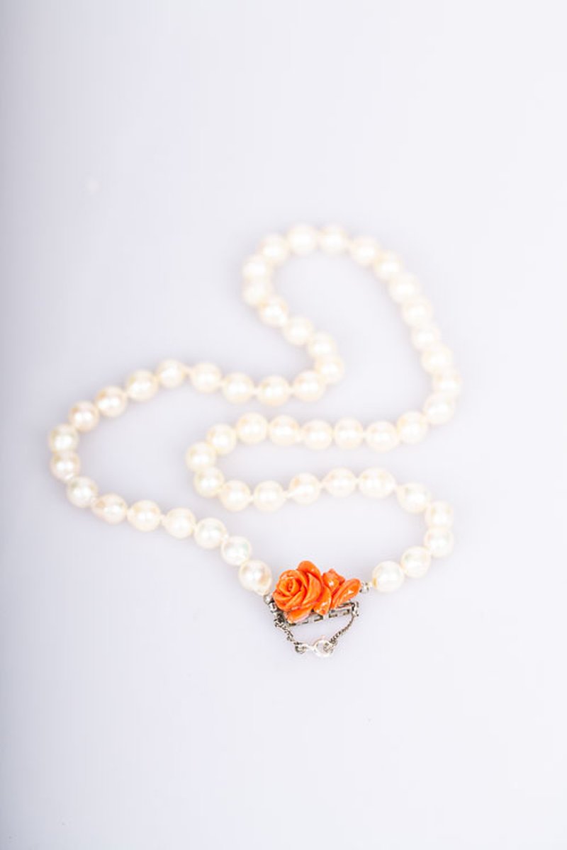 Pärlcollier med 7,5-8mm pärlor och handsnidat lås i korall. För extra säkerhet är låset utrustat med en säkerhetskedja så du slipper oroa dig för att tappa detta vackra pärlhalsband.