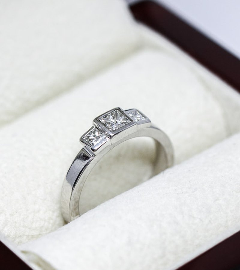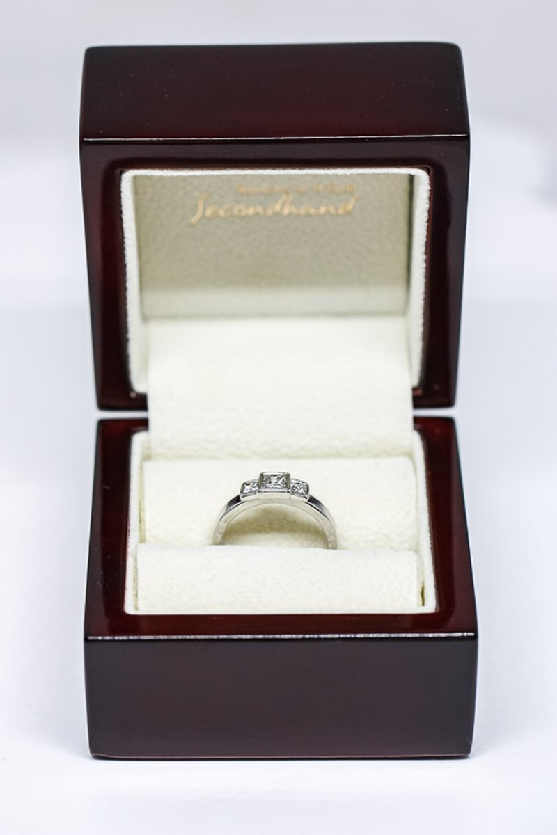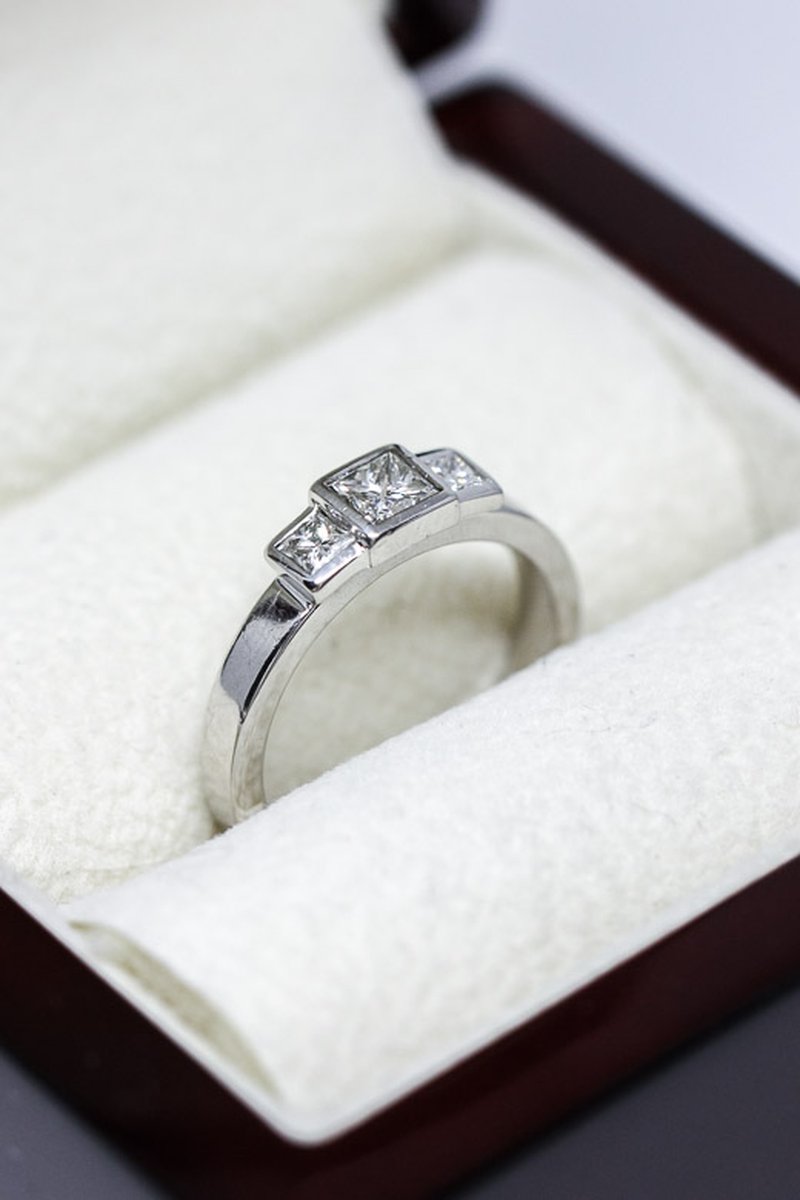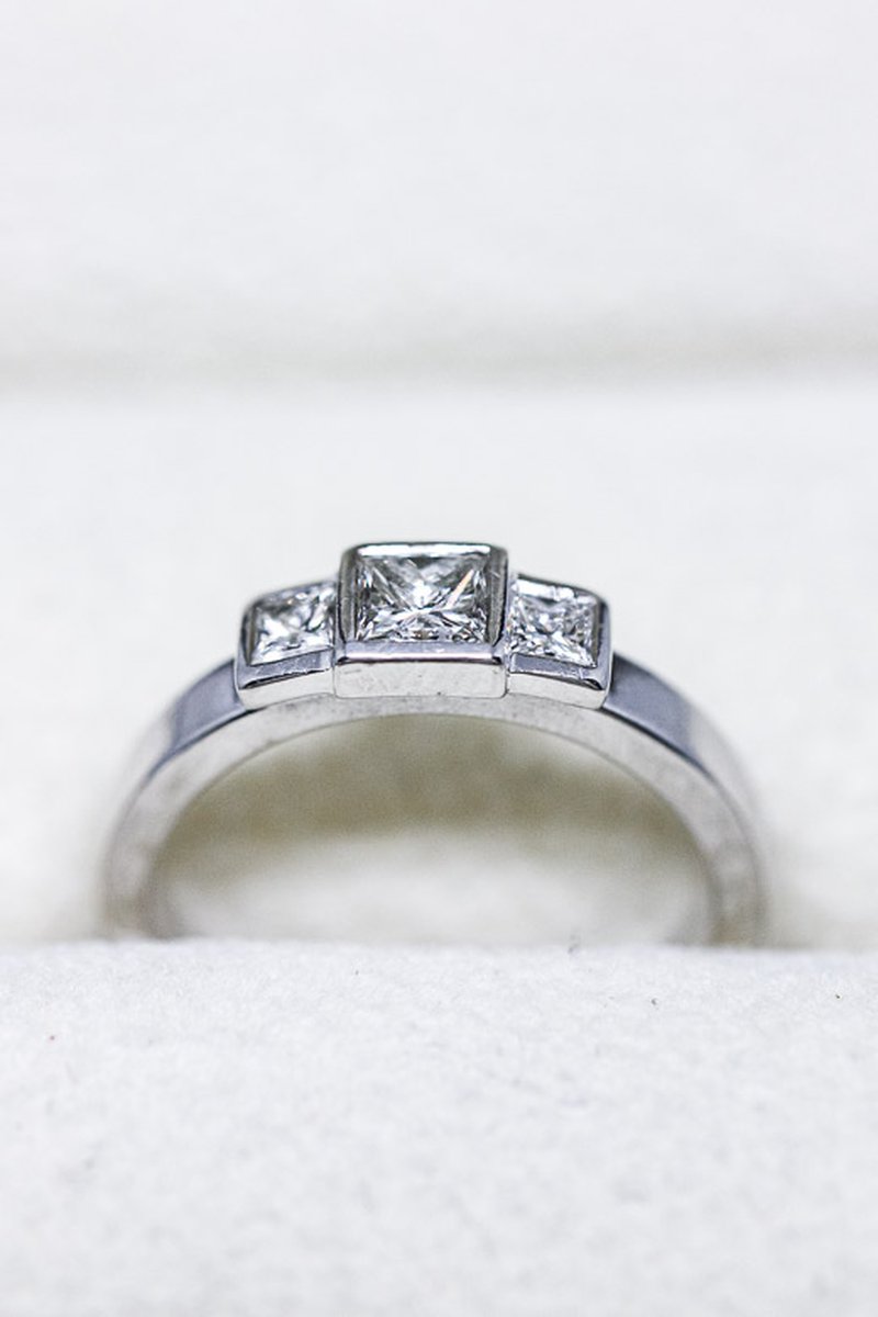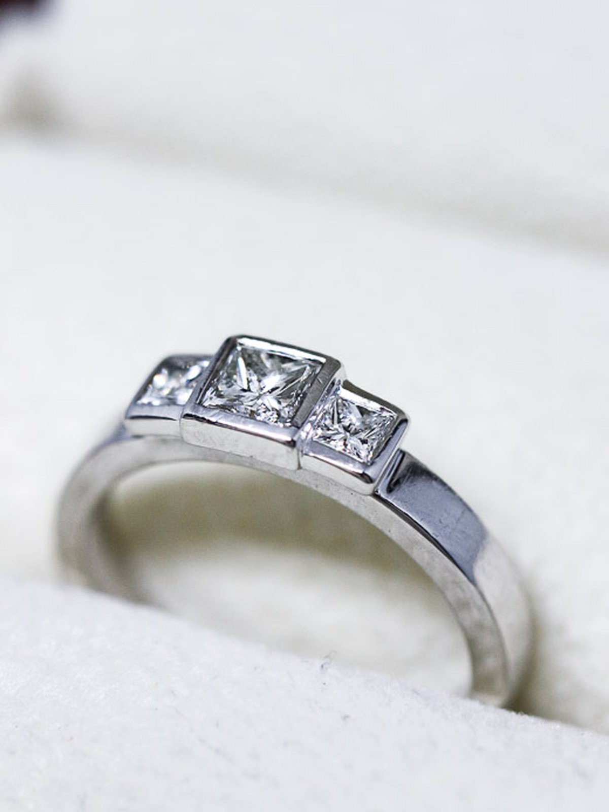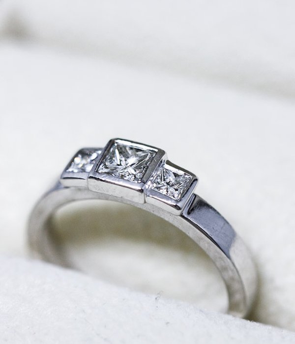 Schalins 'Prisma', vitguldsring med prinsesslipade diamanter. Perfekt förlovningsring!