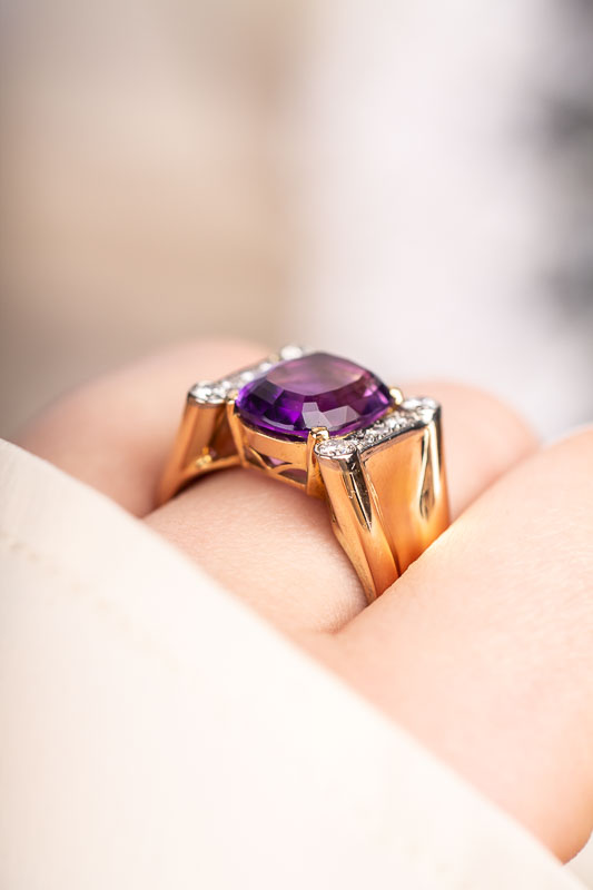 Maffig ring med härligt lila ametist och diamanter. Ametisten har inga skador, nagg eller flisor borta.