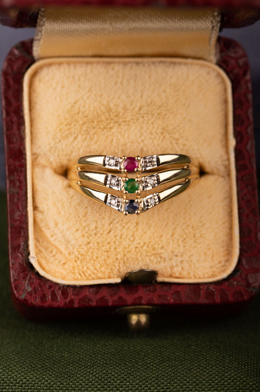 Vintage guldring med smaragd, rubin, safir och diamanter