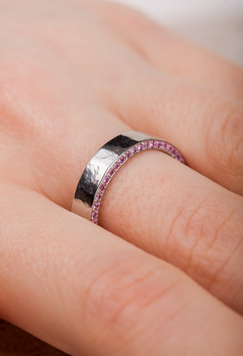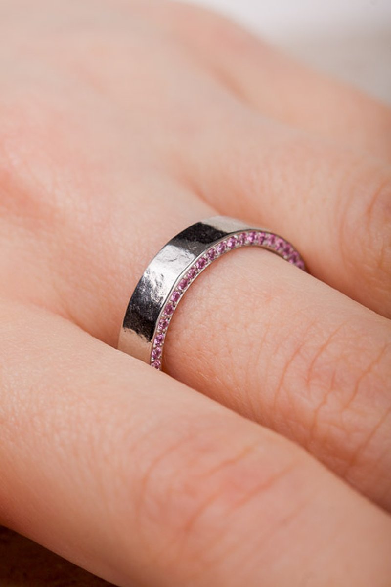 Handgjord helallians med rosa safirer. Ringen har en lätt hamrad utsida och en välvd insida som är väldigt skön att bära.