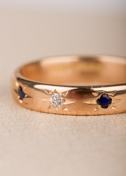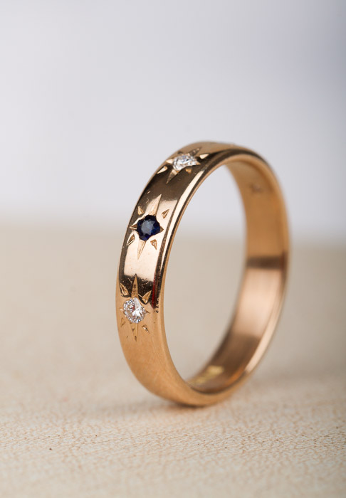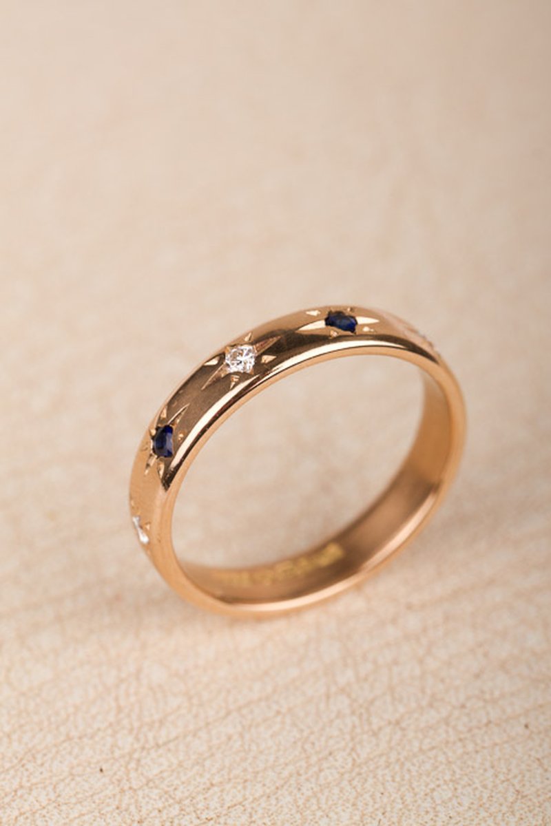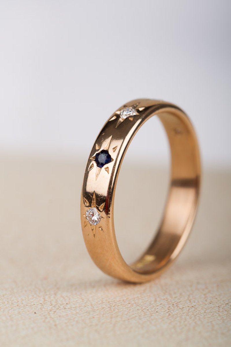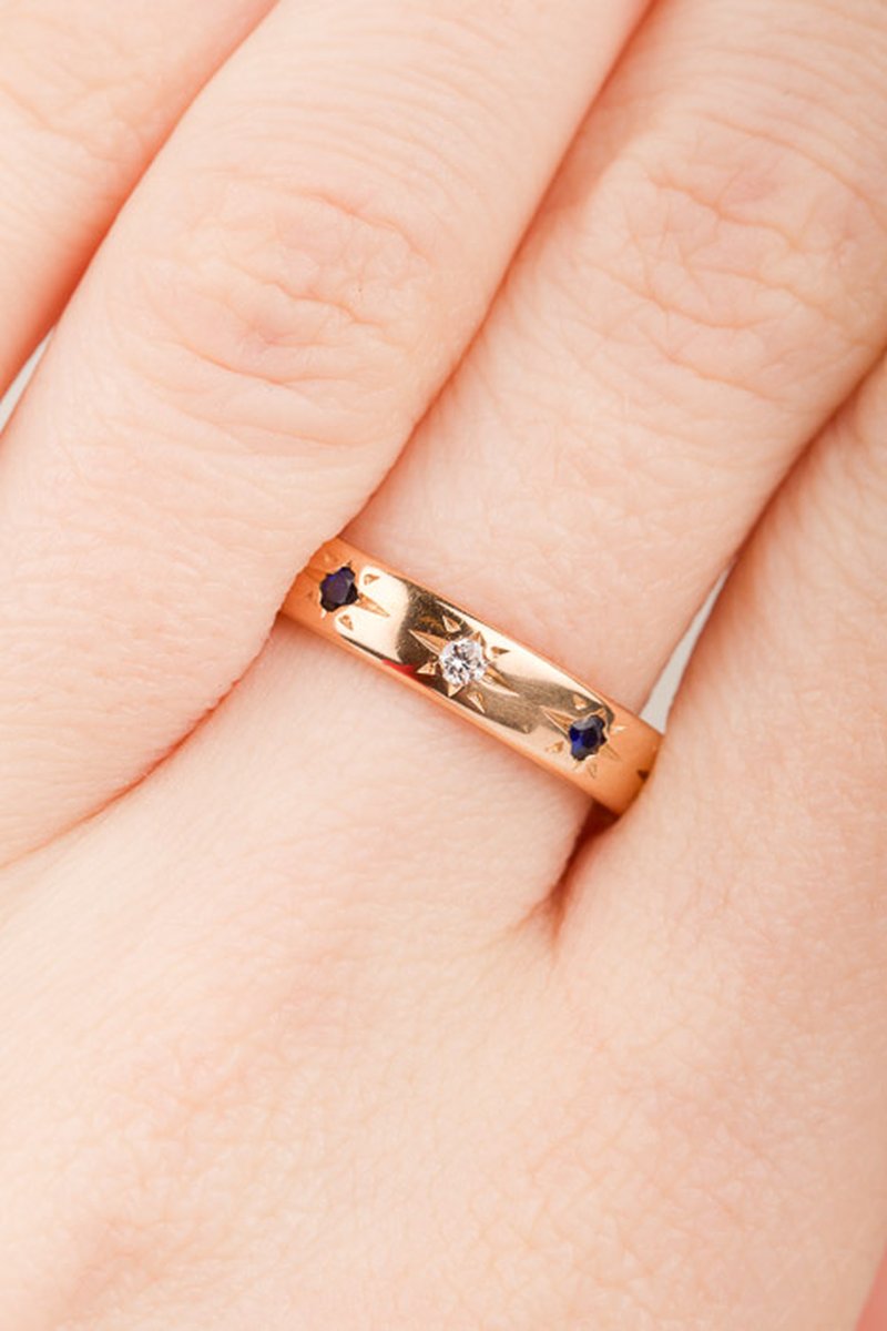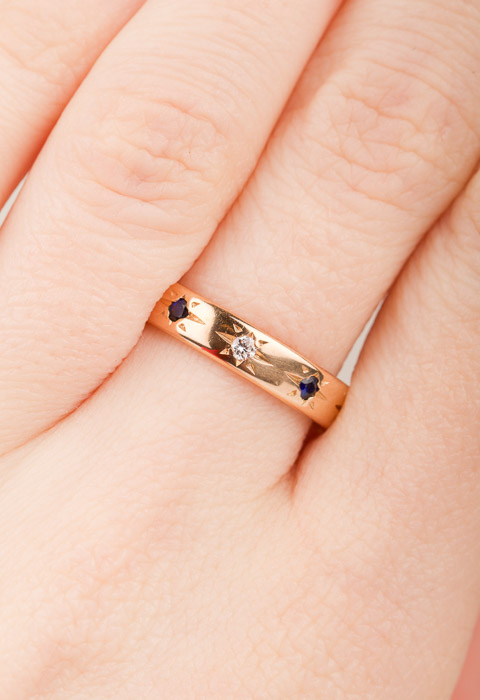 18k guld, diamanter 3 x 0,03 ct. Safirer 2 x 0,03 ct