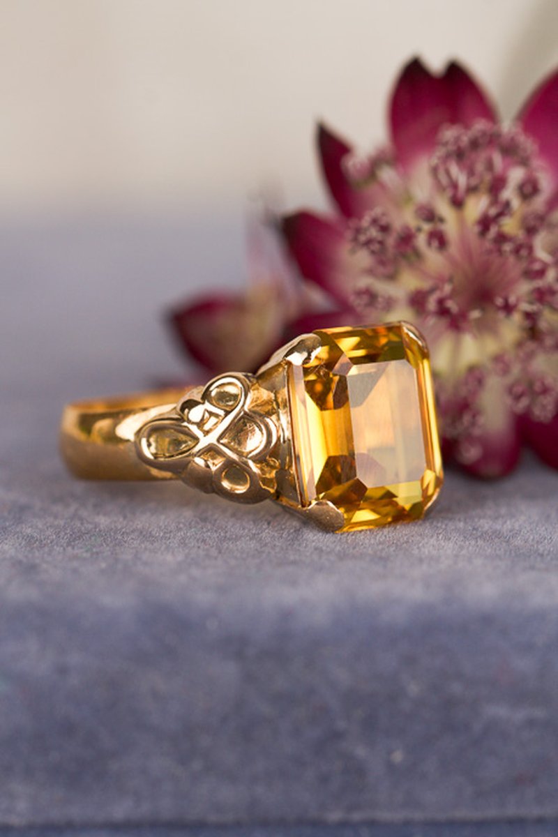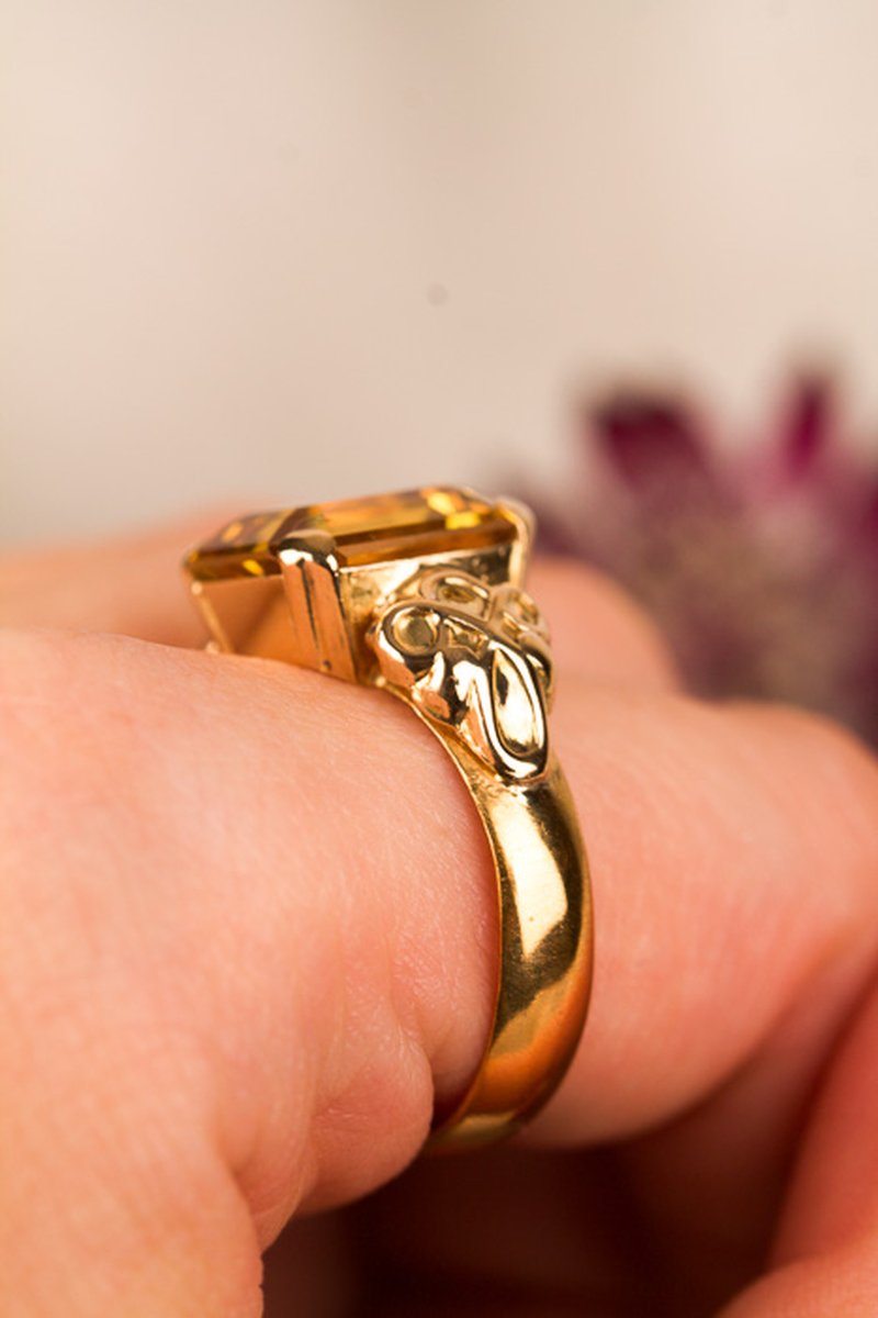 Ringskenan är tillverkad i 23K guld år 1892 och graverad med "E.W 17/3 1892". Stenen och dekoren bredvid är monterad i efterhand och tillverkad i 18K.