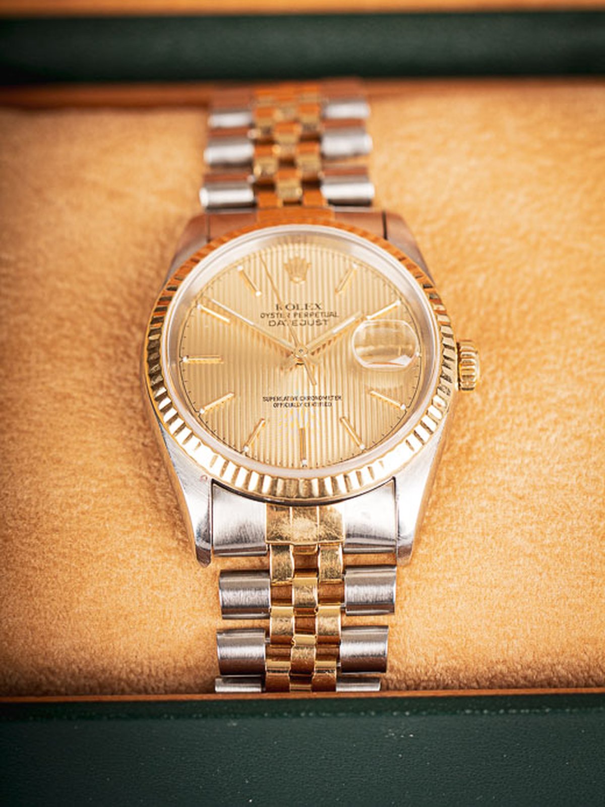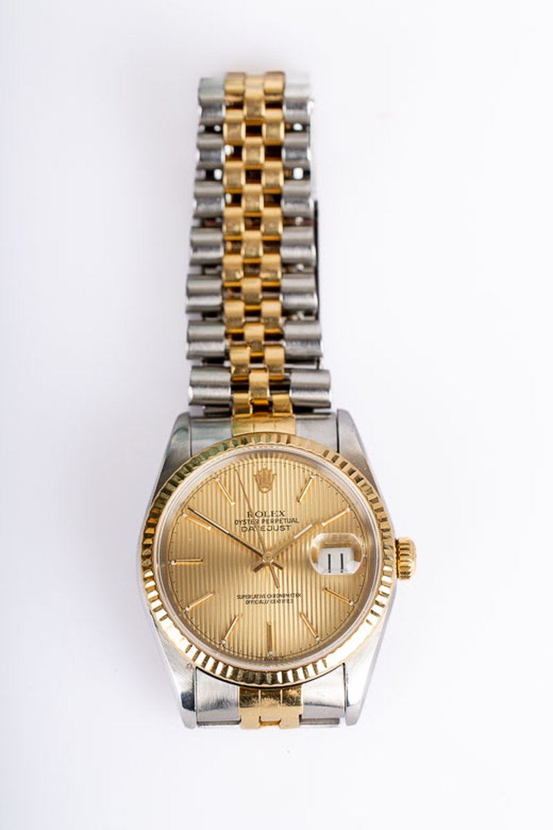 Favoriten Datejust med tapestry tavla i två-ton med box och papper. Uttagen i Sverige 1996. Nyservad med 2år garanti och 6månader försäkring.