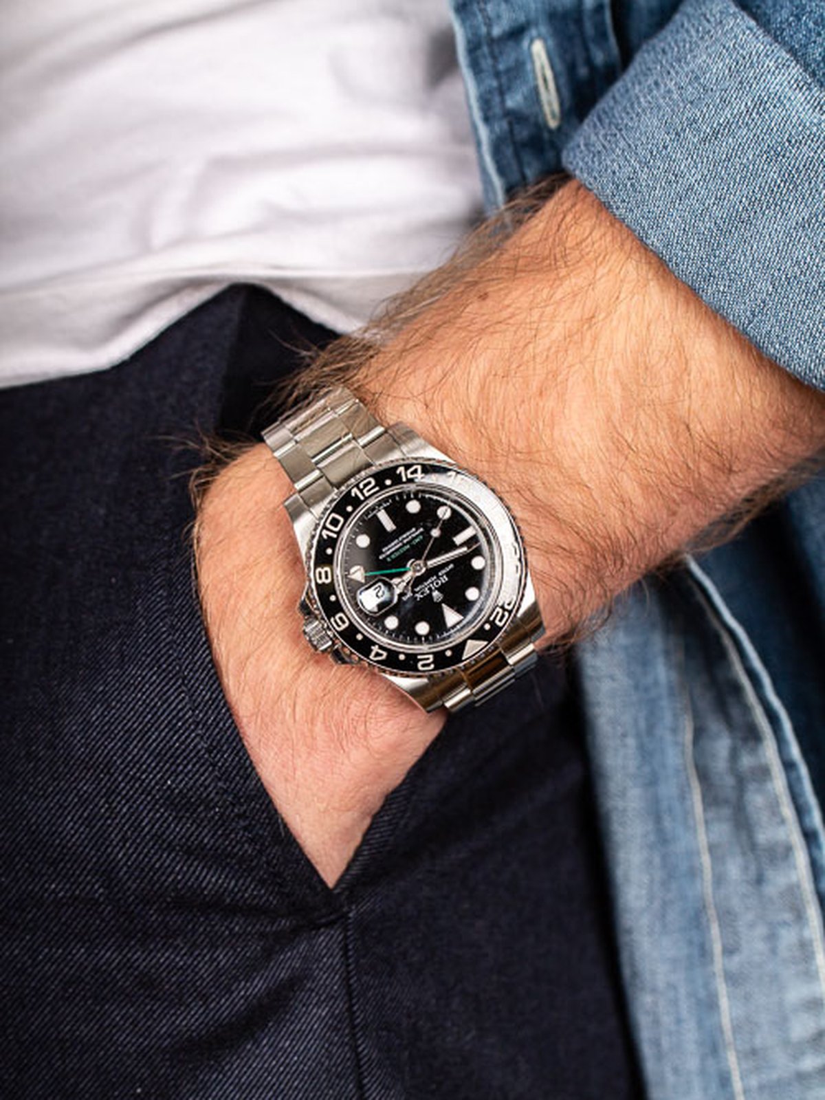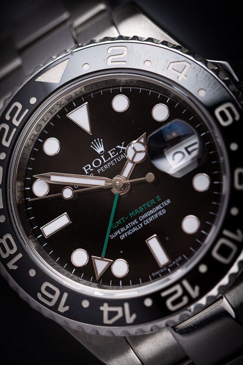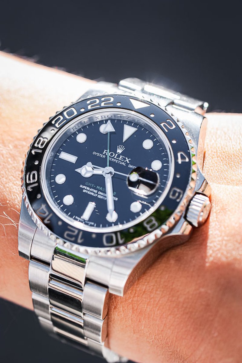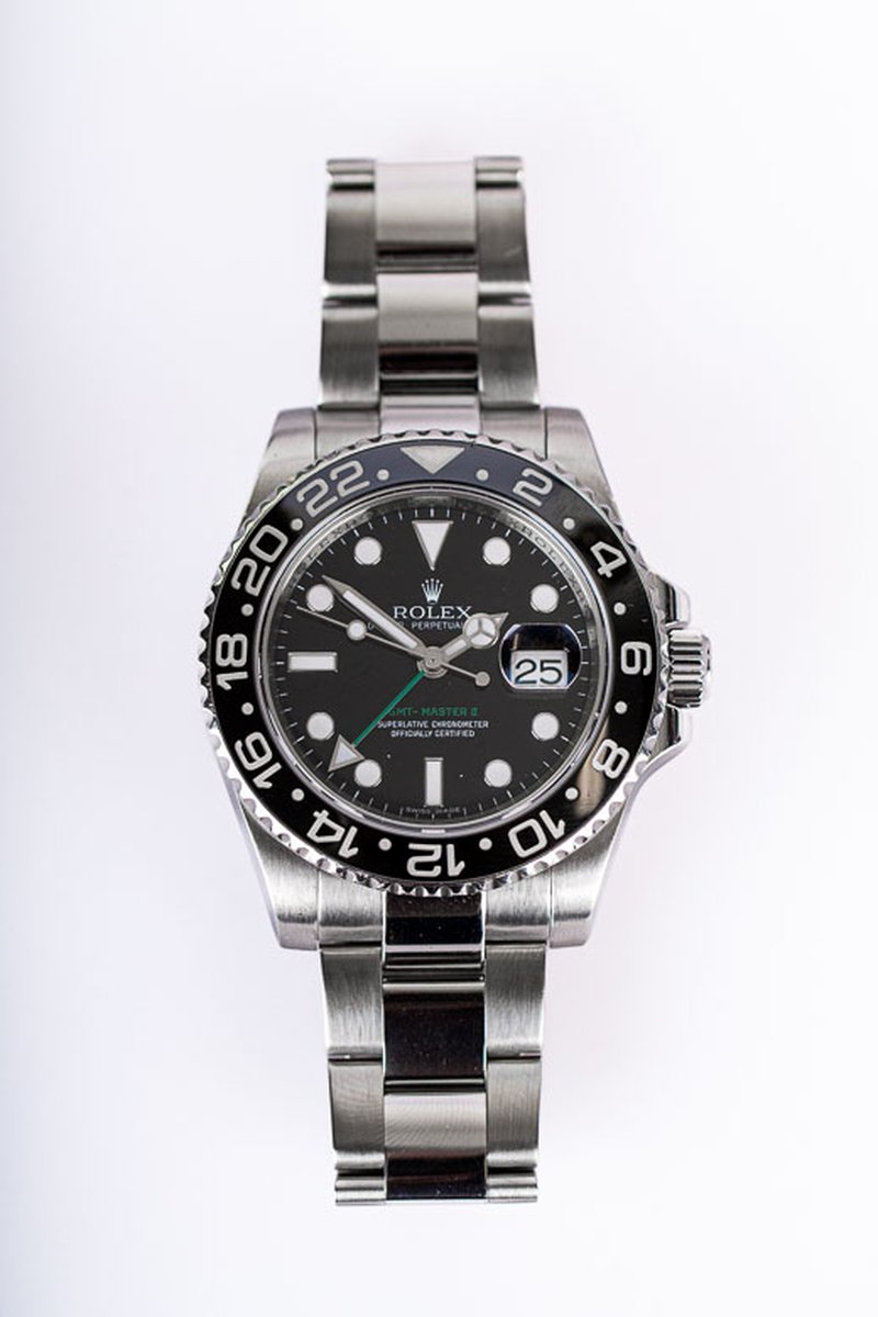 GMT Master 2 med keramisk vridring, safirglas och maxi caset. Driver denna klocka gör Rolex caliber 3186, ett kronometercertifierat automatiskt urverk med 50 timmars gångreserv. Endast box medföljer, inga papper.