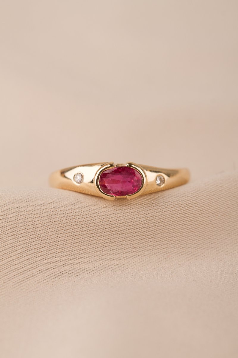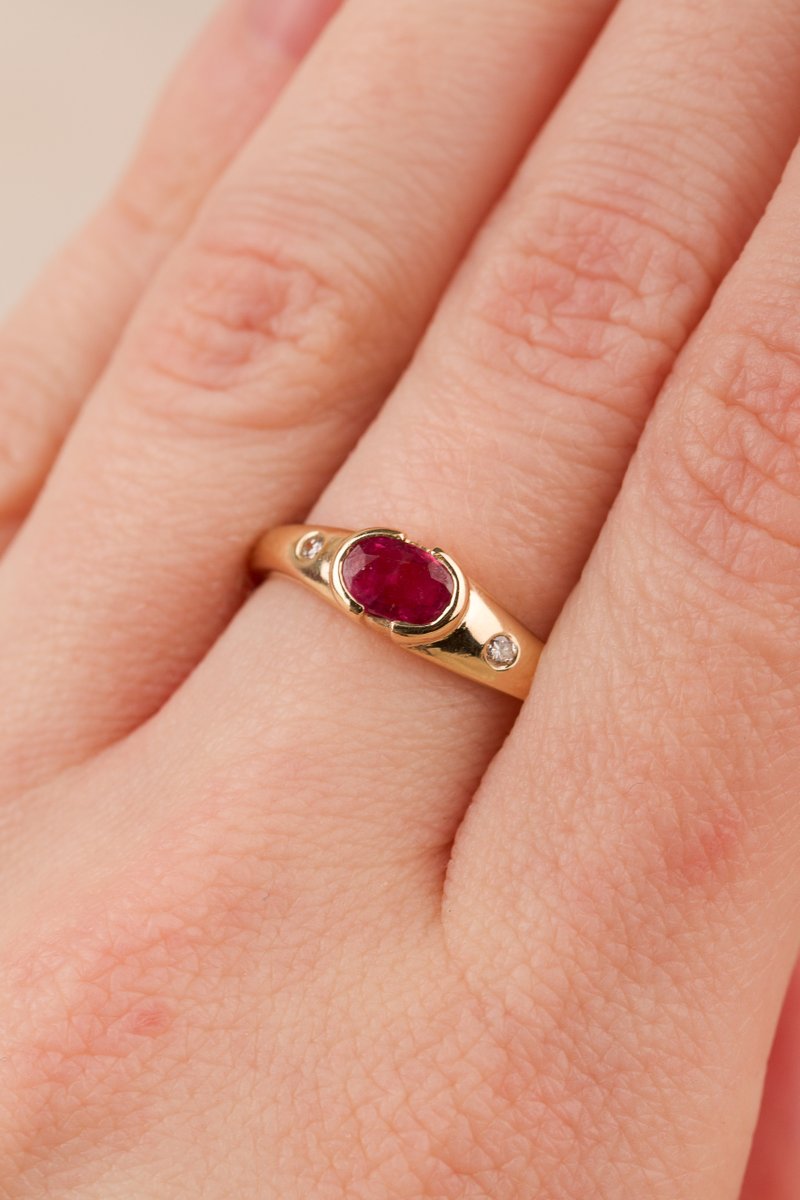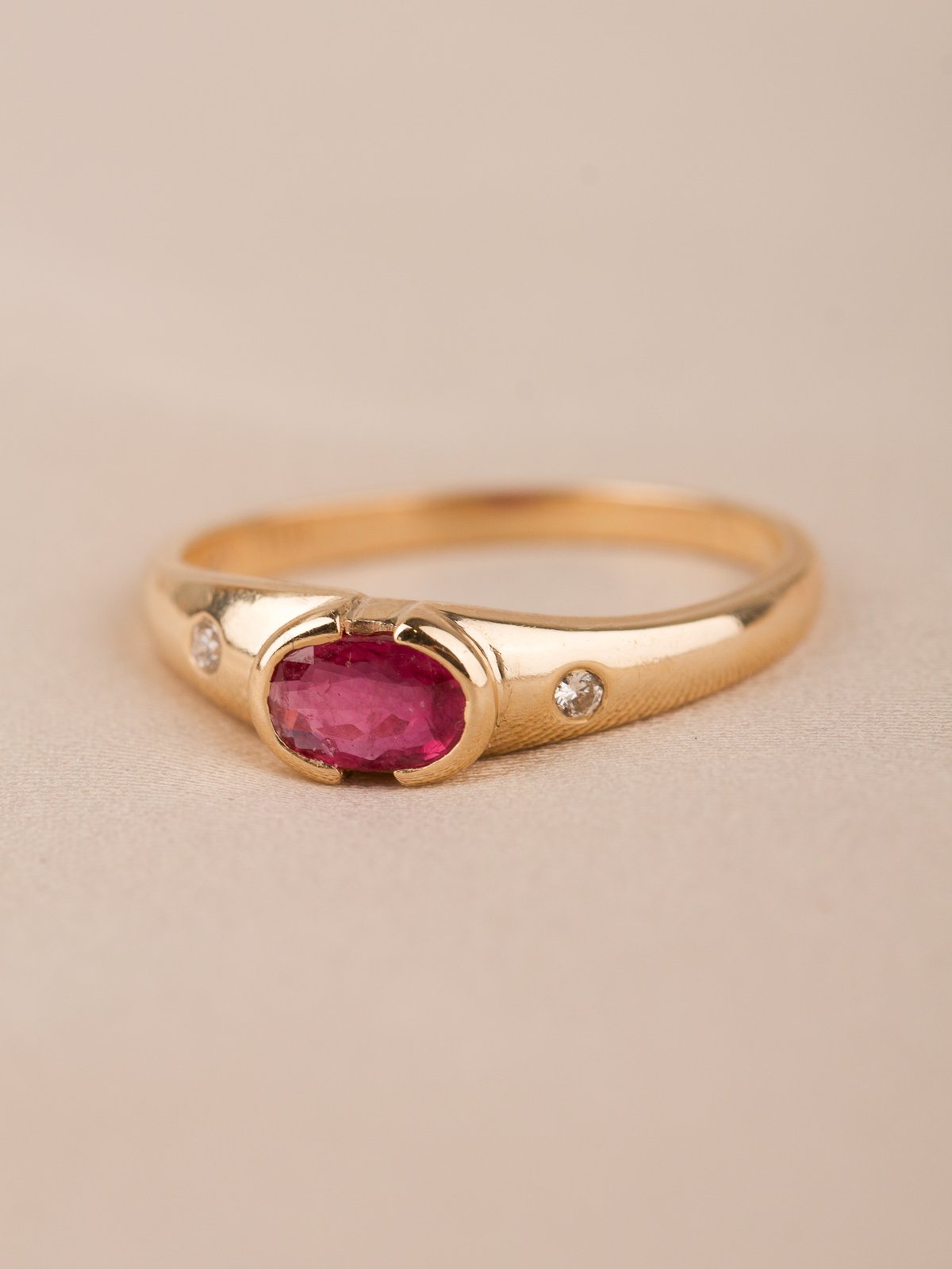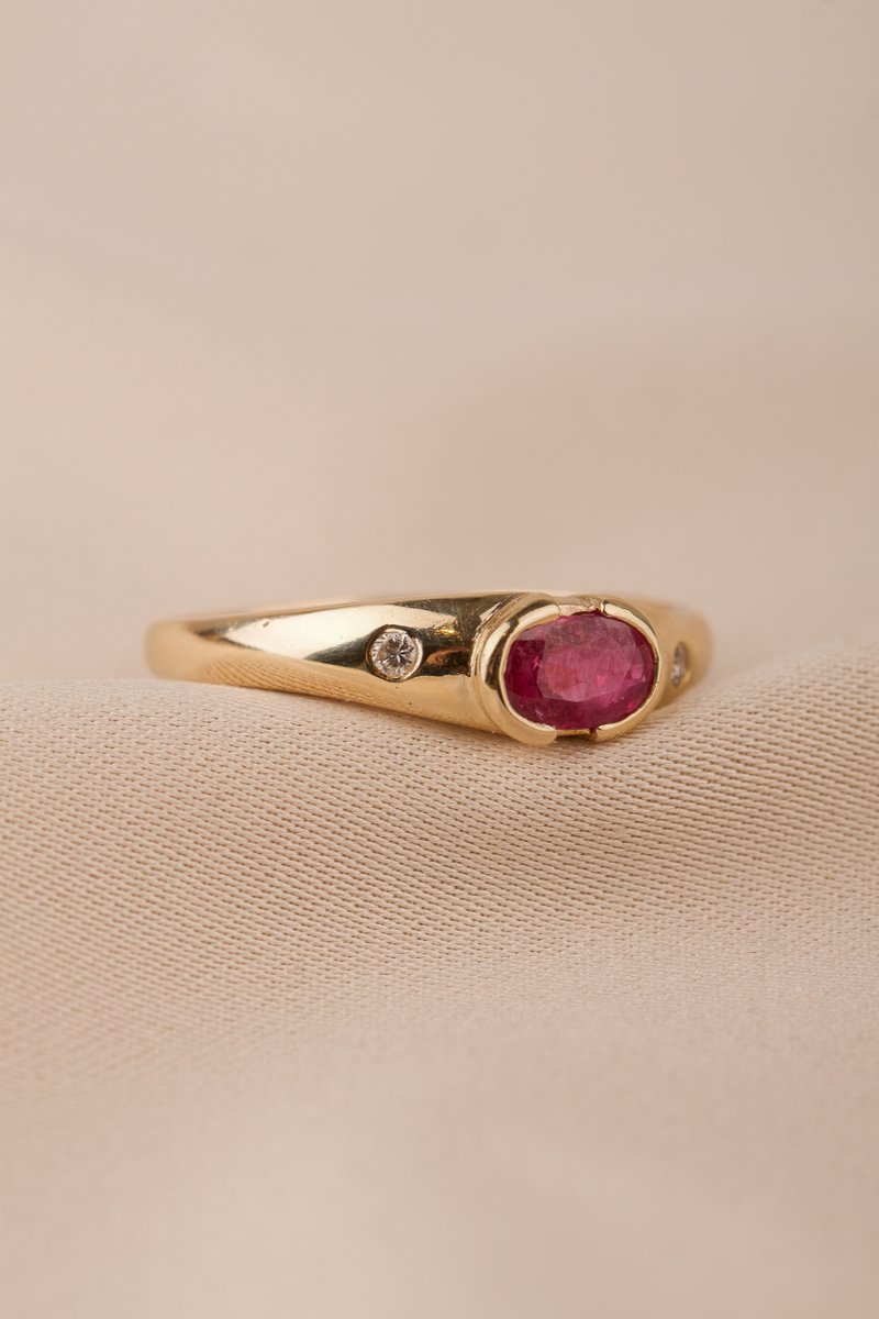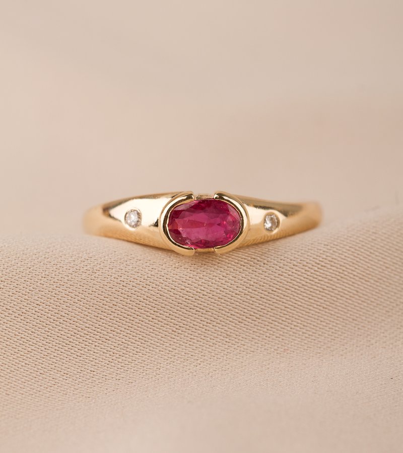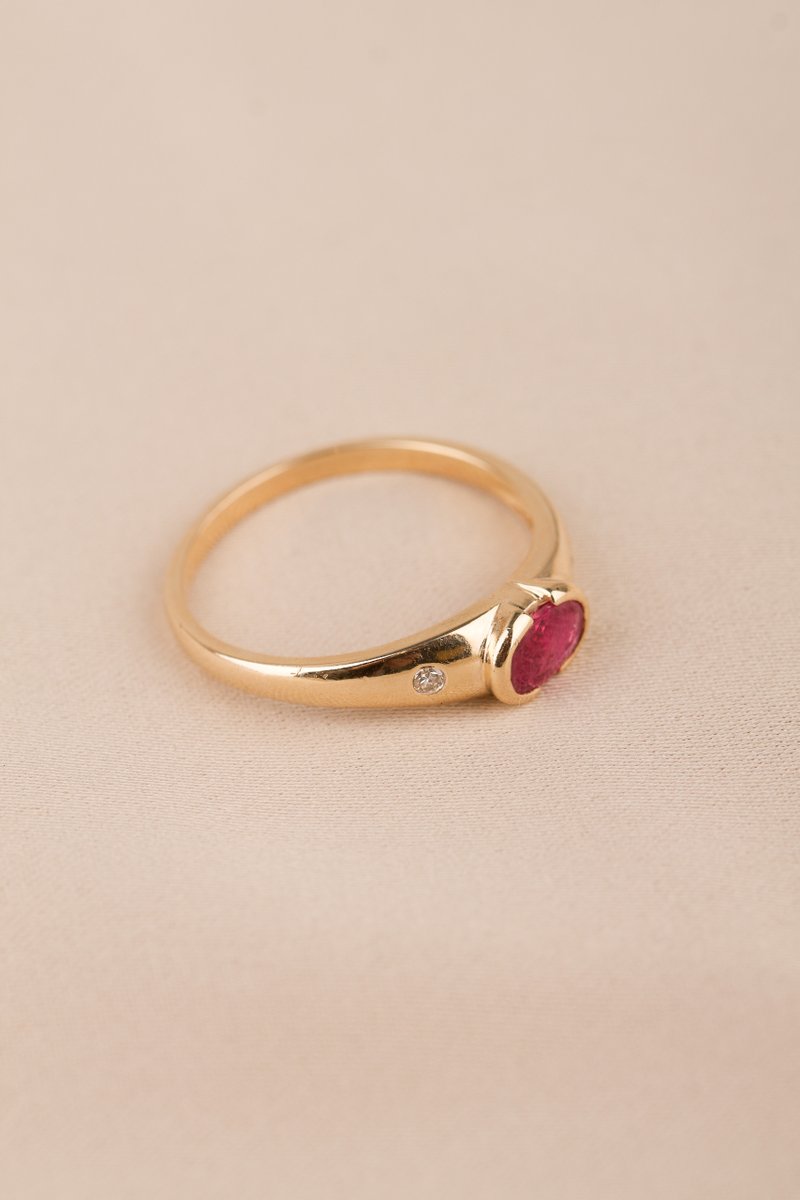 14K guld, Rubin 5,7 x 4,2 mm. Diamanter 2 x 0,02 ct.