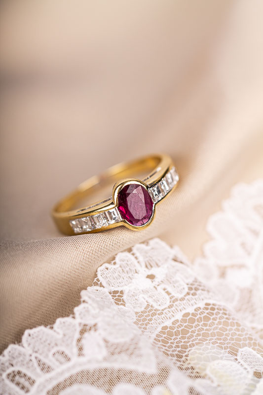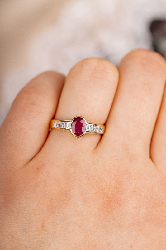 Lyxig ring med en 6,5x5,2mm rubin och totalt 0,40ct prinsesslipade diamanter. Ringen är i gott skick.