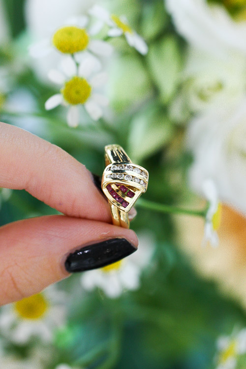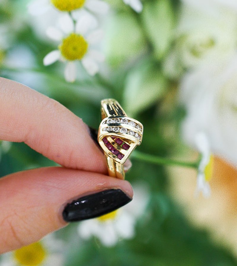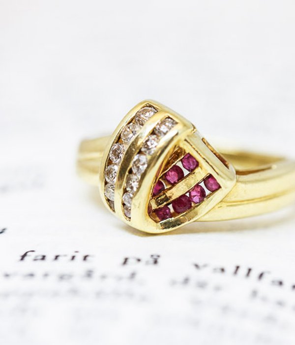 Vacker rubinring med 9st 0,02ct och 3st 0,01ct diamanter. Massiv ringskena med något välvd insida.