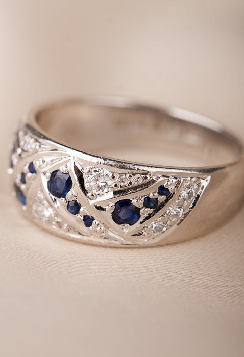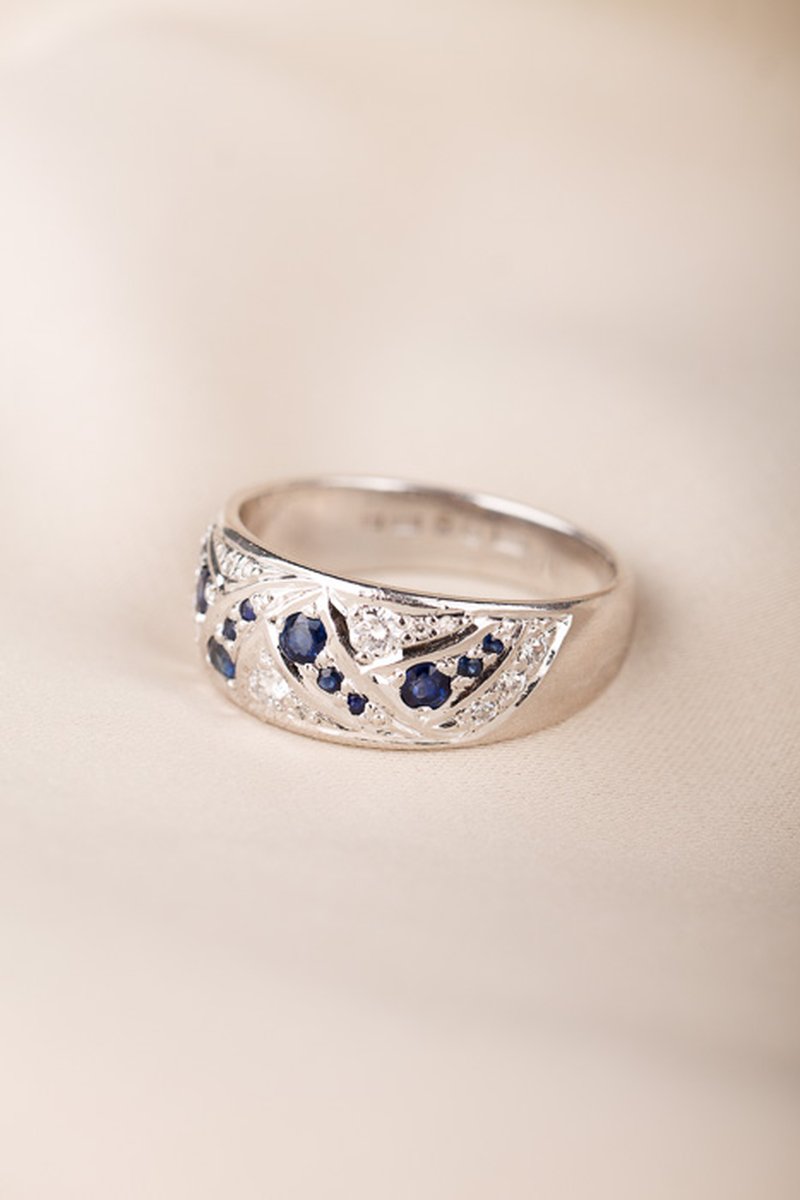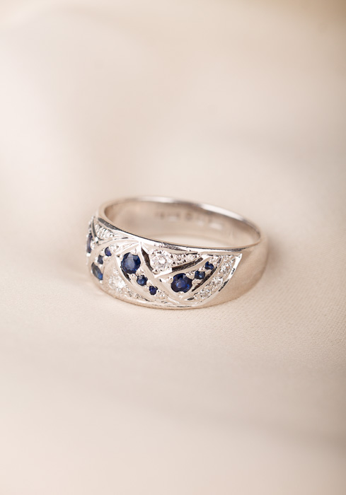18k vitguld, Safirer: 4 st 2,7 mm, 4 st 1,3 mm, 3 st 1 mm. Briljantslipade diamanter: 3 x 0,06 ct, 3 x 0,015 ct och 5 x 0,005 ct.