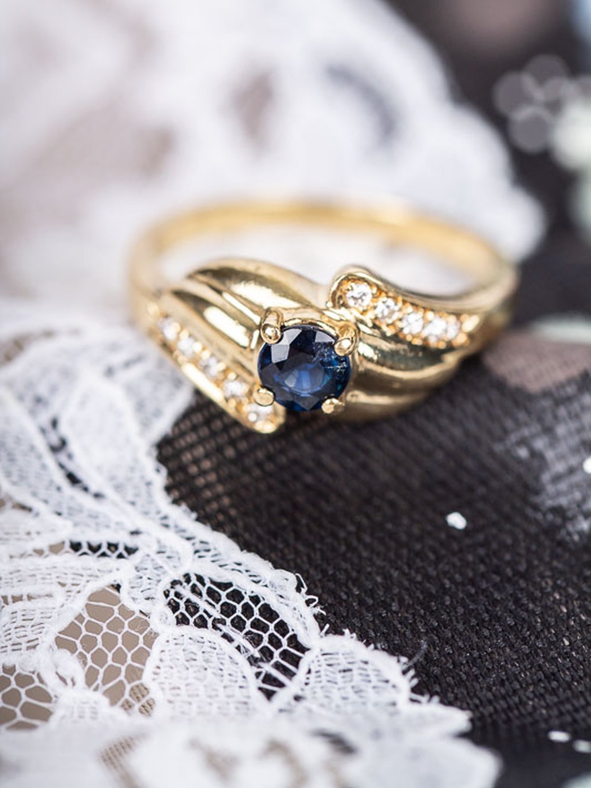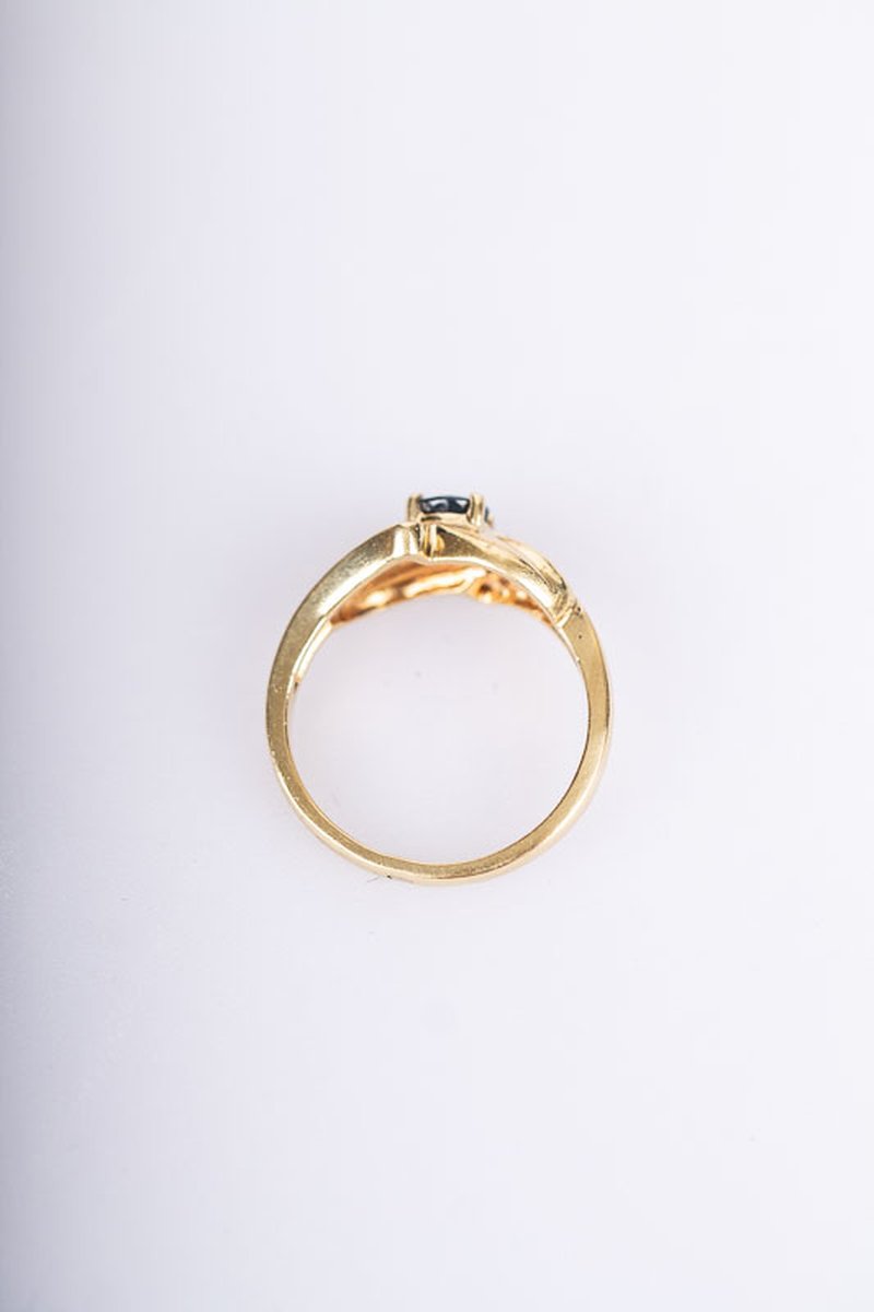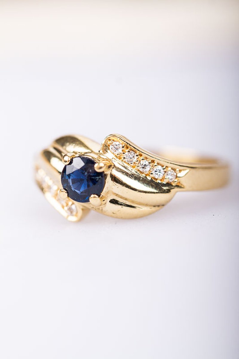 Näpen och söt safirring i rödguld. Safiren mäter 4,5mm och omges av totalt 0,10ct diamanter