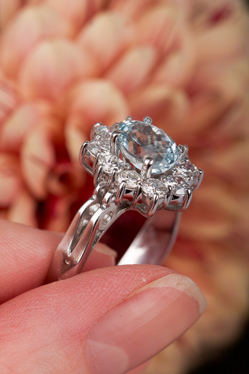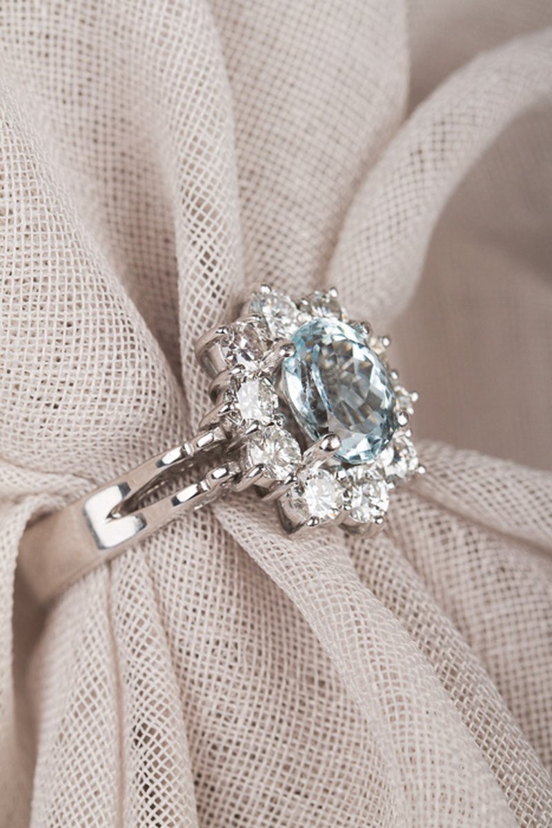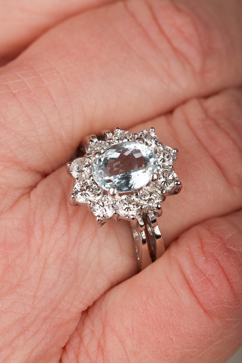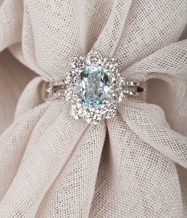 18k vitguld, akvamarin 7 x 9,1 mm, briljantslipade diamanter 10 x 0,12 ct
