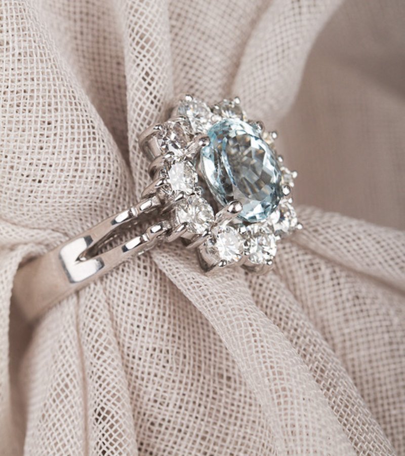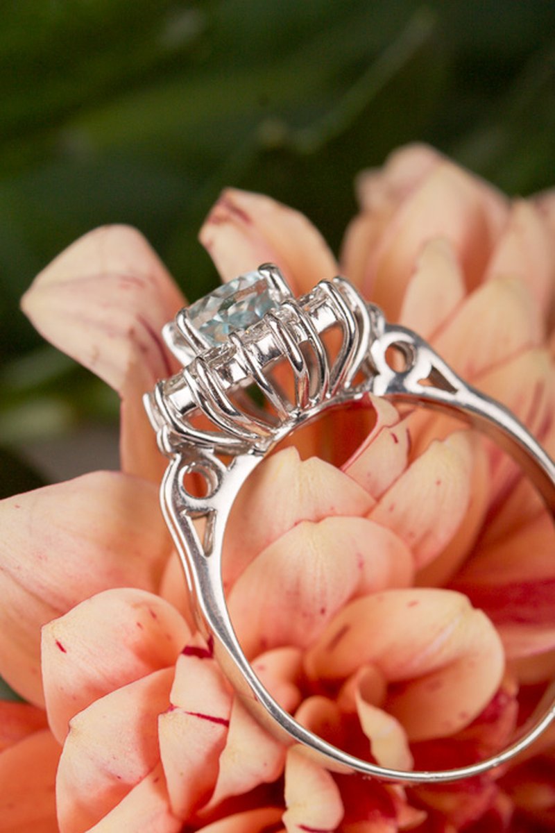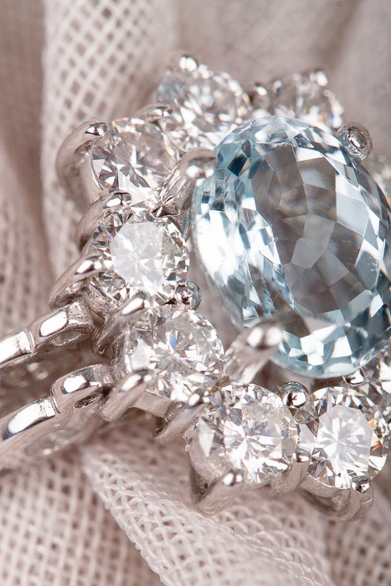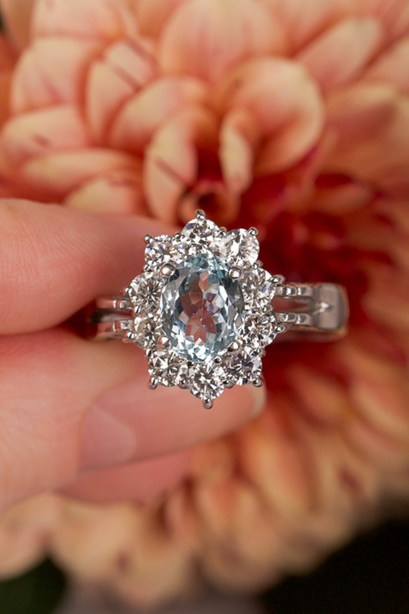 18k vitguld, akvamarin 7 x 9,1 mm, briljantslipade diamanter 10 x 0,12 ct