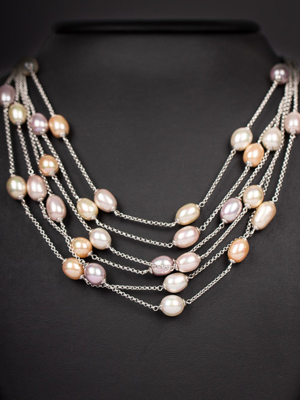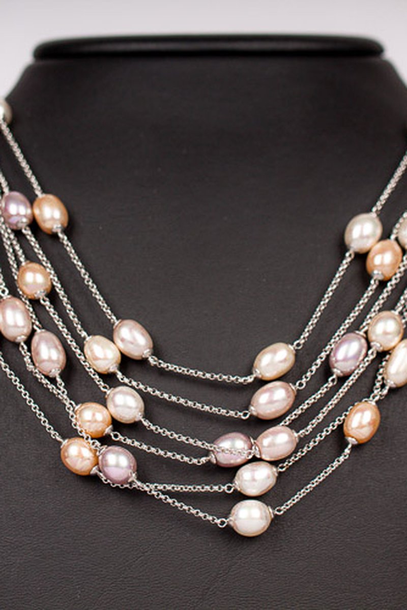 Silvercollier med majorica-pärlor i sex rader. Pärlorna är i stilla pastelliga nyanser, ställbar kedja mellan 42-50 cm.