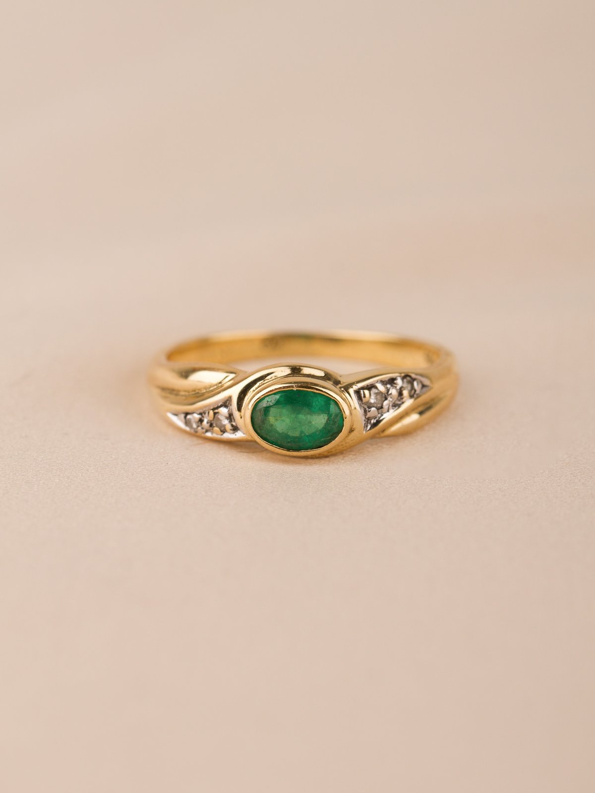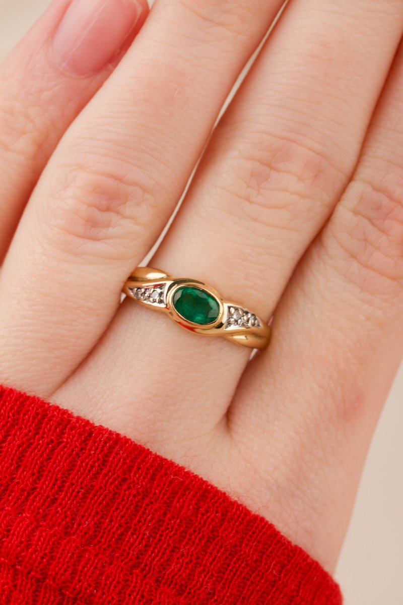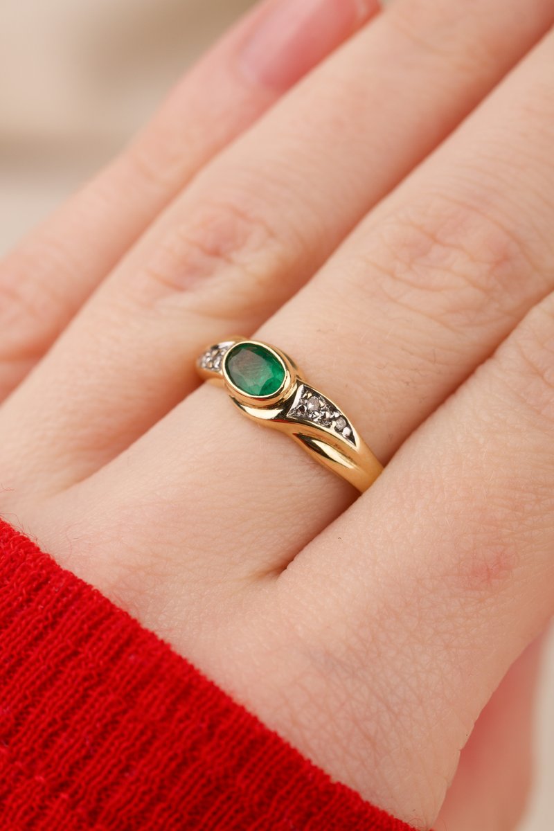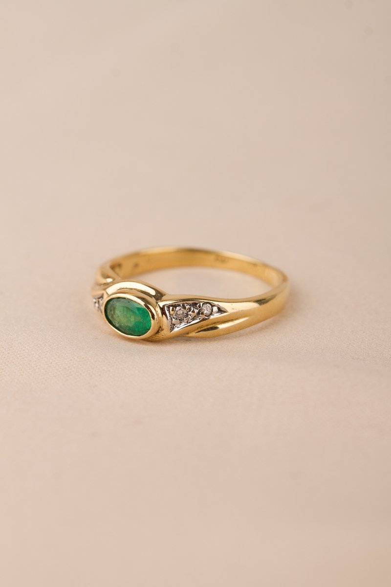 18K guld, Smaragd 5,5 x 3,5 mm. briljantslipade diamanter 2 x 0,01 & 2 x 0,005 ct