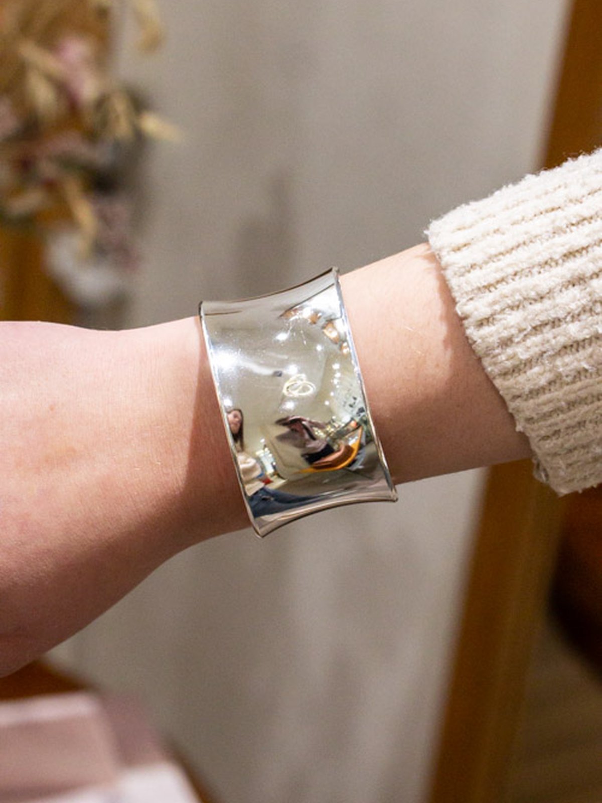 Utgången modell av läckra 'Smithy Cuff' från Georg Jensen. Denna armring är vackert designad så den följer handledens form med en lätt välv insida för extra bekvämlighet. Design år 2013.