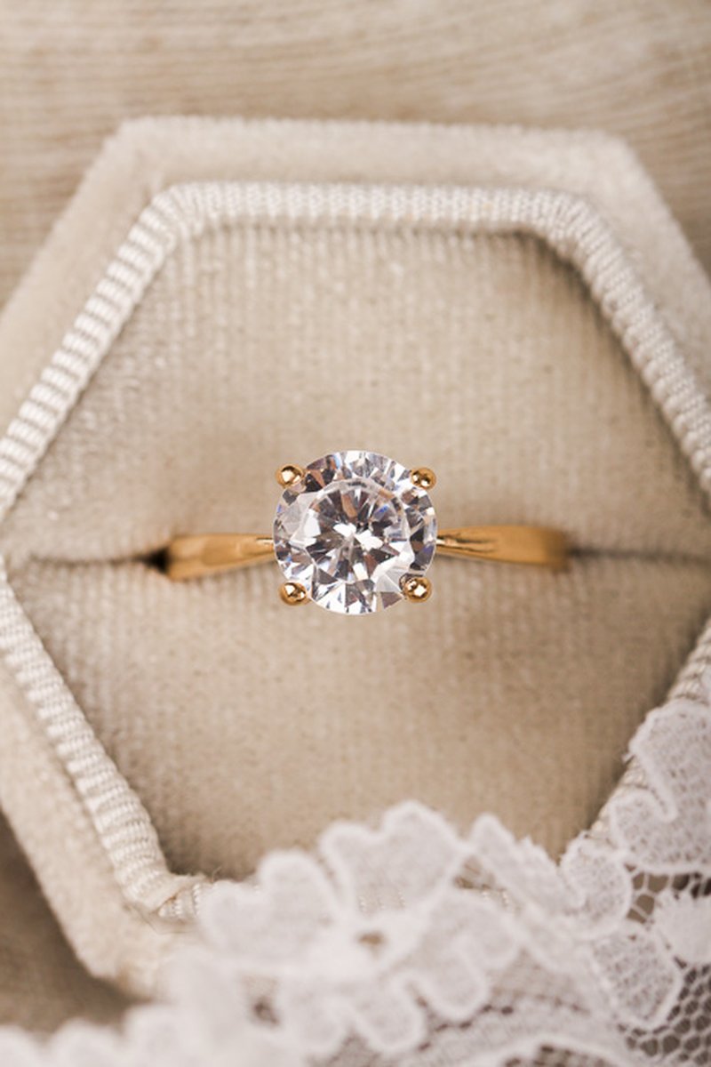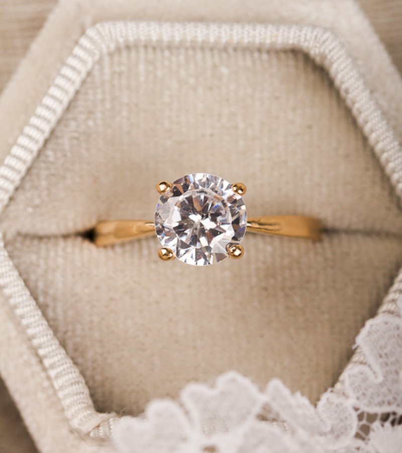 Fin solitärring med en oäkta vit sten som har samma storlek/diameter som en 2,00 ct diamant.