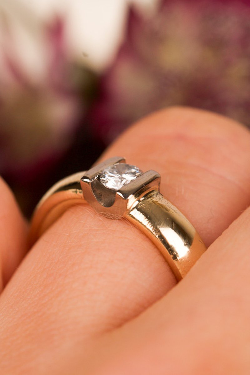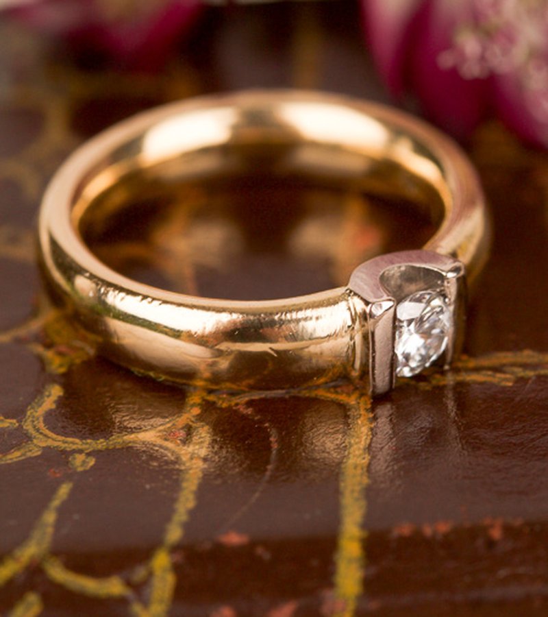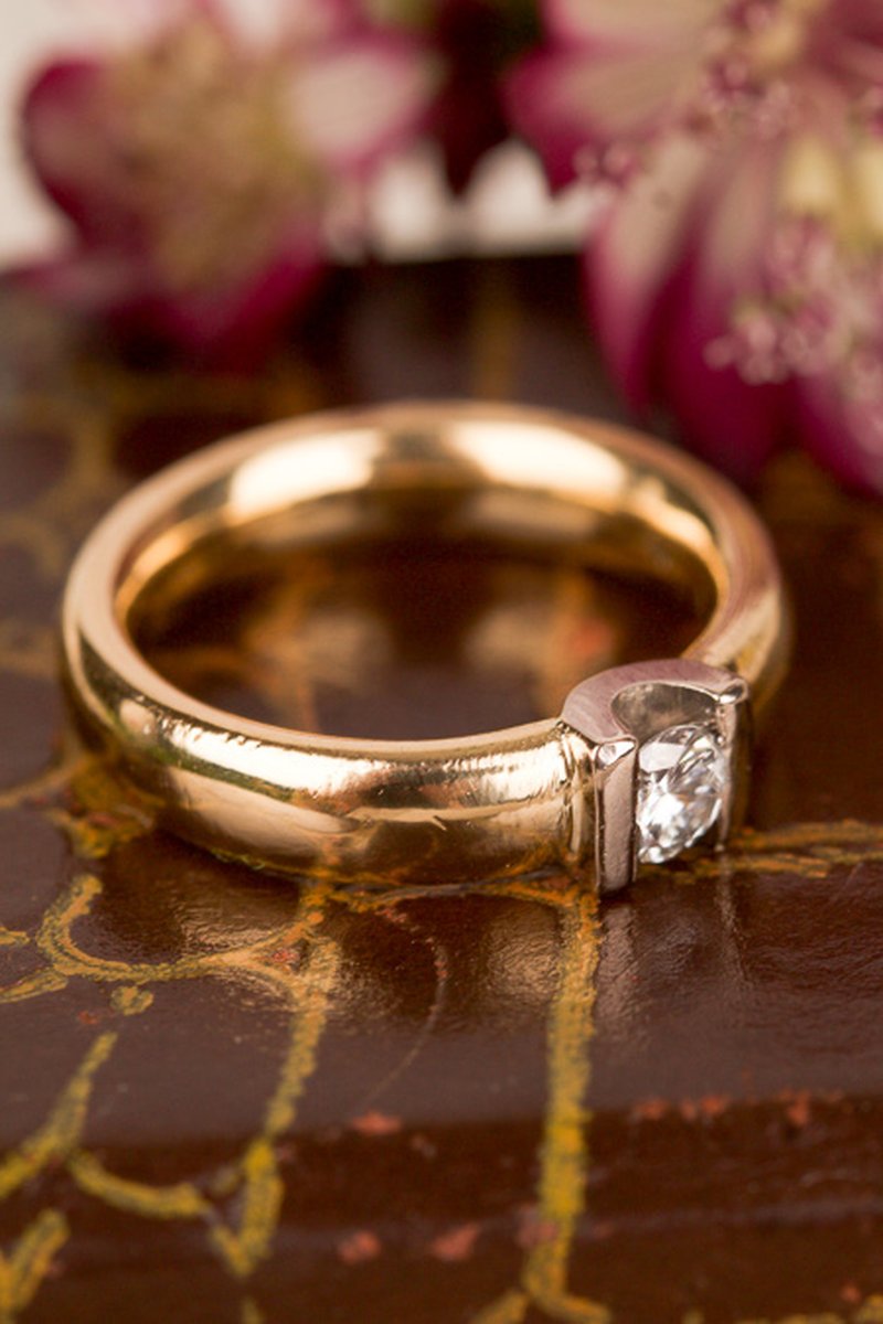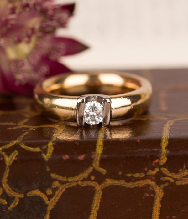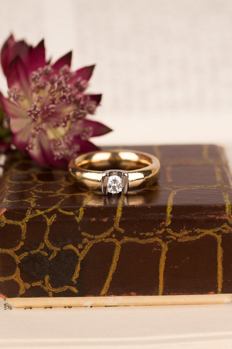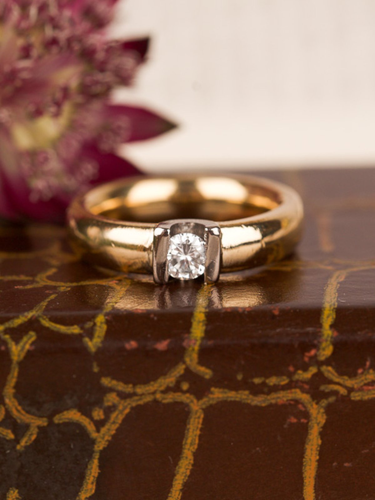 Solitärring i gult guld med en vitguldsinfattad briljantslipad diamant på 0,20 ct. Lite bullig skena som är väldigt skön att bära. Passar som solitär eller varför inte stacka den bredvid en eller två alliansringar? Ringen går utmärkt att öka till önskad ringstorlek.
