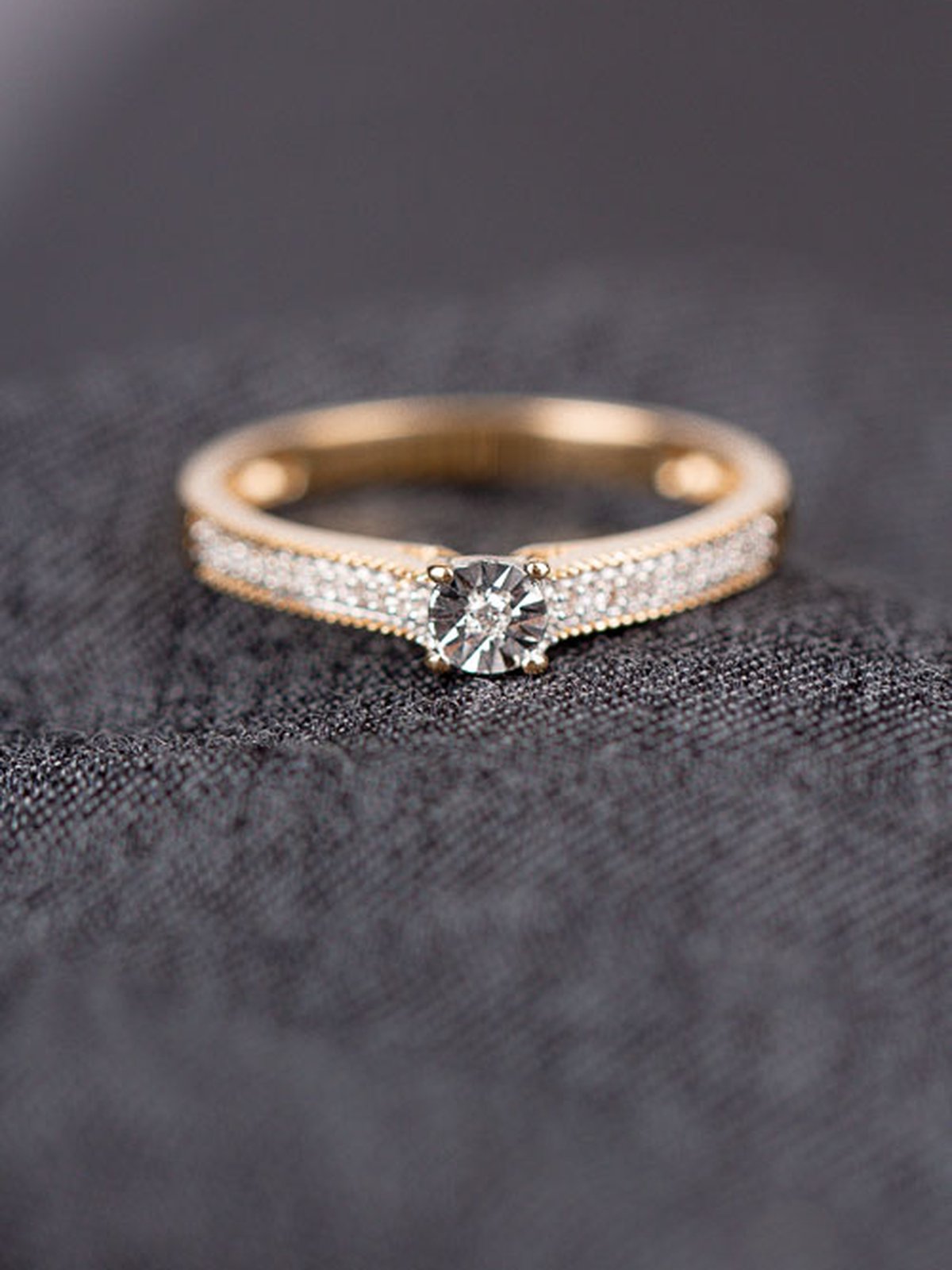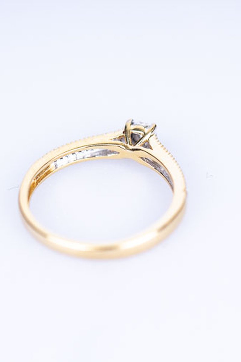 Solitärring i 18k guld med briljant 001ct samt sidostenar 20st 8/8 slipade diamanter á 0005ct - fin ring på en nätt hand