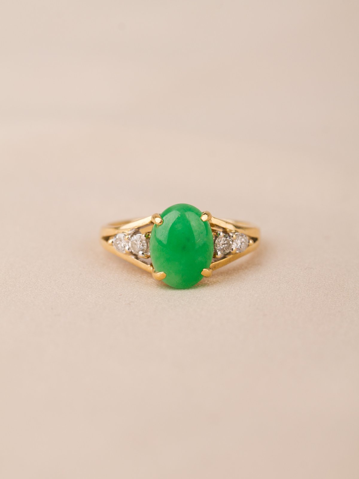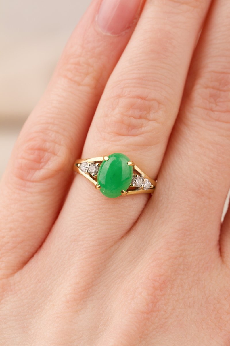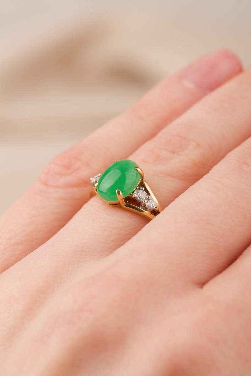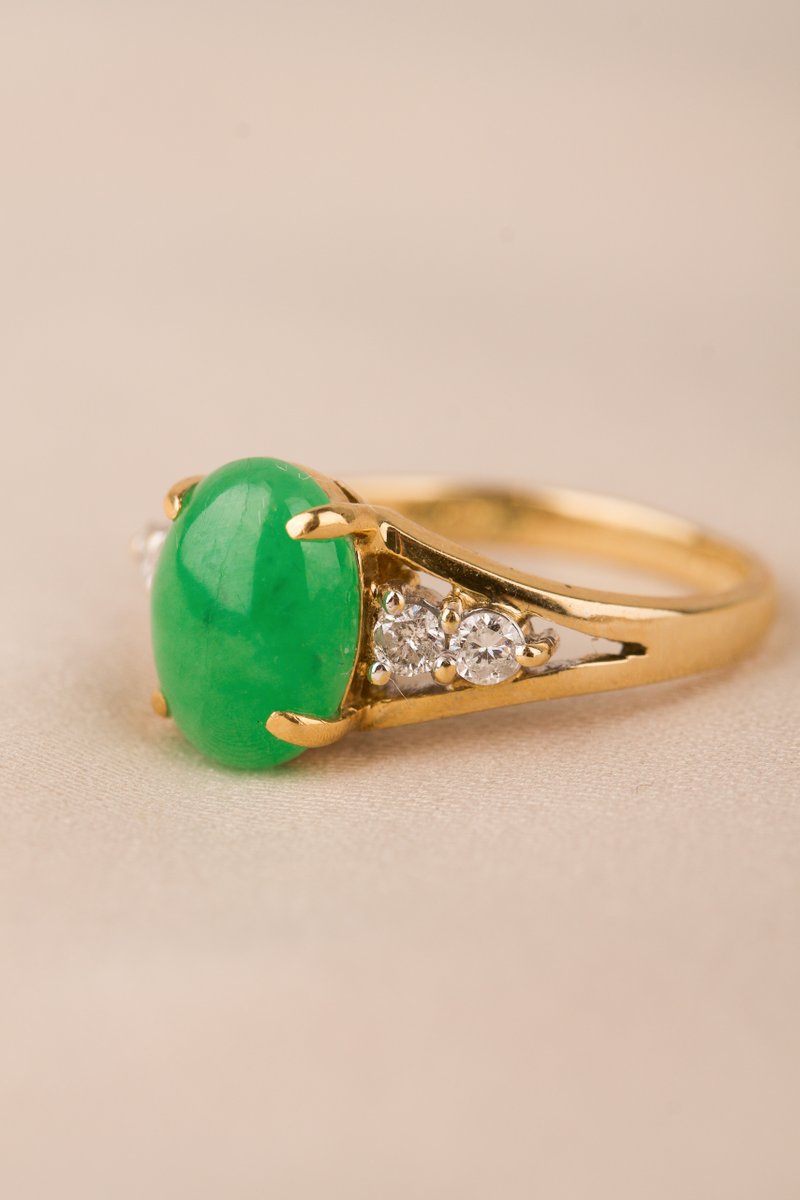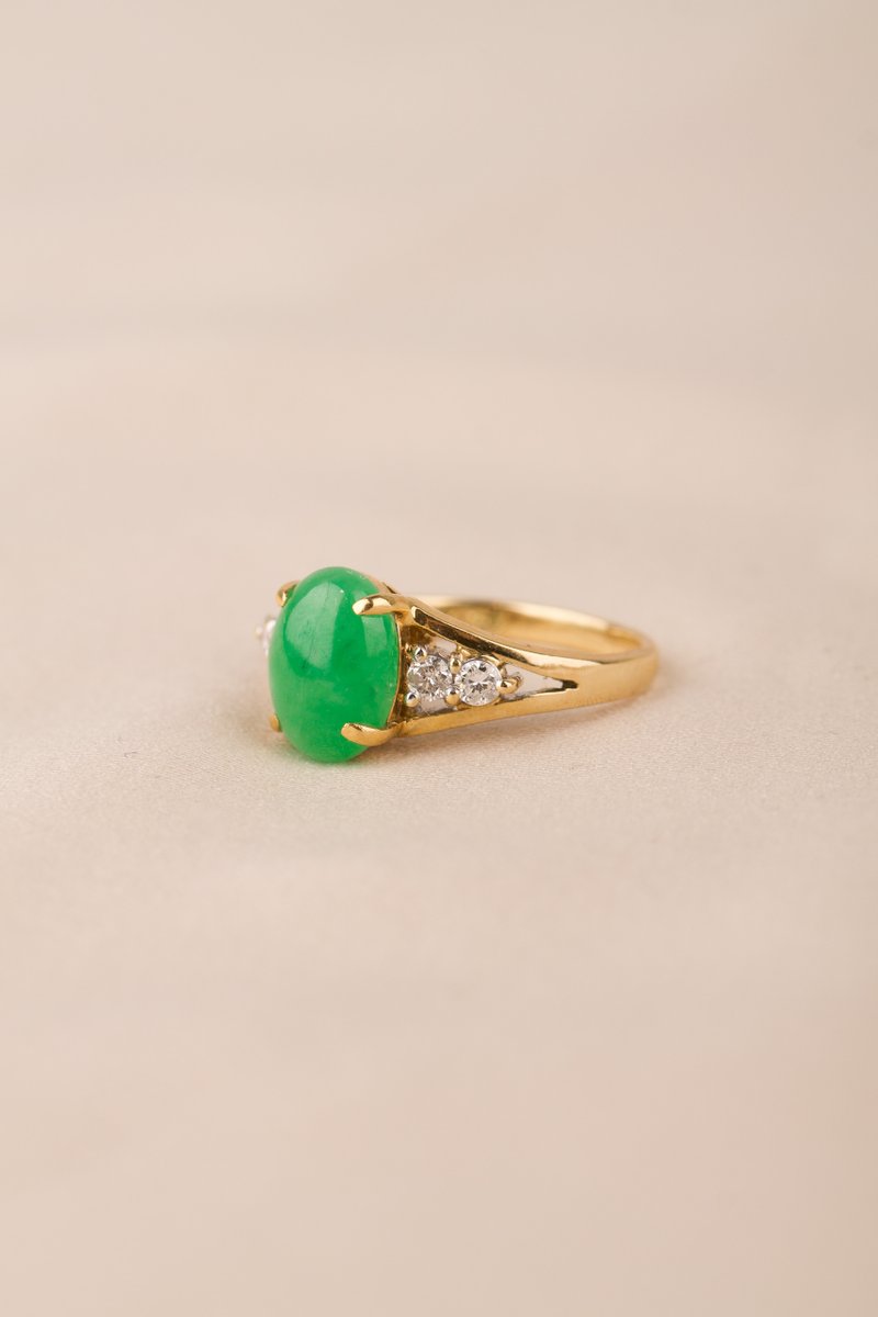 18K guld, oval cabuchonslipad krysopras, 4 st åttkantsslipade diamanter tot. 0,16 ct