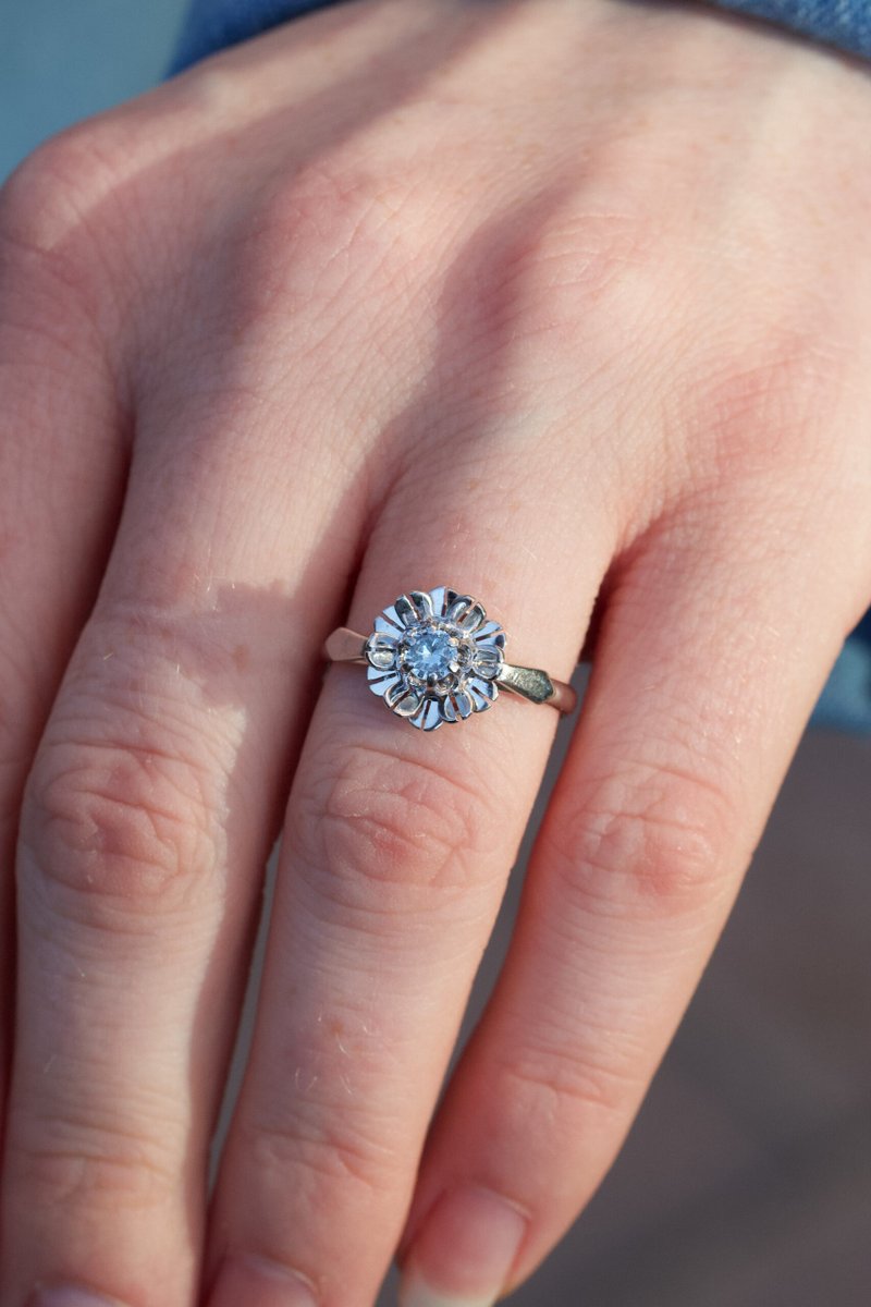 Stenen i mitten är ljust, ljust blå. Kan förväxlas som vit vid första anblick