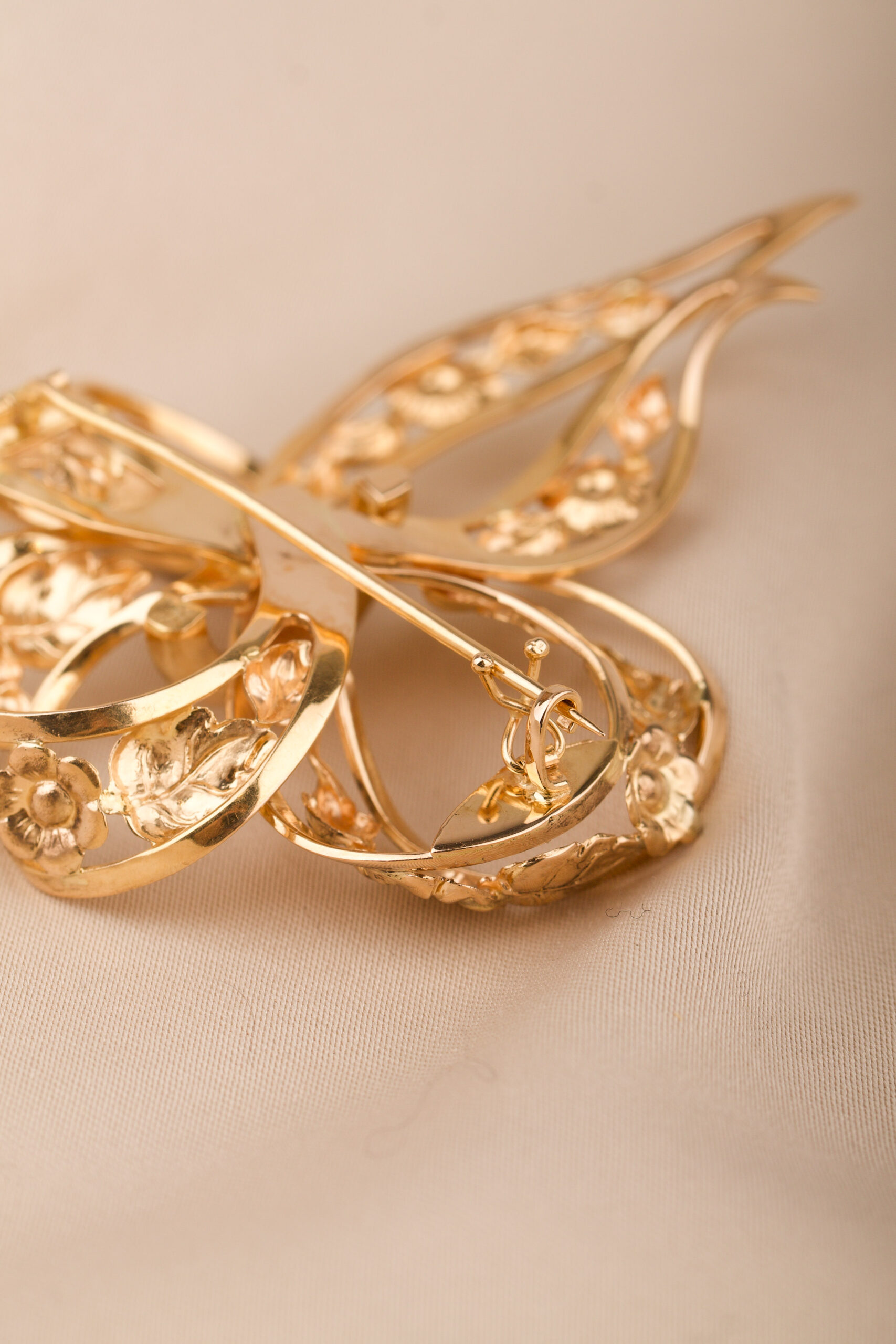 Fantastiskt vacker guldbrosch på hela 6,5 cm, tillverkad på 1940-talet (troligtvis 1946, stämplarna är något otydliga). Perfekt för dig som vill ha ett helt unikt smycke att ärva vidare i generationer.