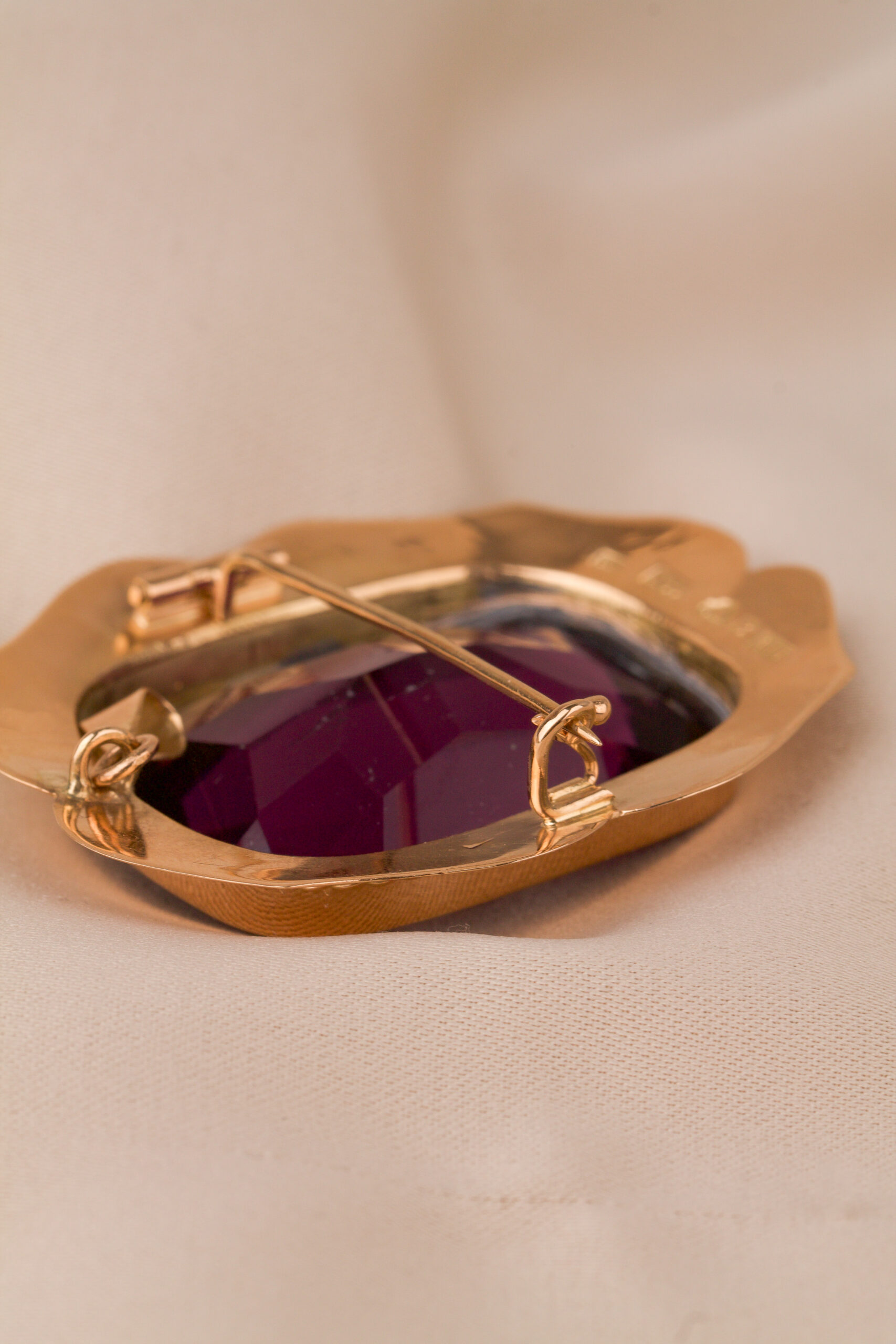 Unikt och dekorativt vintagehänge från 60-talet med en stor lila syntetisk spinell i fokus. Det här smycket är inte bara ett iögonfallande hänge utan kan även användas som brosch.