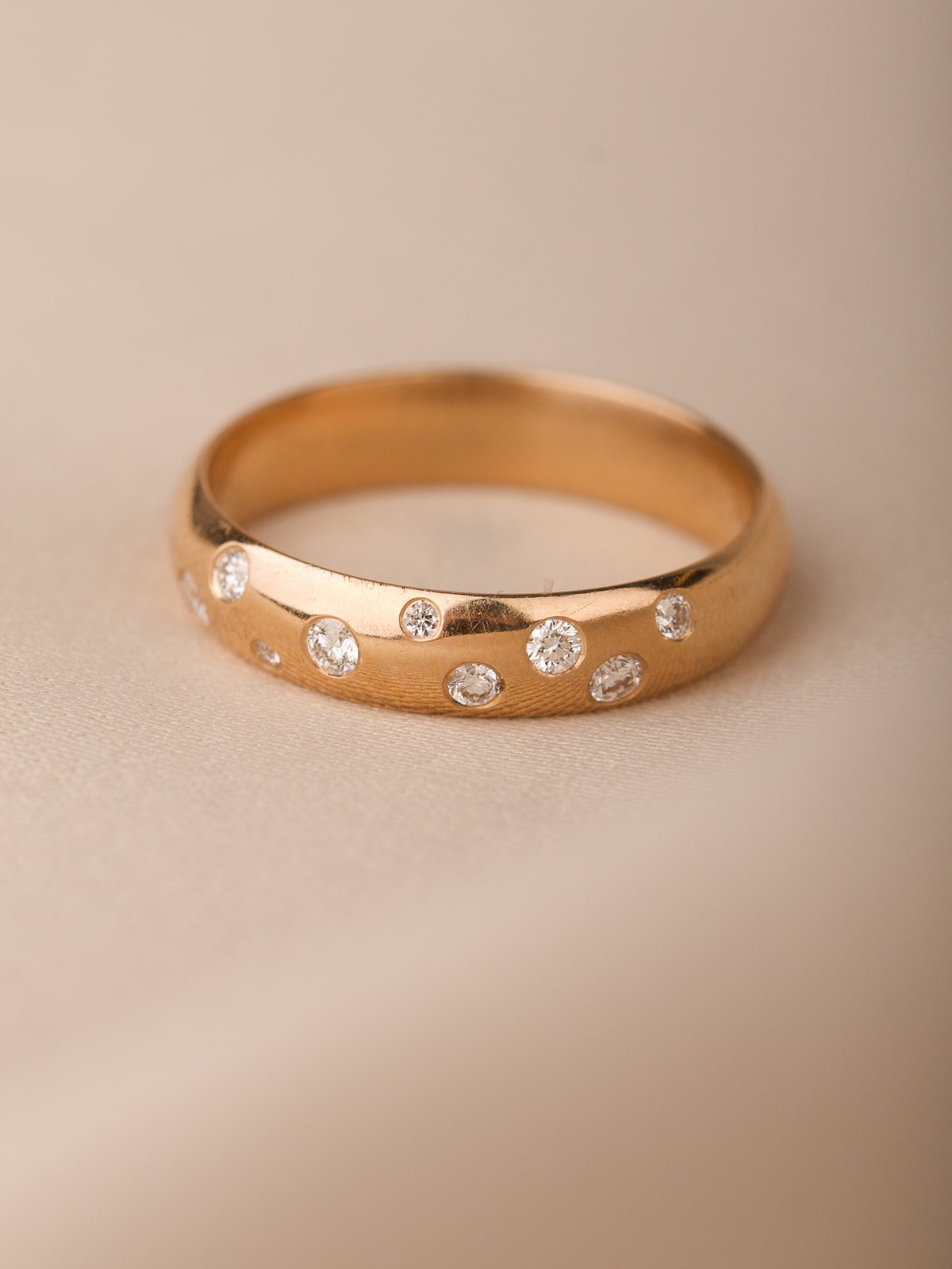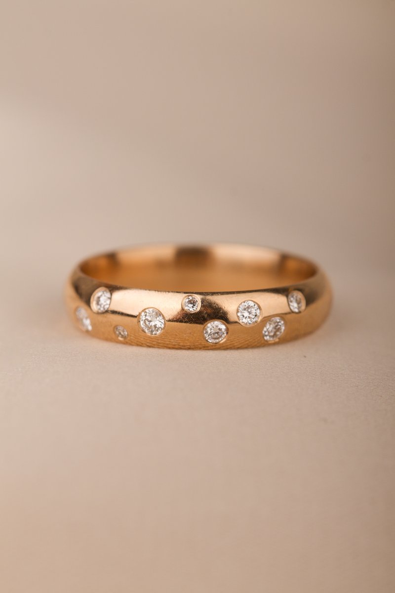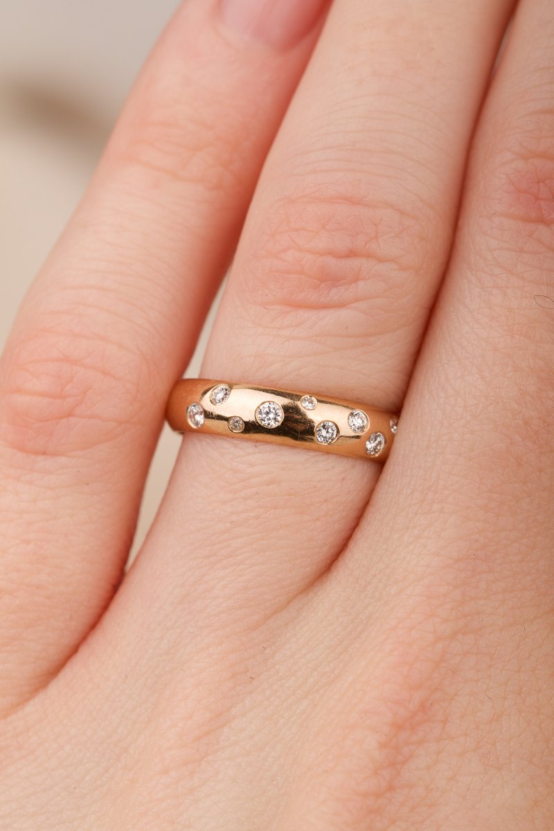 Söt guldring med diamanter glest placerade över skenan nästan som på en stjärnhimmel.