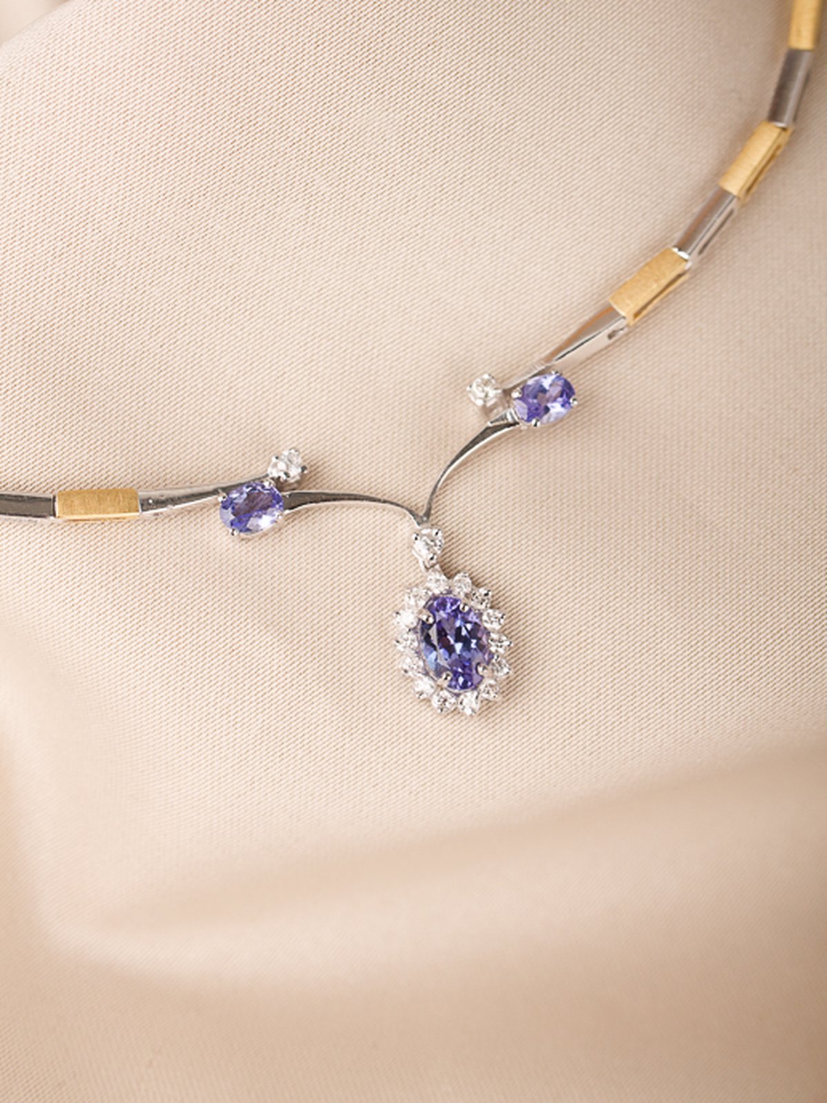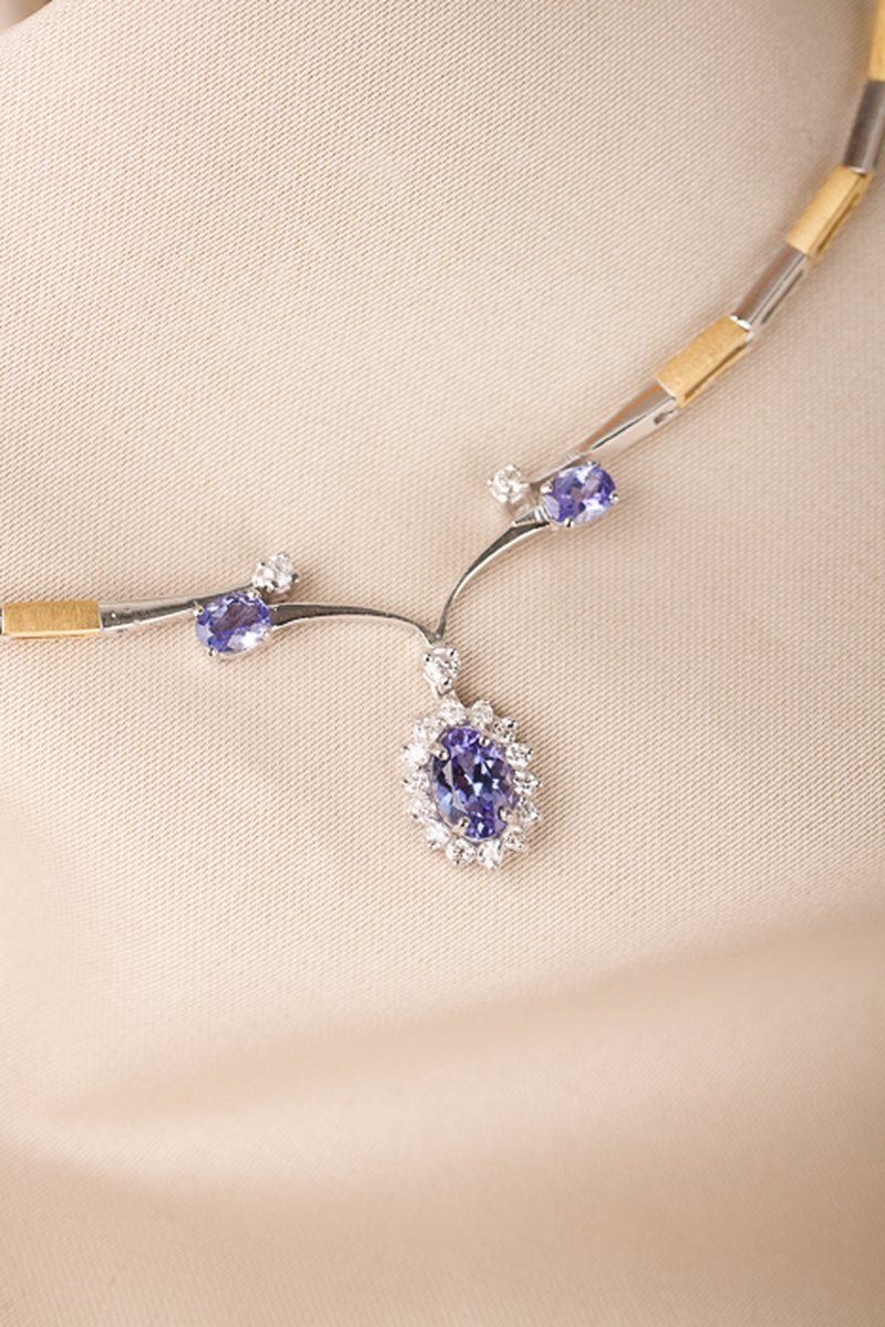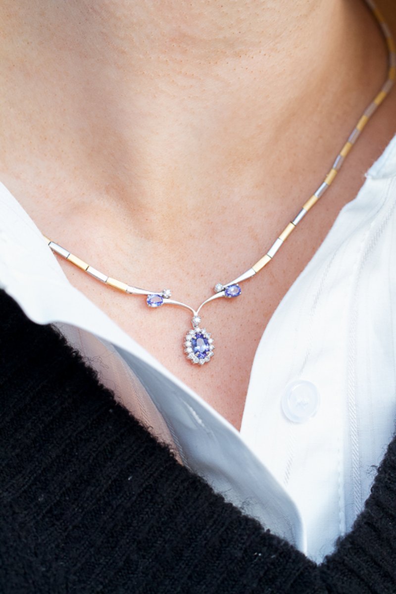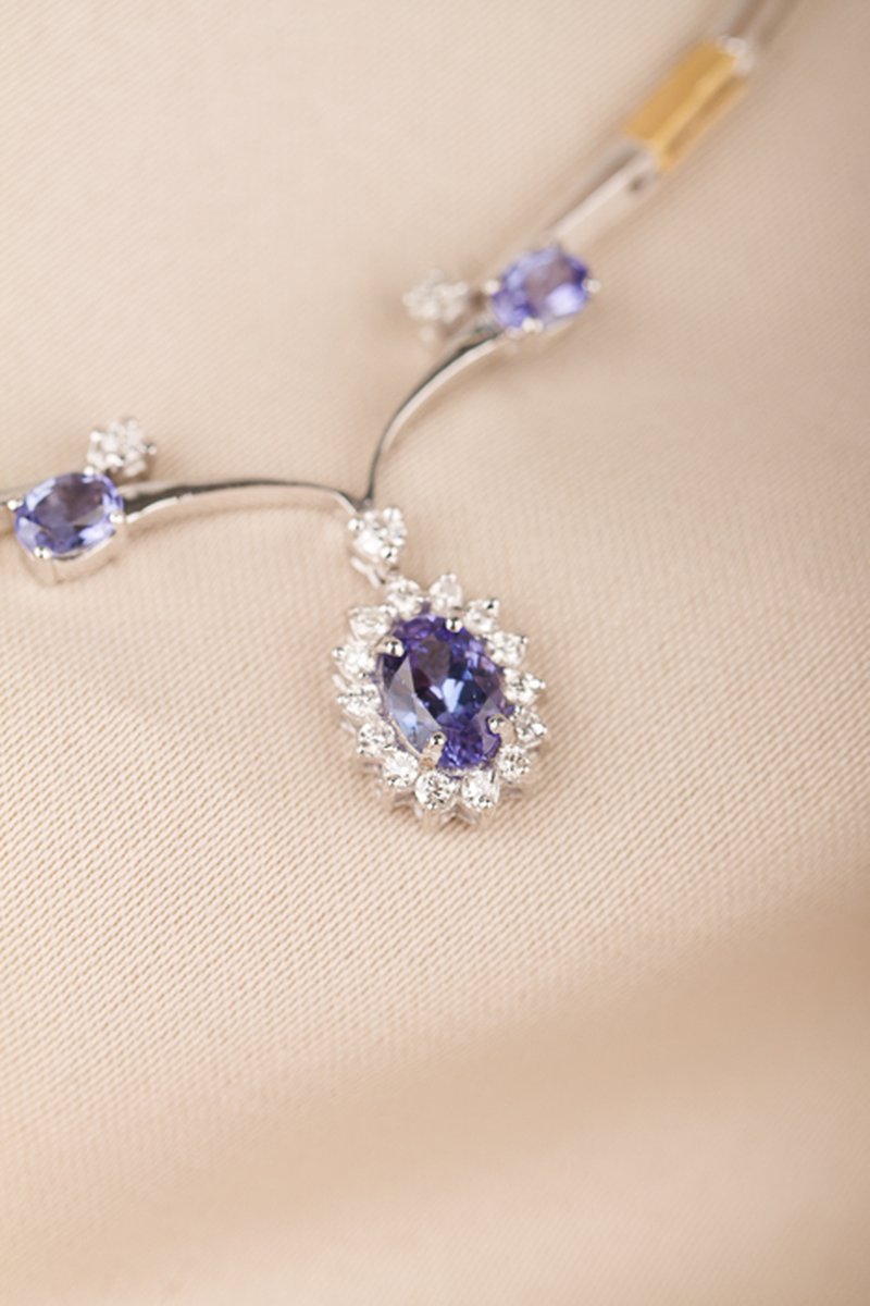 18K guld, Tanzaniter, 5,8 x 3,8 mm, 2 st á 4 x 3 mm. Briljanter 16 st totalt 0,21 ct.