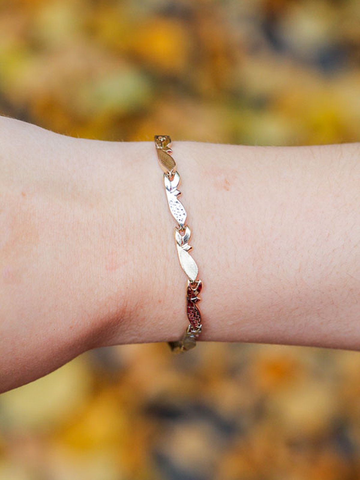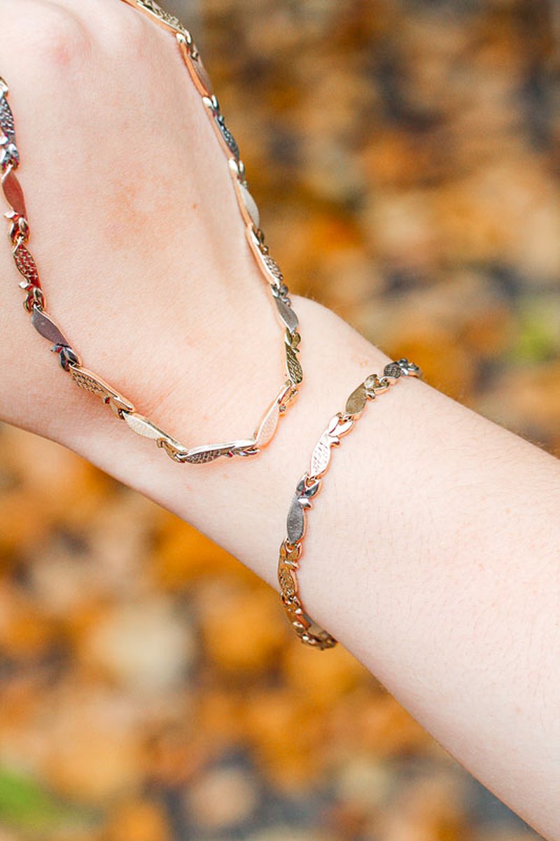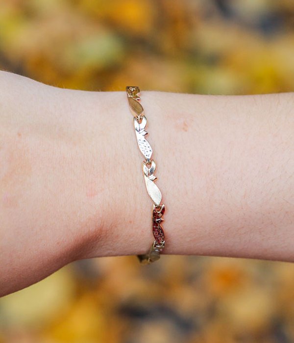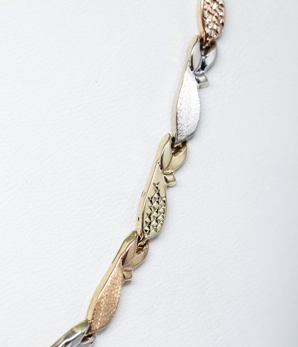 Vackert trefärgat armband med halvstela länkar. Gott skick på länkar och lås. Finns matchande halsband för 6950.-.