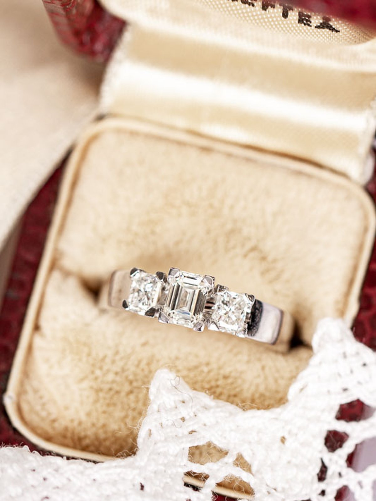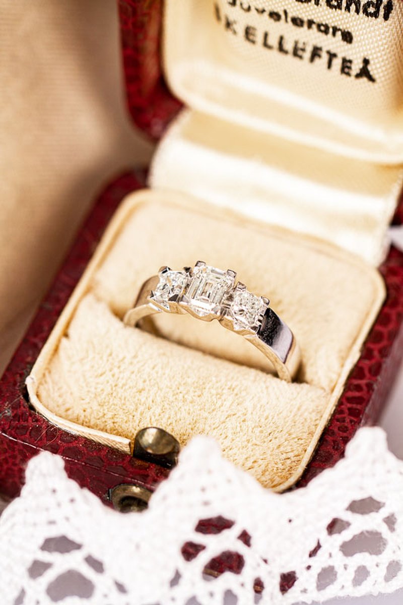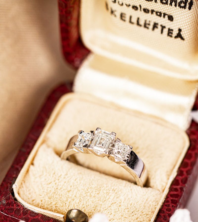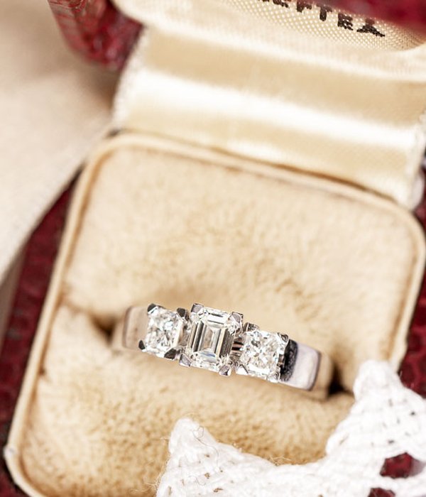 Fantastisk diamantring i vitguld med totalt 1,15 ct. Mittstenen är en baguetteslipad diamant på 0,55 ct med två 0,30 ct diamanter på var sida.