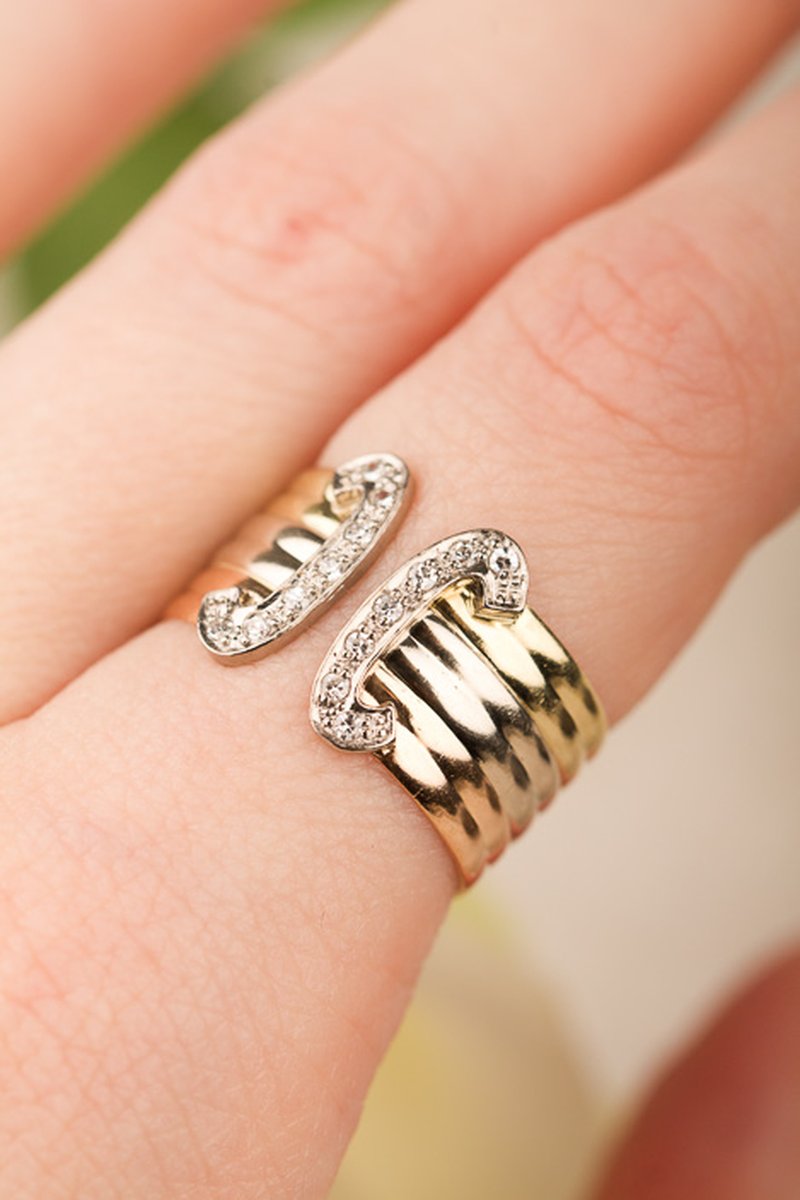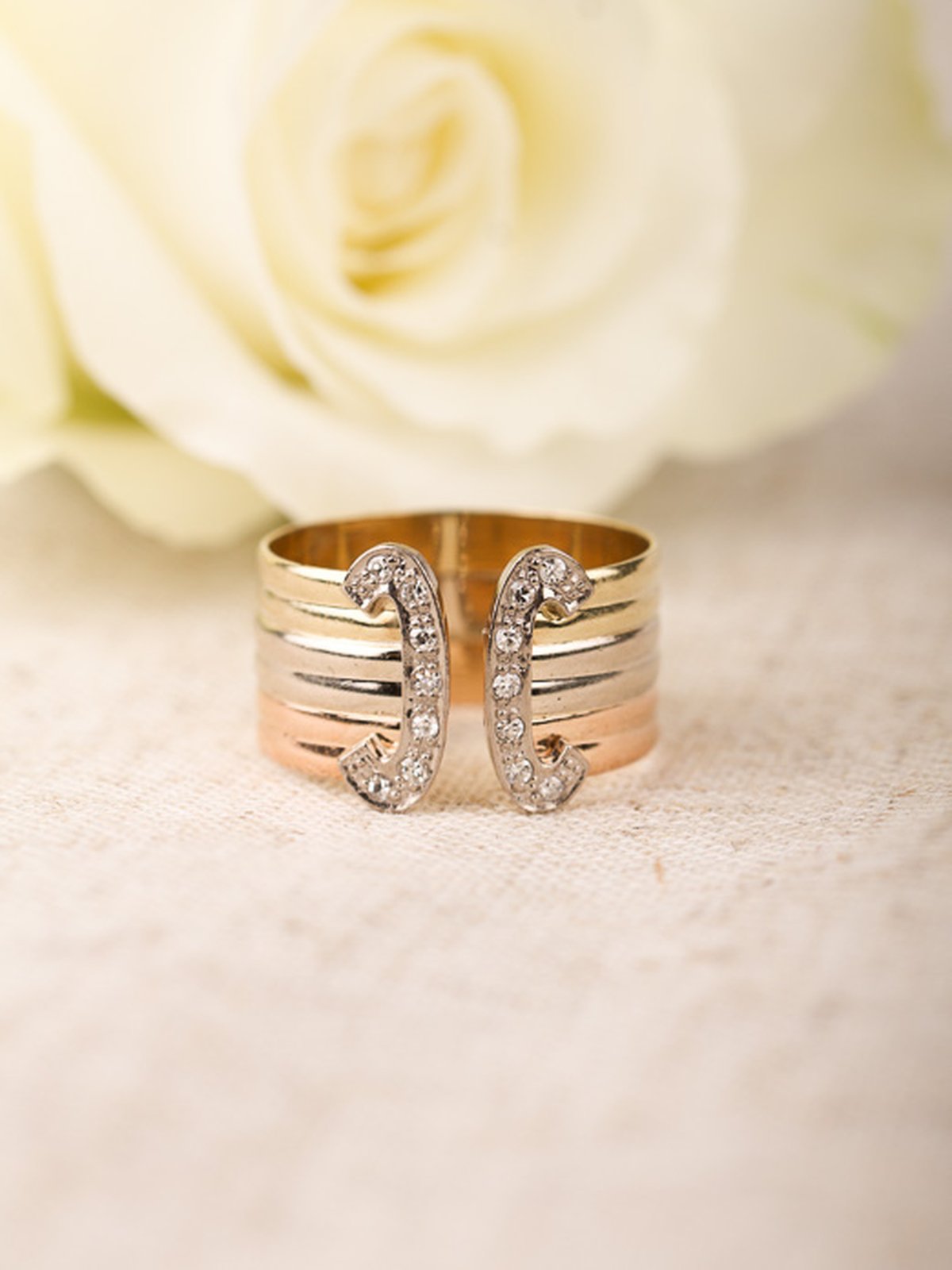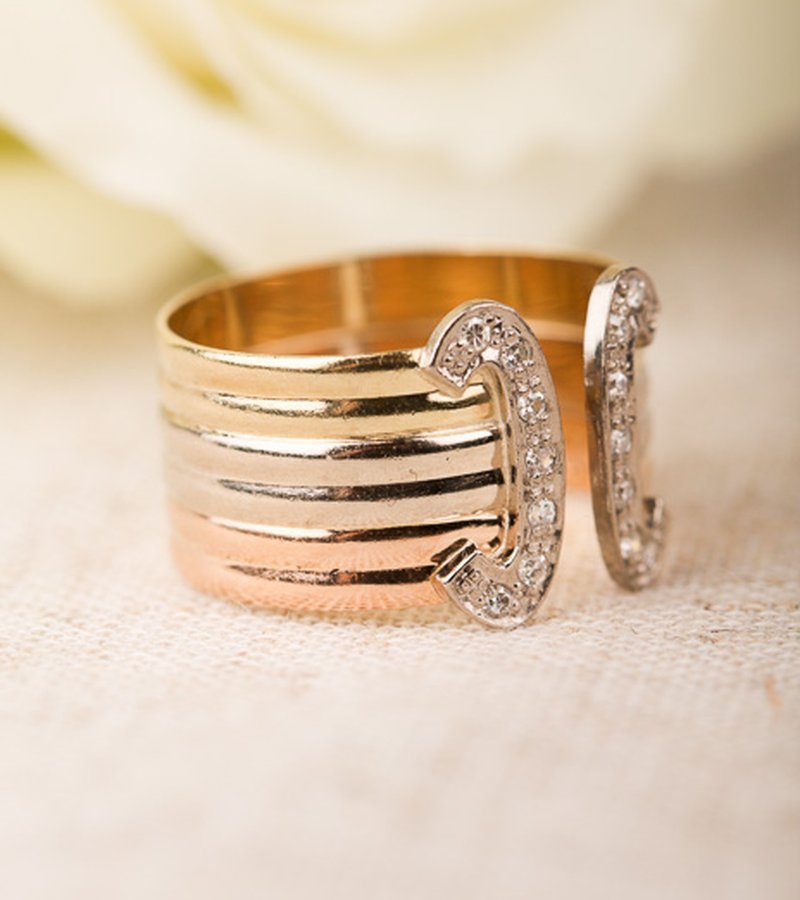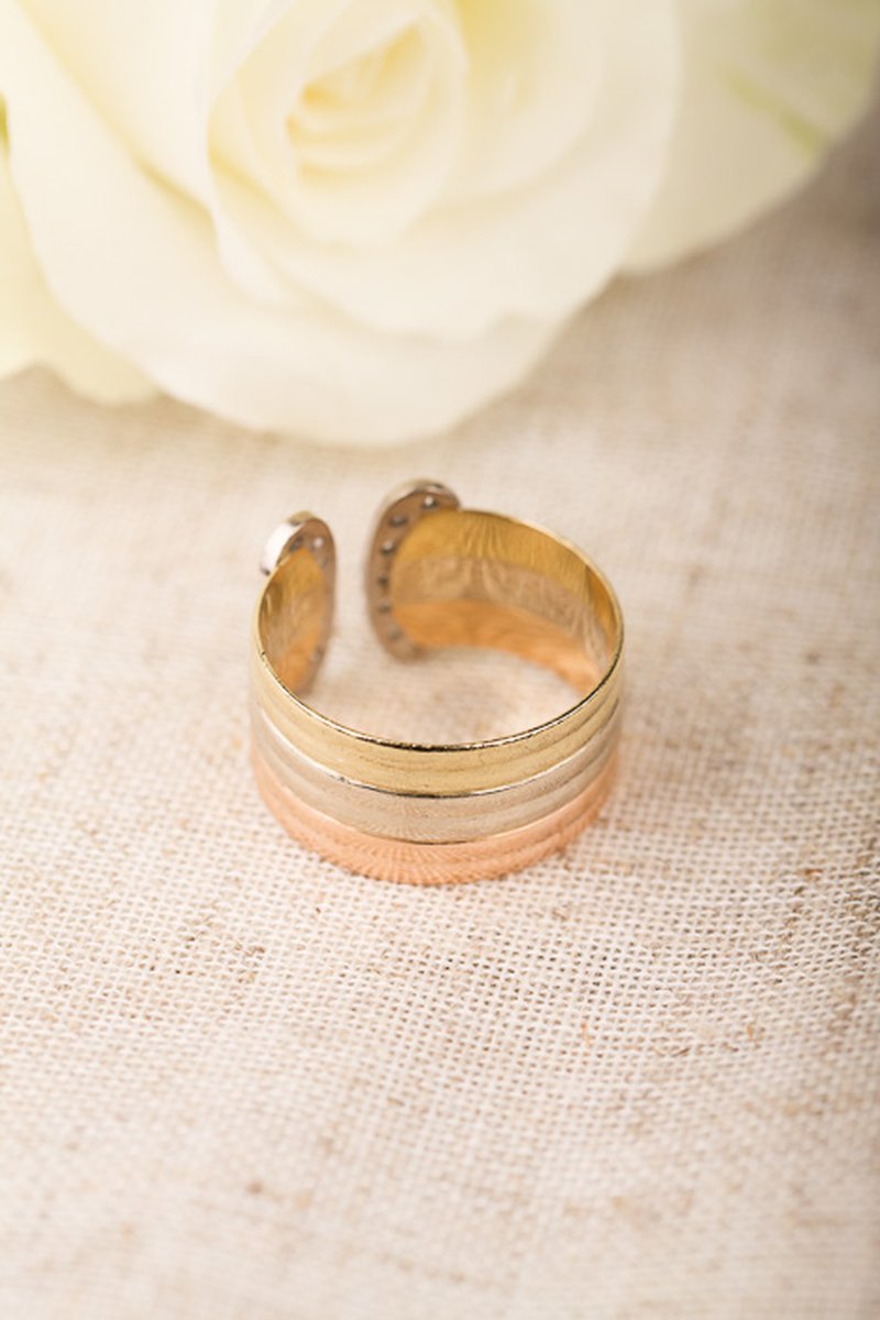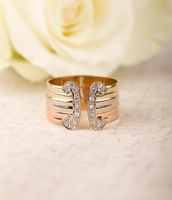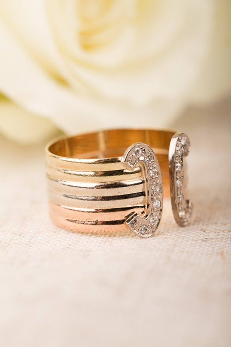 Välbehållen 80-talsring i vit- gul och roséguld.