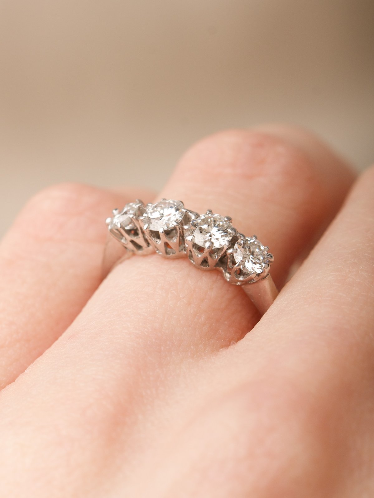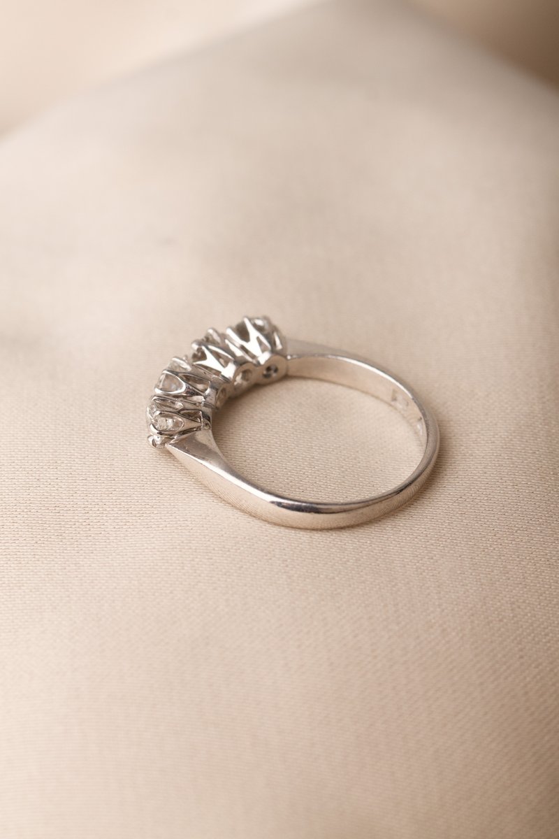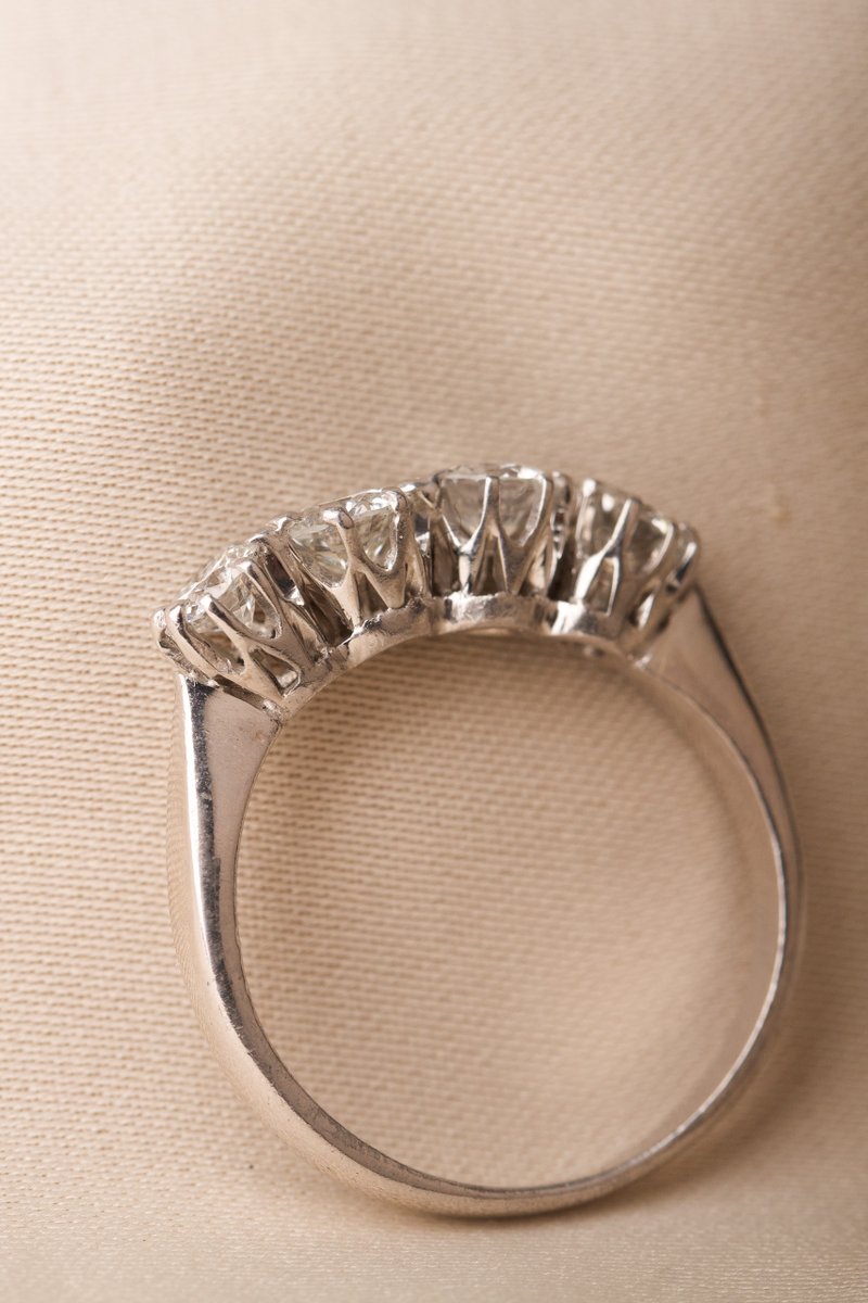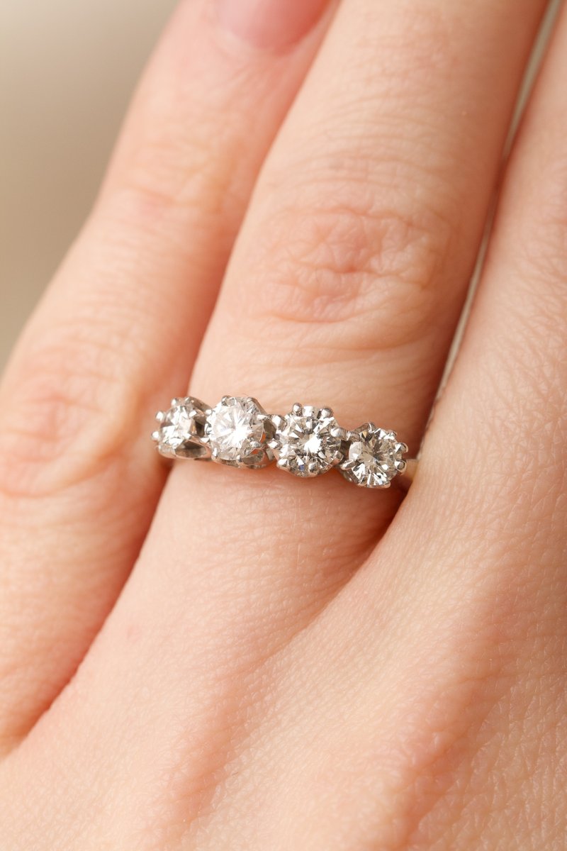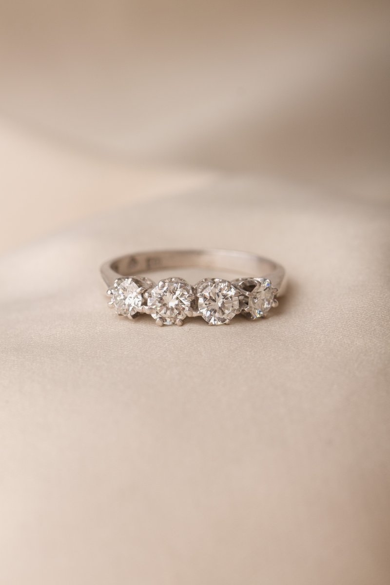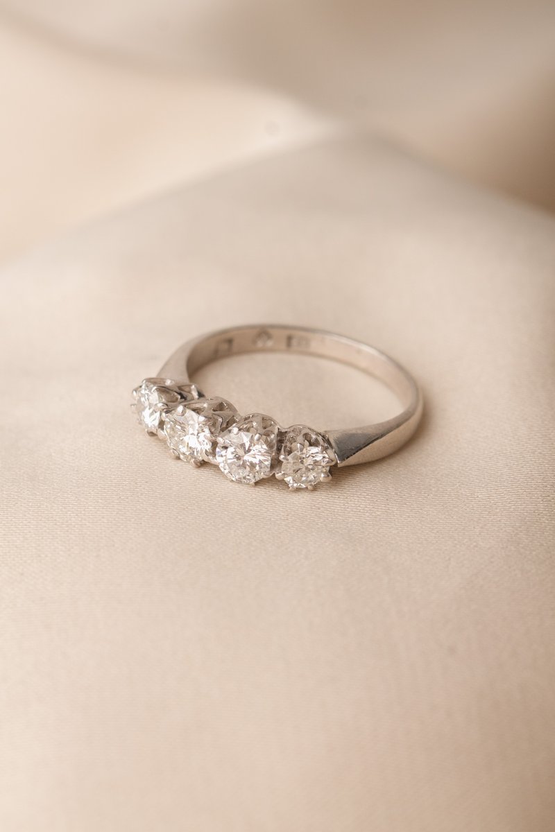 Ringen är infattad med fyra diamanter om totalt 0,86 ct, där varje sten sitter i välarbetade fattningar som ger ett fint ljusspel och ett stabilt, genomarbetat intryck. Utförandet speglar det gedigna hantverk som var typiskt för tiden och ger ringen en tydlig vintagekänsla.