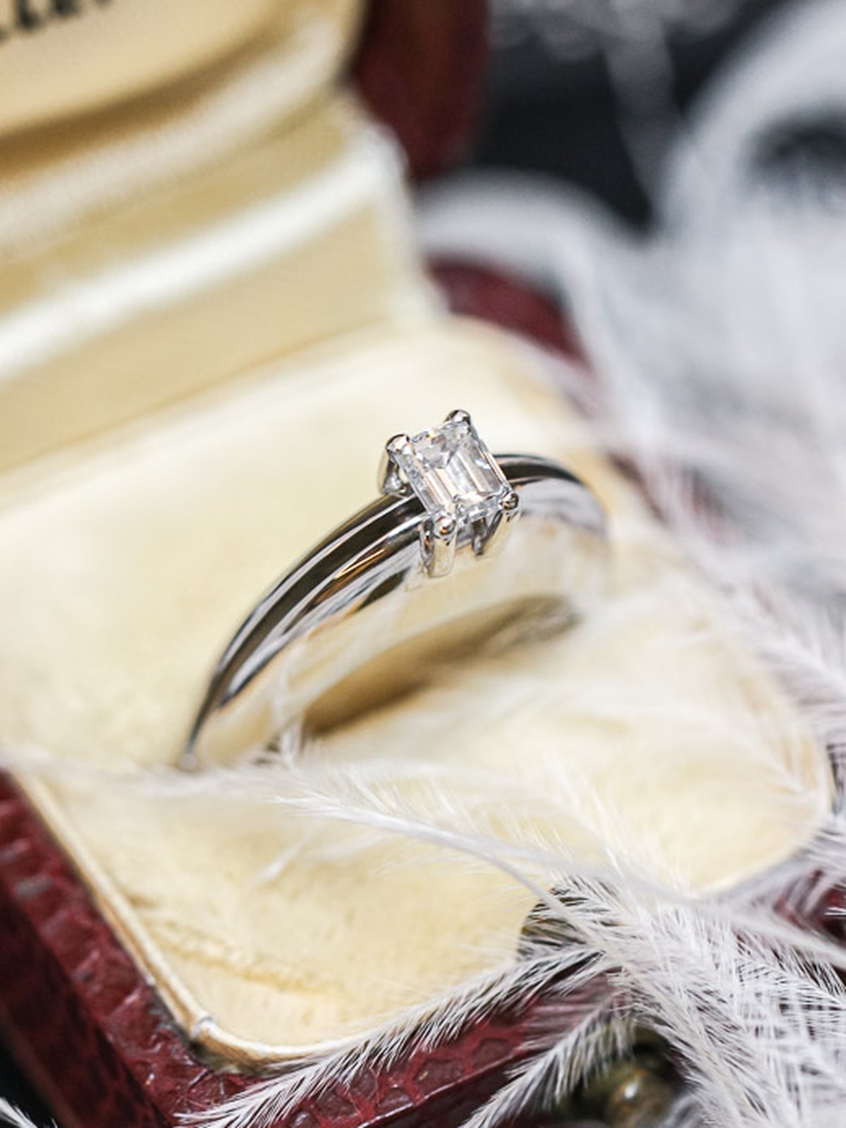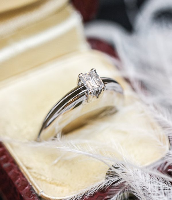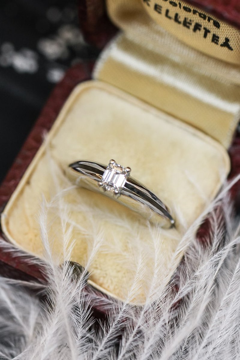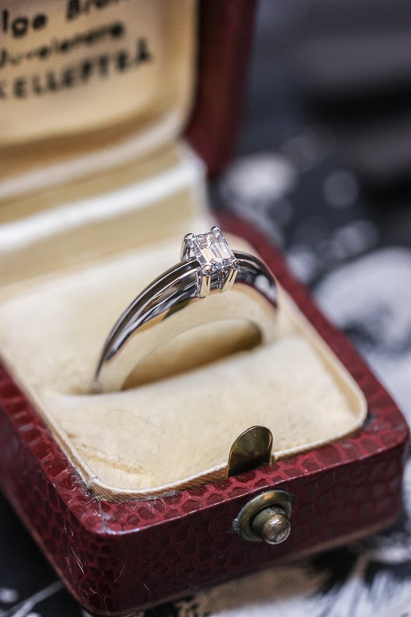 Unik solitärring med en mycket vacker, vit, baguetteslipad diamant. Uppskattningsvis ca 0,40ct. Ett riktigt kap för smyckesfantasten då denna ring inte finns i dussintals.