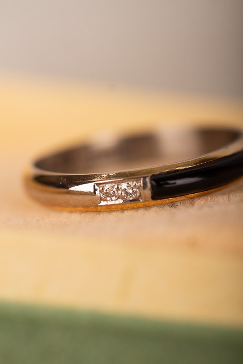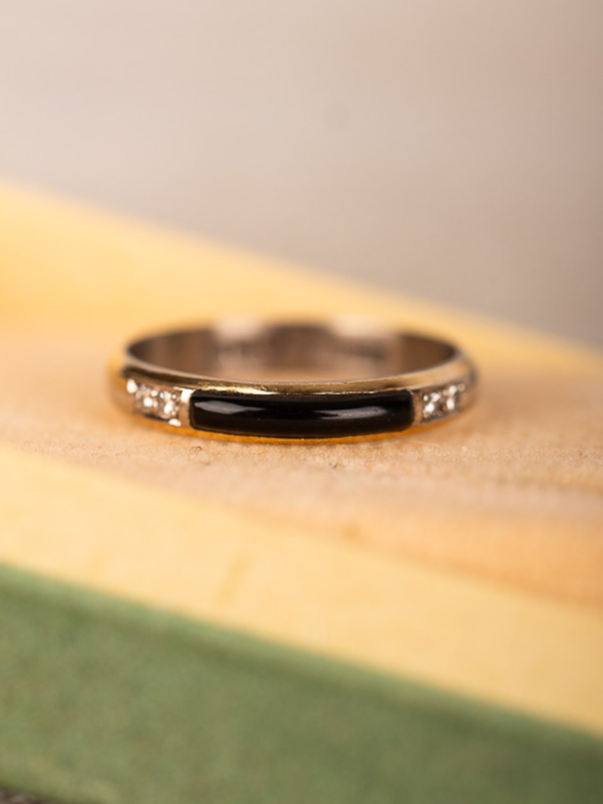Ovanlig ring tillverkad av Engelbert 1988. Skena i vitguld med rödguldsdetaljer, en avlång onyx i centrum med diamanter på sidorna.