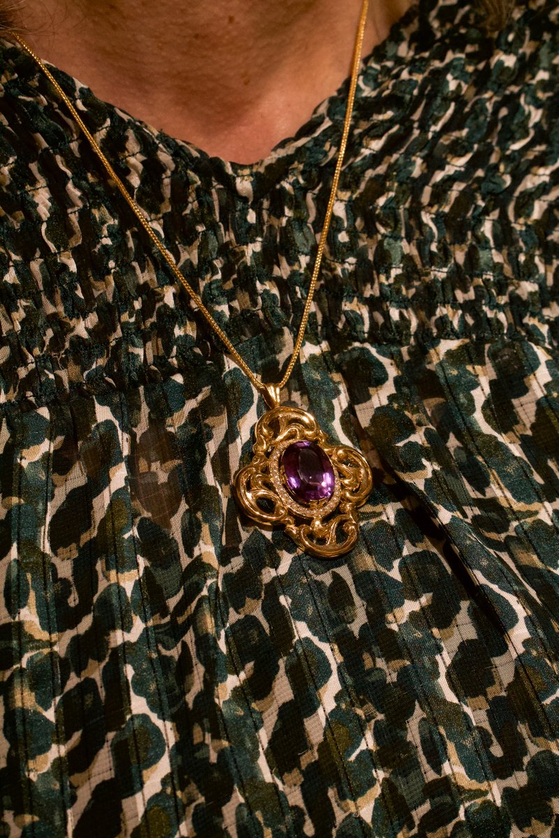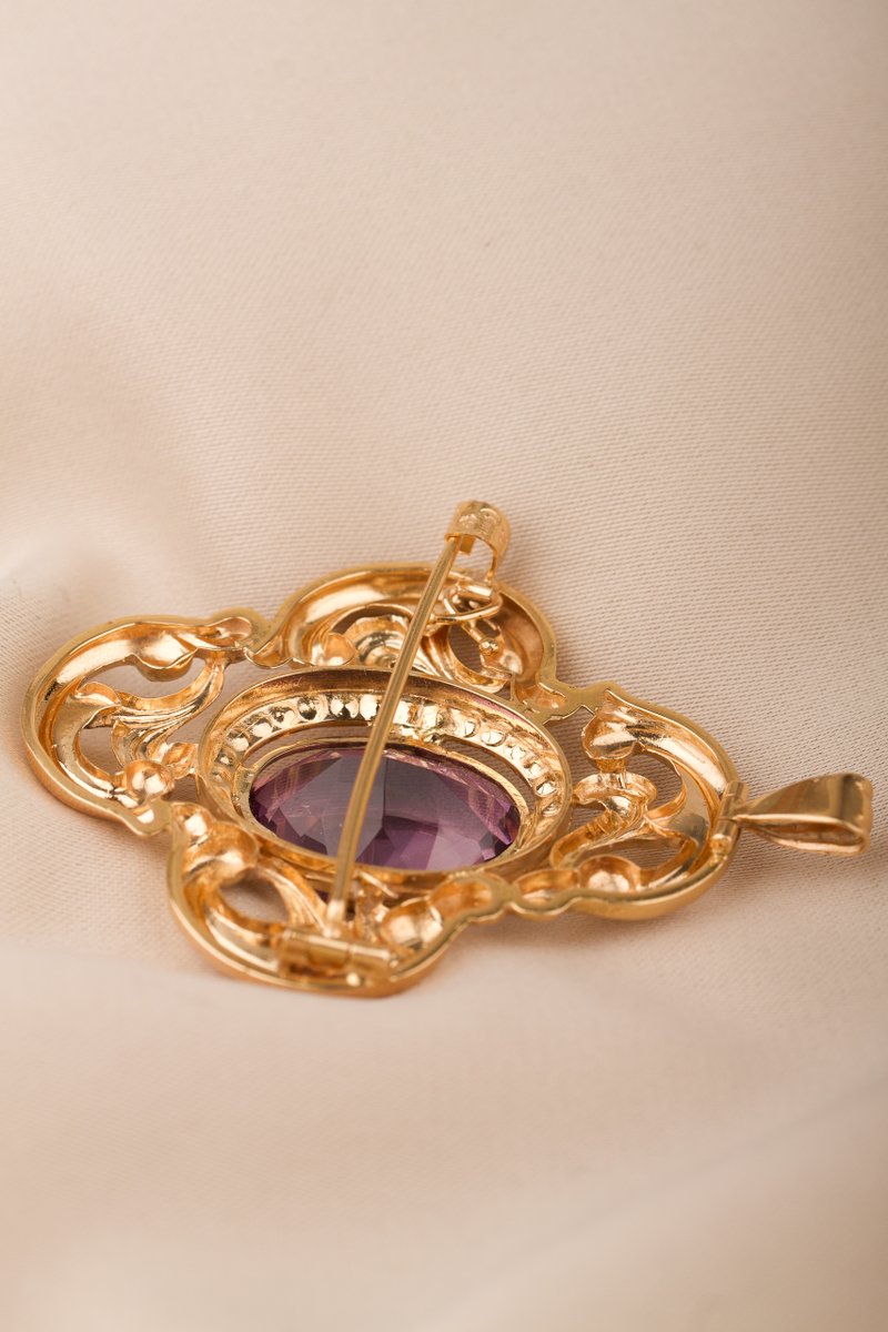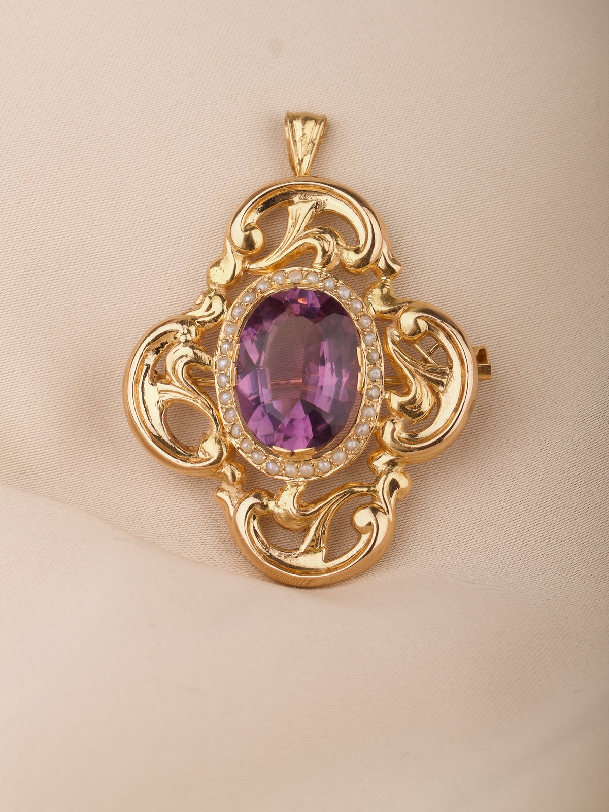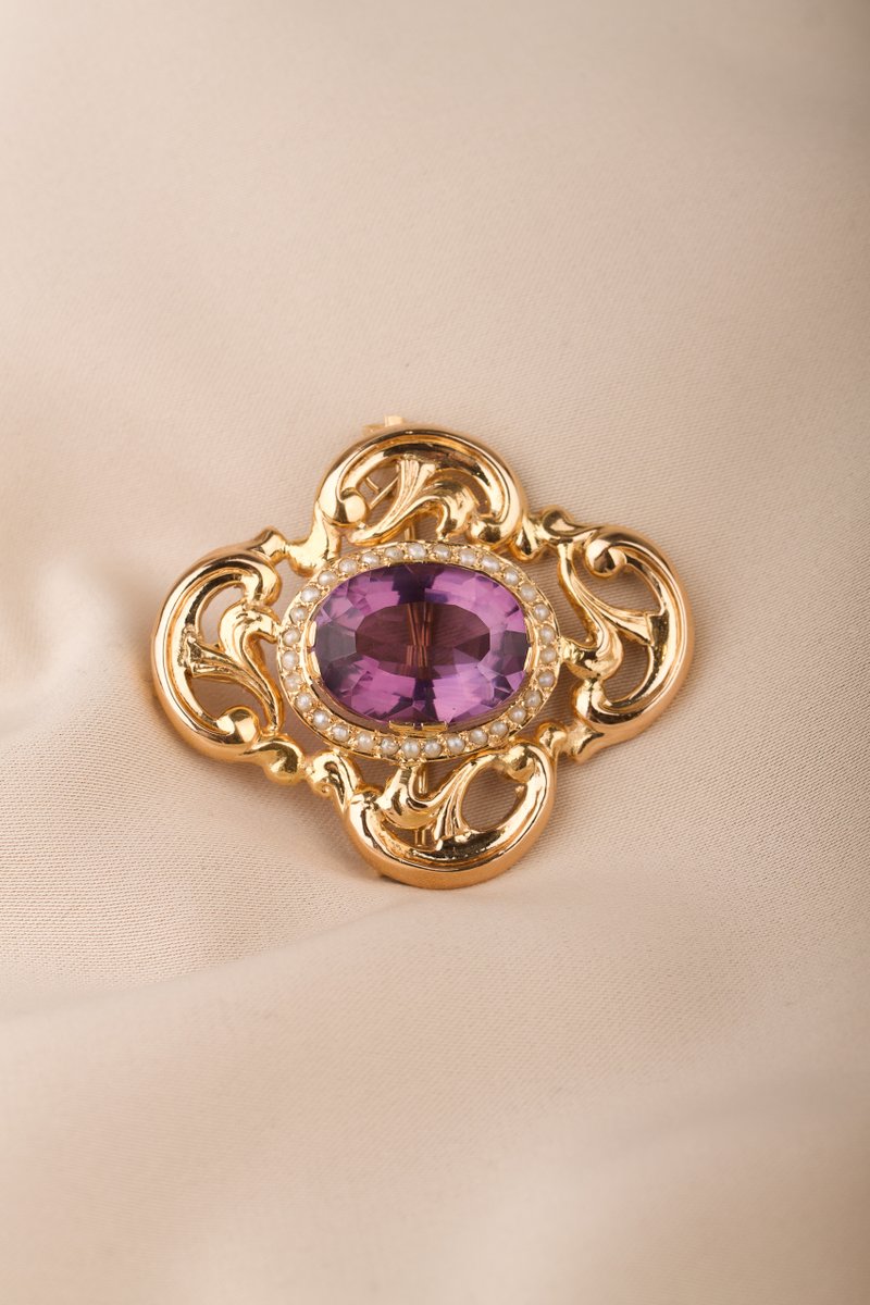 18K guld, ametist ca. 13 x 18 mm. Små odlade pärlor ca 1,5 mm