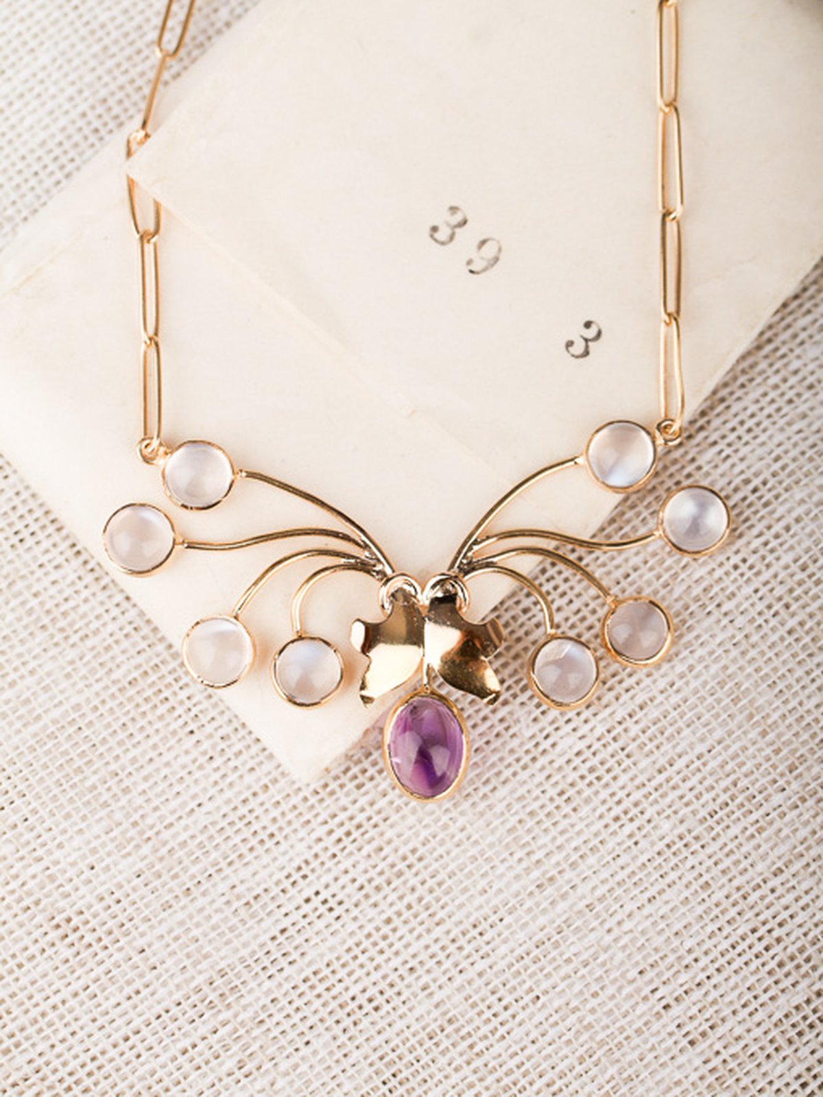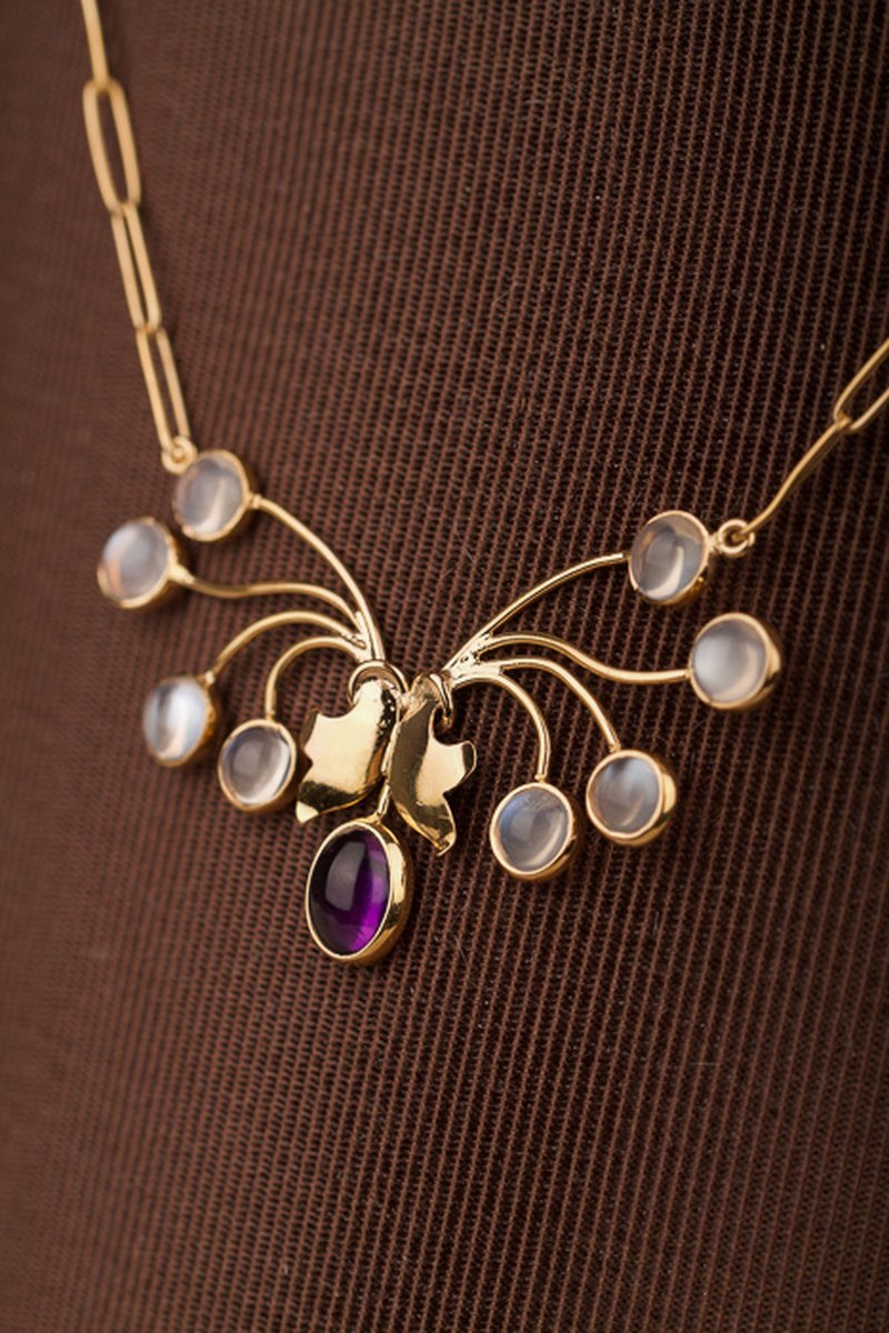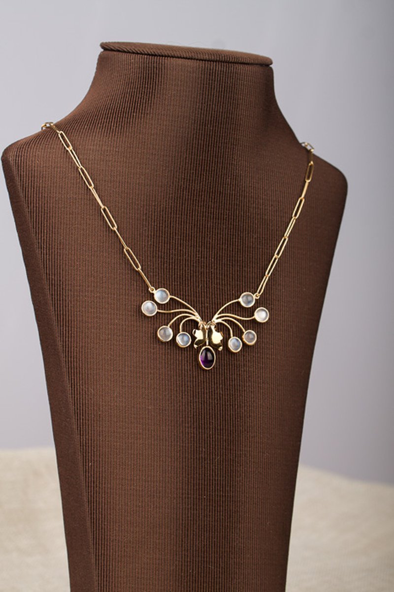 18K guld, en ametist 5,5 x 7 mm, åtta st månstenar ca 4,5 x 4,5 mm