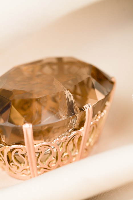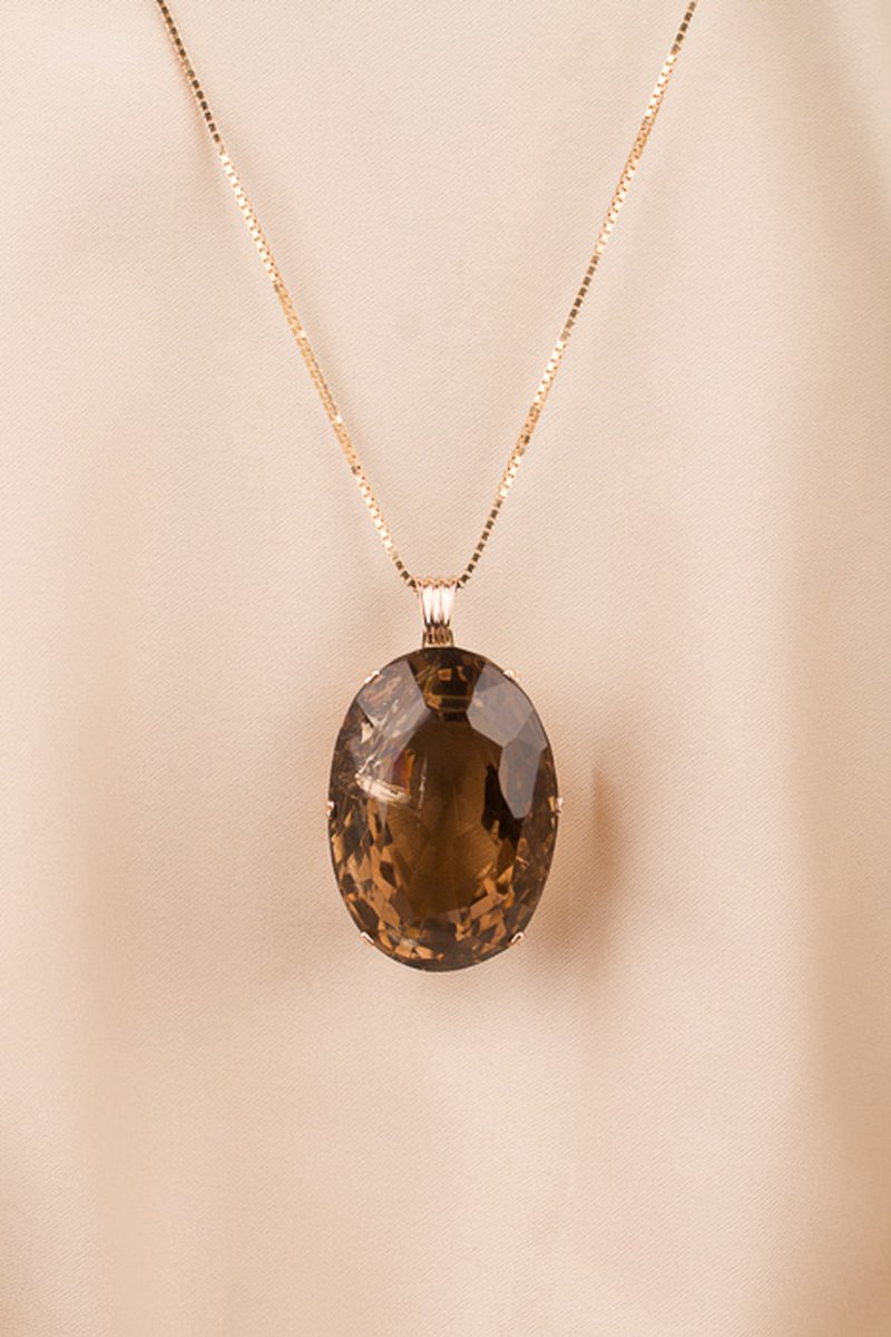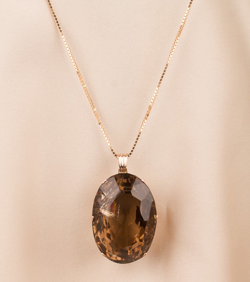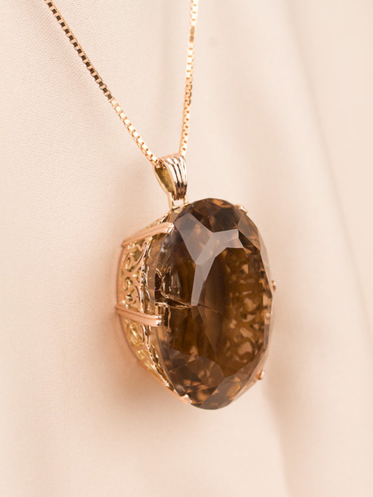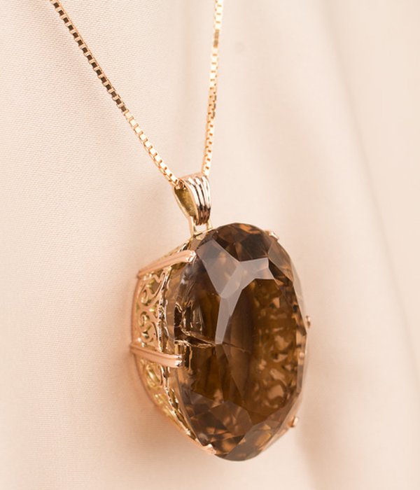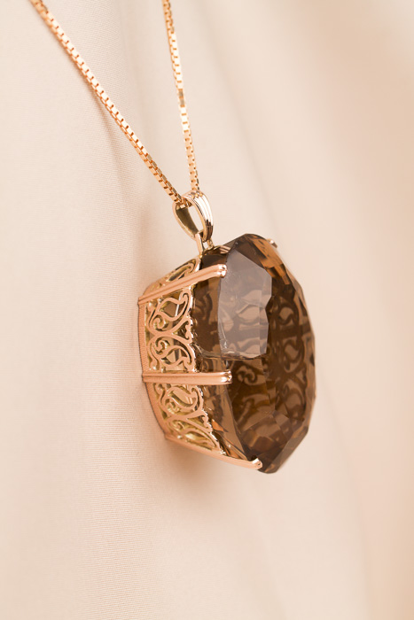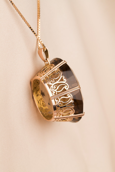 Helt enastående handgjort rökkvarts-hänge i guld. Se det fantastiska detaljarbetet som håller om den stora stenen.