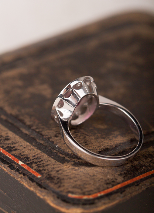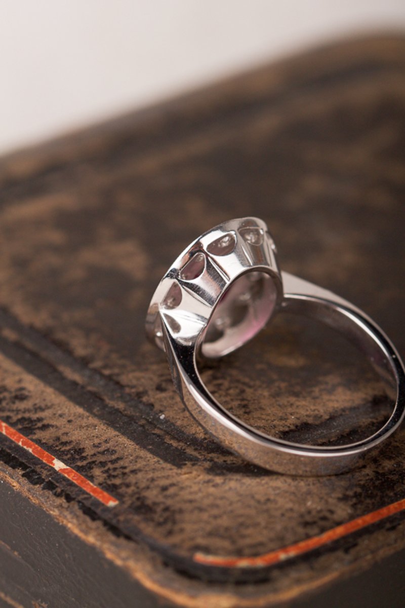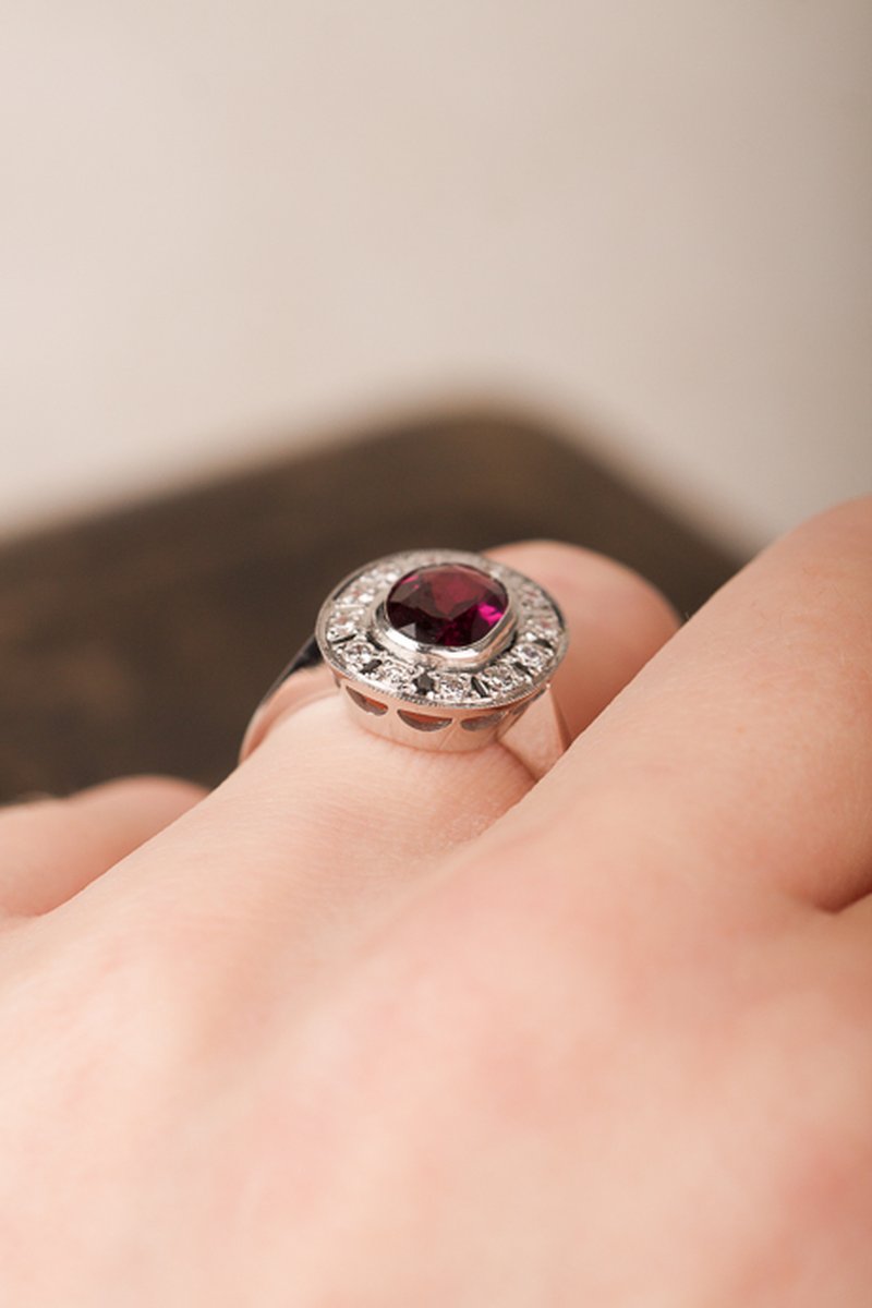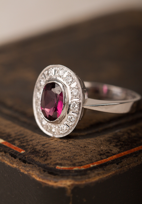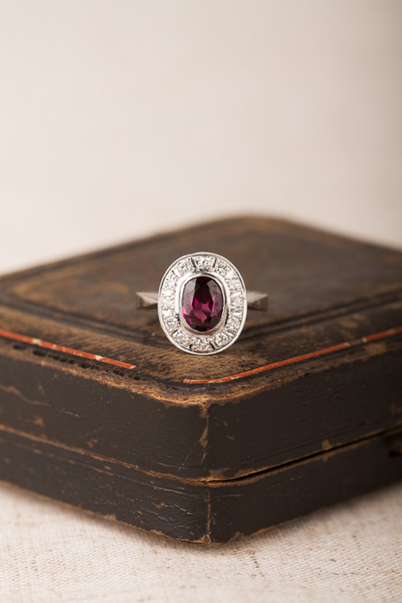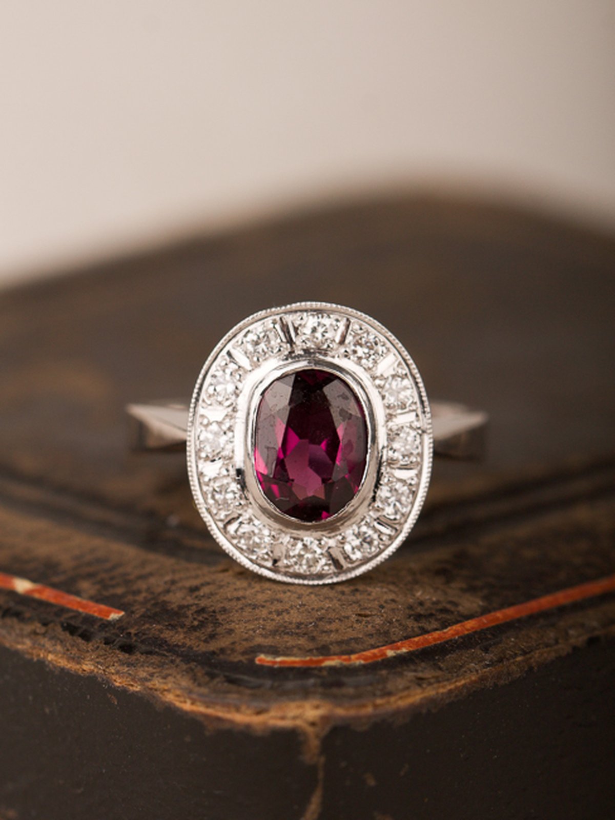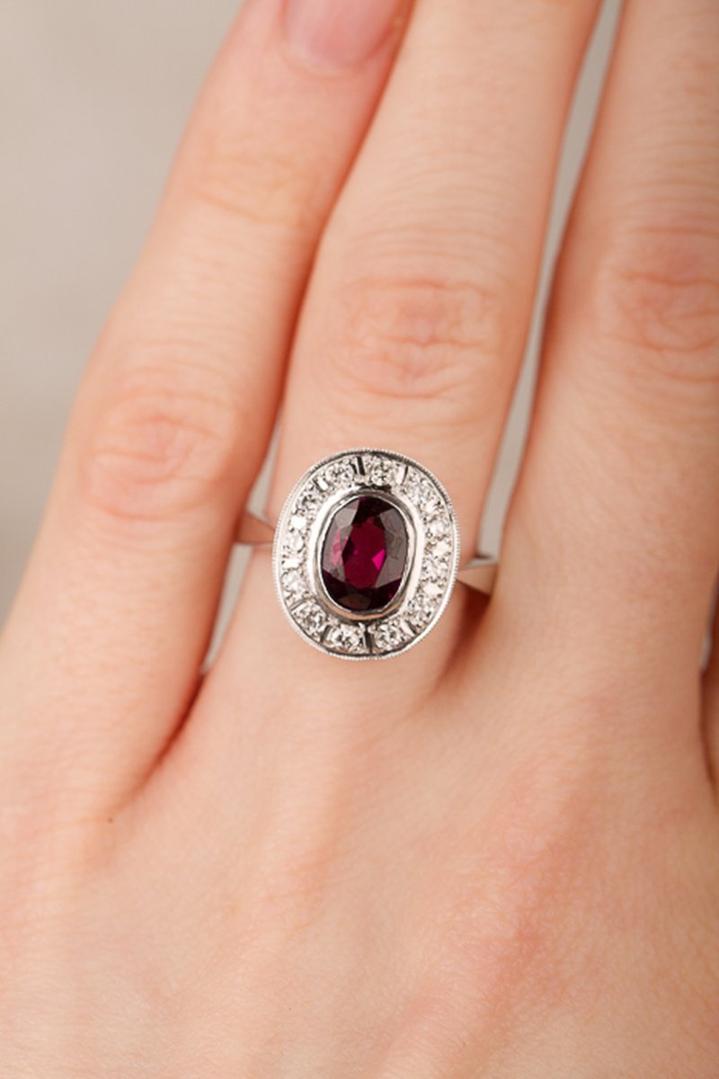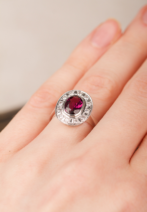 Lyxig oval carmouséring i vitguld med milligriffdetaljer. I centrum en mörk cerise almandin (En sorts granat) med briljanter runt om. Ringen ser nästan oanvänd ut.