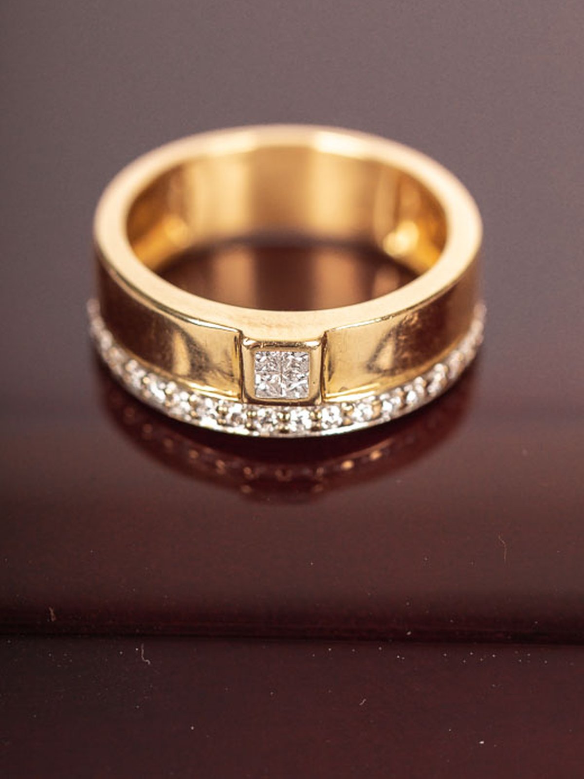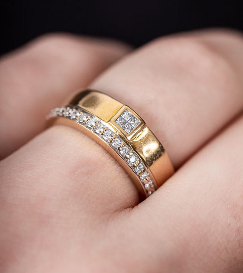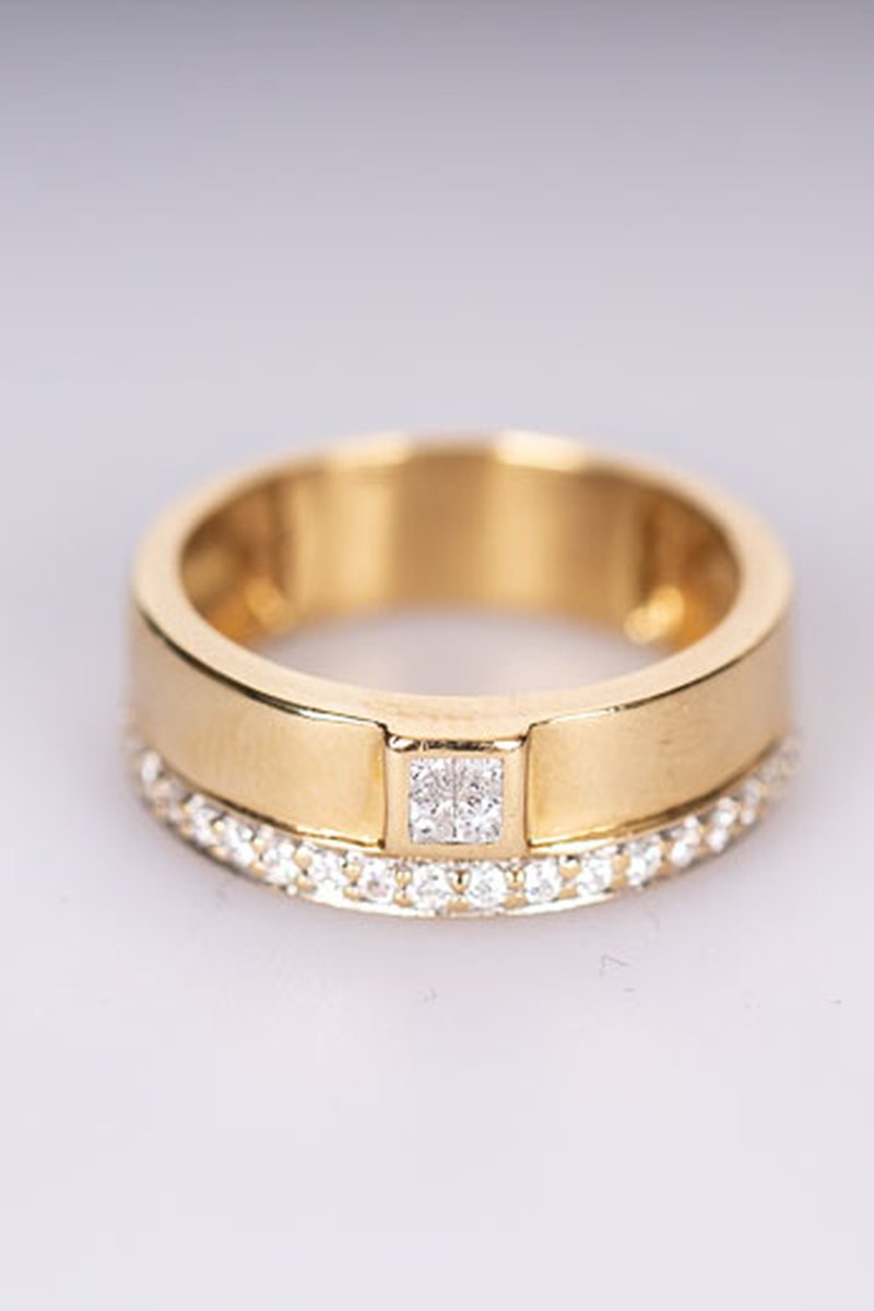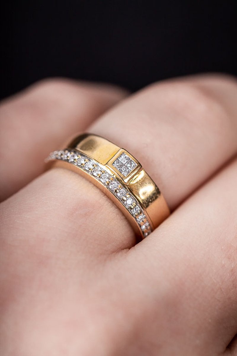 Kombination av solitär- och alliansring för dig som bara vill ha en ring. Totalt 0,28ct diamanter varav 0,08ct är prinsesslipade. En prinsesslipad diamant har spetsiga hörn och kvadratisk form.