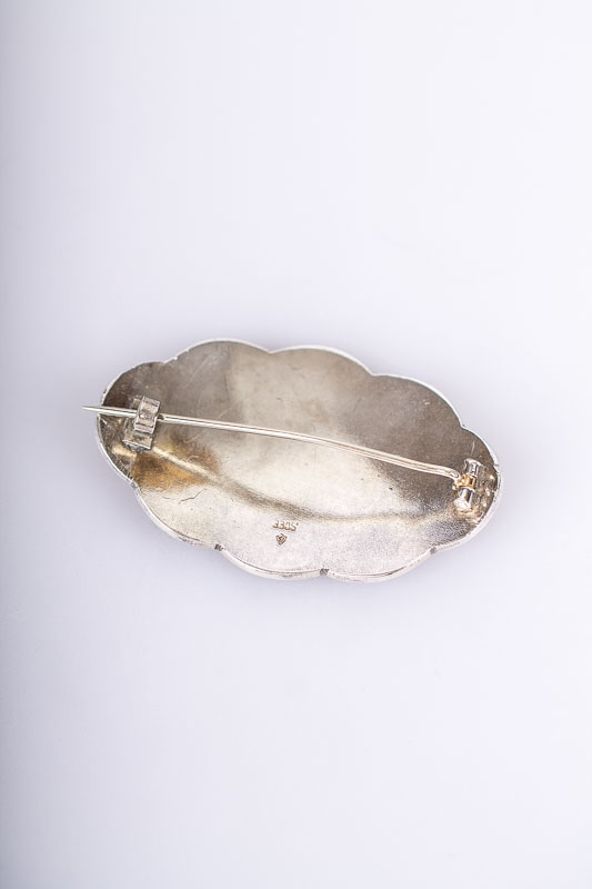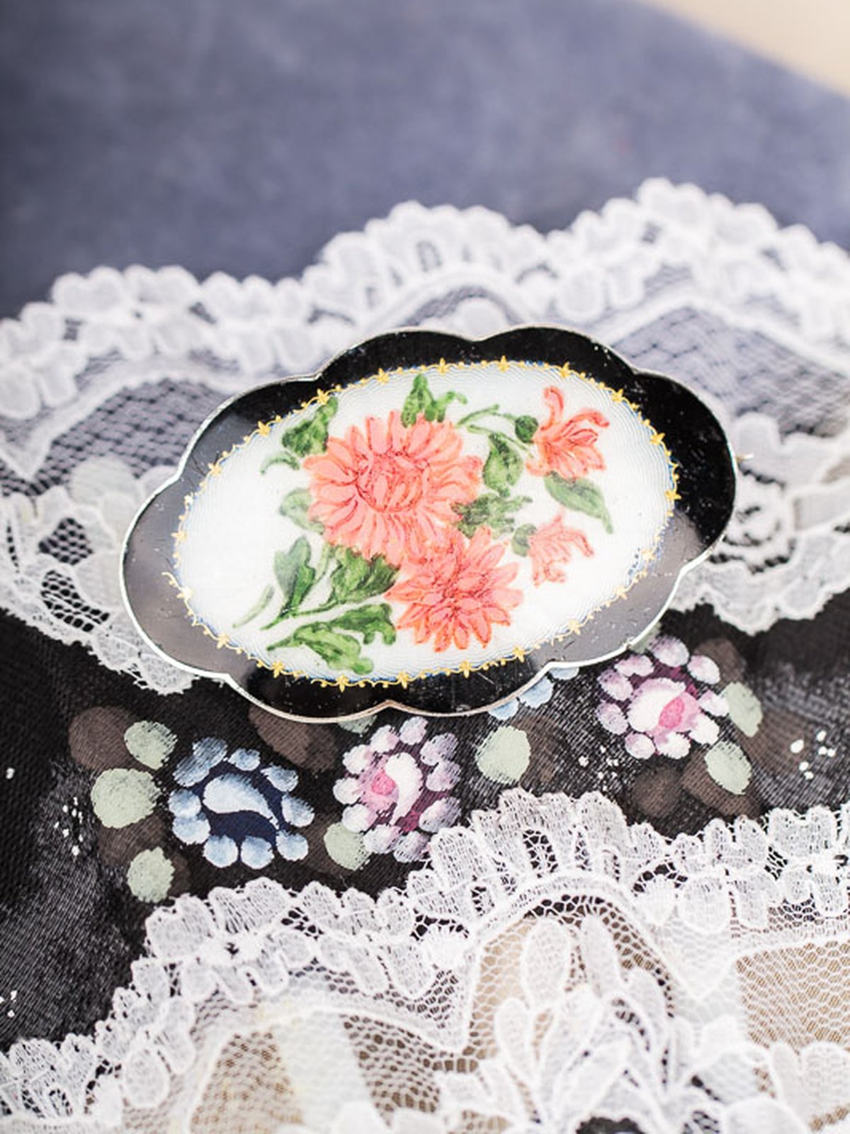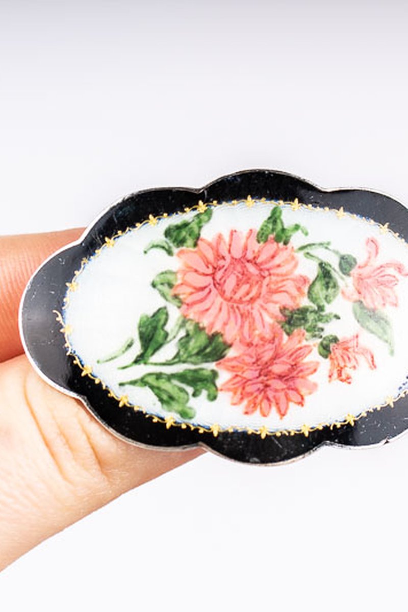 Underbar oval emalj-brosch med vackert blomster-mönster.