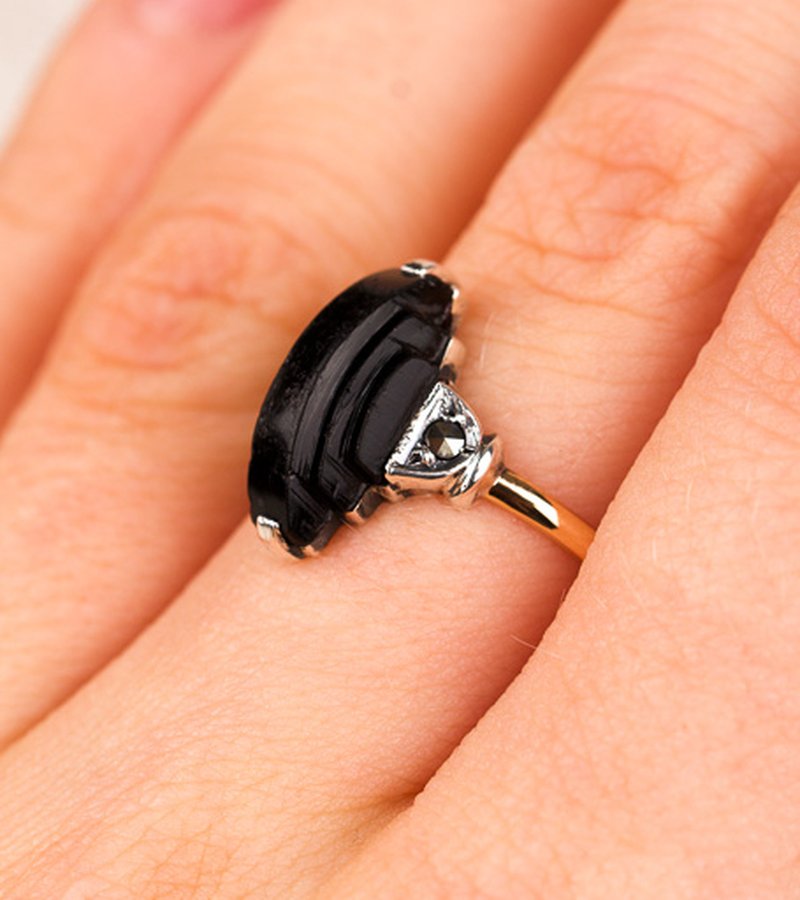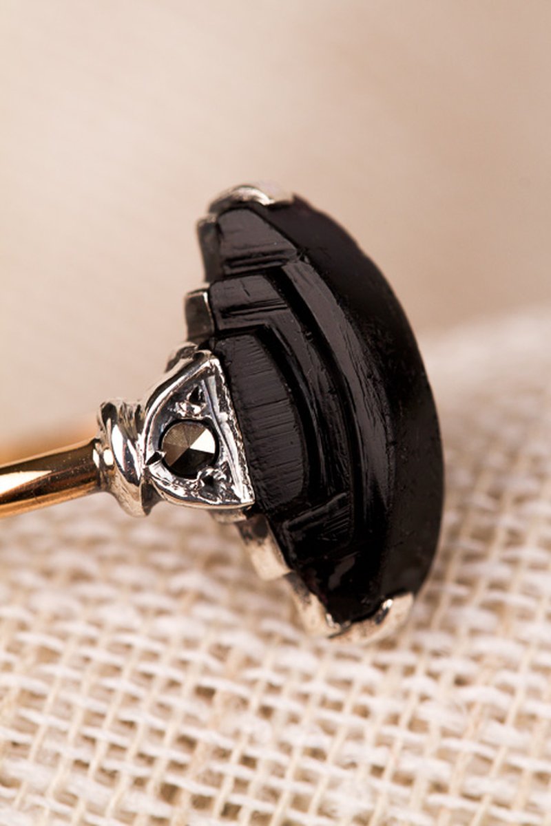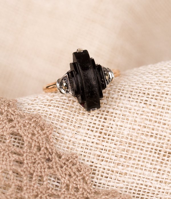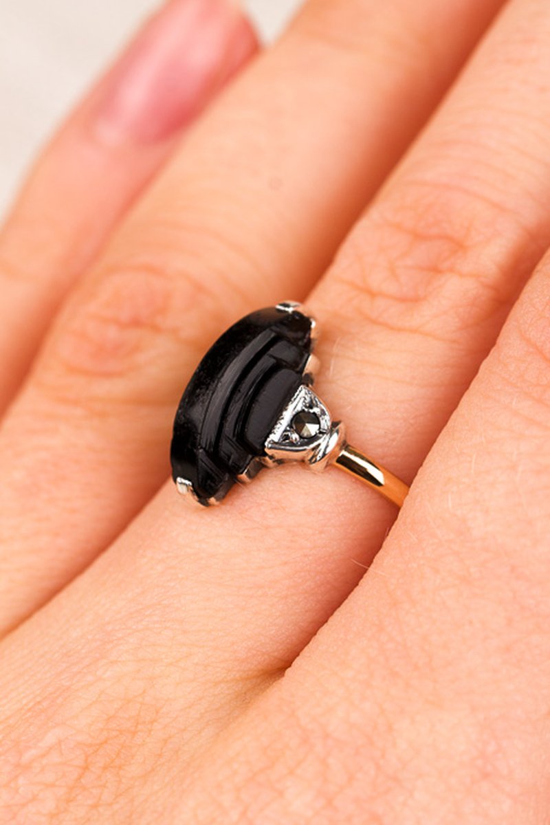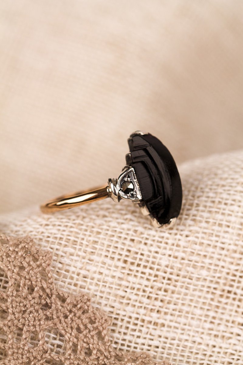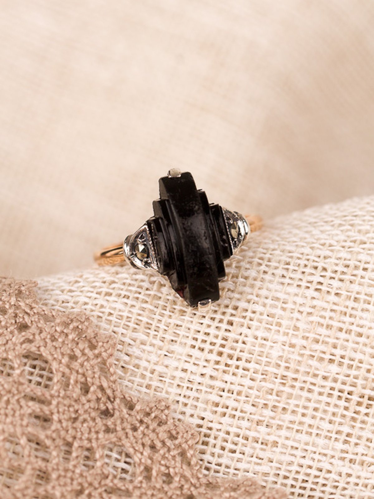 Underbar gammal vintage-ring med en svart onyx i centrum. Onyxen och markastierna är silverinfattade och ringskenan är tillverkad i 18K guld.